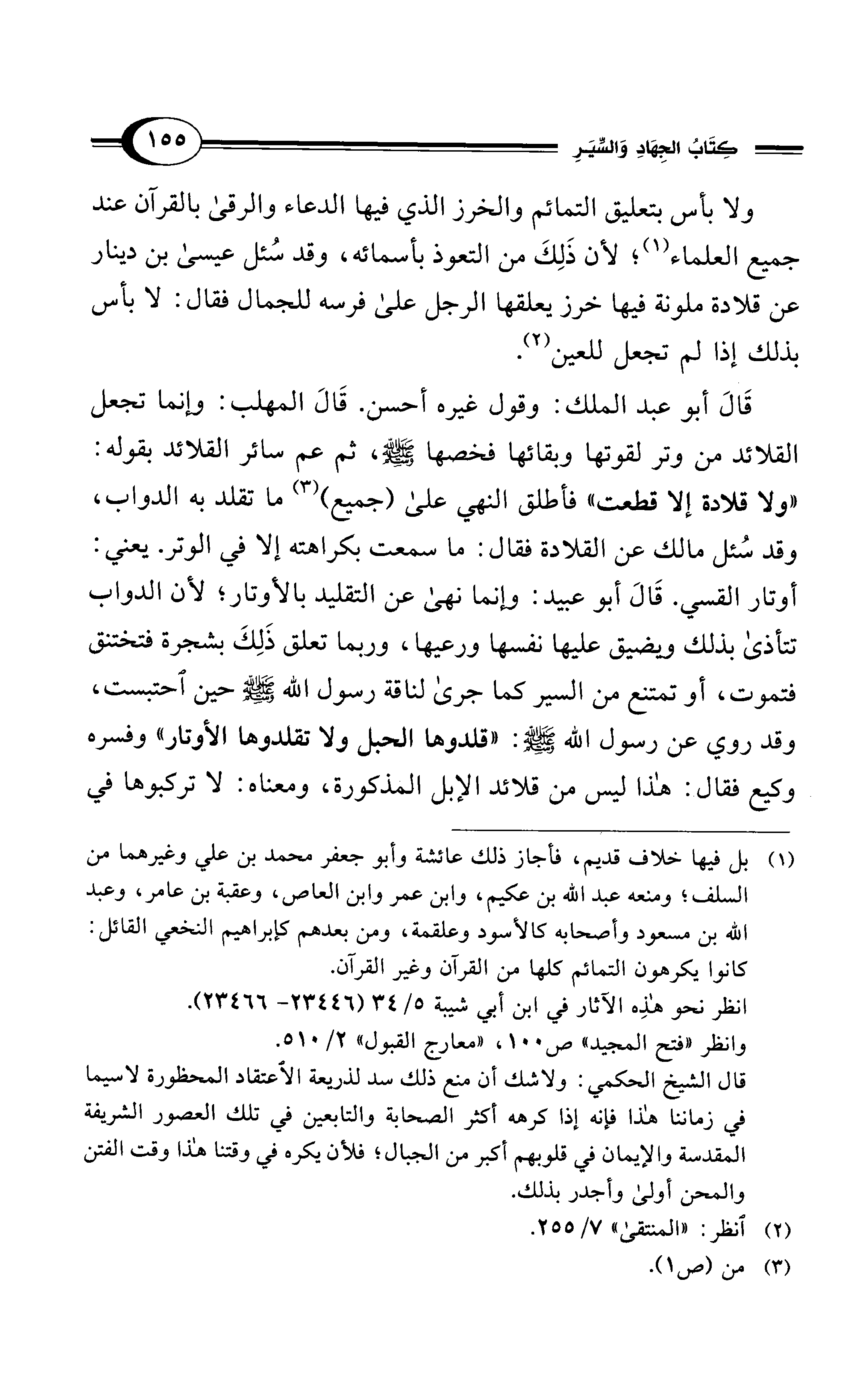 قَالَ أبو عبد الملك: وقول غيره أحسن. قَالَ المهلب: وإنما تجعل القلائد من وتر لقوتها وبقائها فخصها - صلى الله عليه وسلم -، ثم عم سائر القلائد بقوله: "ولا قلادة إلا قطعت" فأطلق النهي على (جميع) (¬3) ما تقلد به الدواب، وقد سُئل مالك عن القلادة فقال: ما سمعت بكراهته إلا في الوتر. يعني: أوتار القسي. قَالَ أبو عبيد: وإنما نهى عن التقليد بالأوتار؛ لأن الدواب تتأذى بذلك ويضيق عليها نفسها ورعيها، وربما تعلق ذَلِكَ بشجرة فتختنق فتموت، أو تمتنع من السير كما جرى لناقة رسول الله - صلى الله عليه وسلم - حين احتبست، وقد روي عن رسول الله - صلى الله عليه وسلم -: "قلدوها الحبل ولا تقلدوها الأوتار" وفسره وكيع فقال: هذا ليس من قلائد الإبل المذكورة، ومعناه: لا تركبوها في