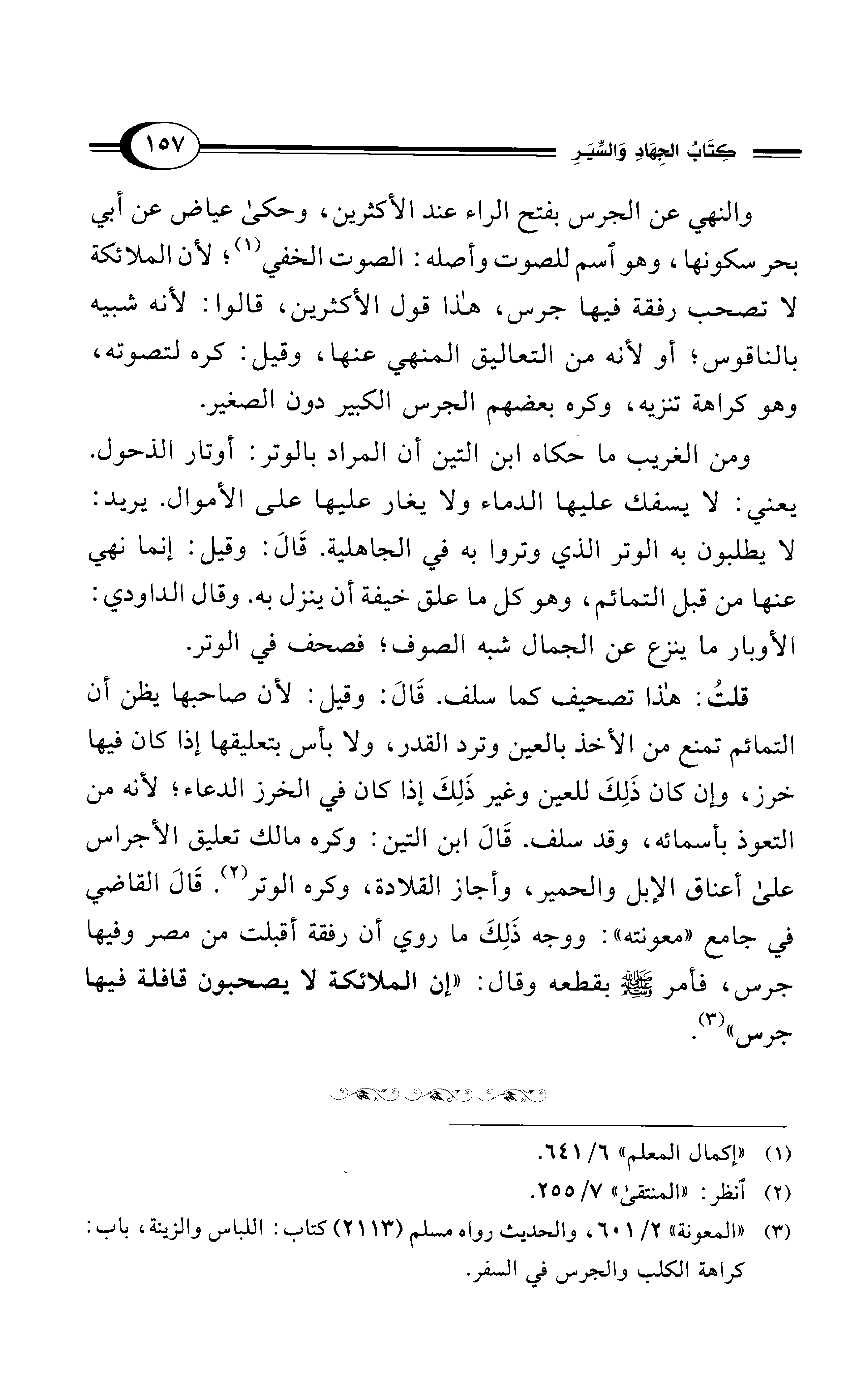 (¬3) "المعونة" 2/ 601، والحديث رواه مسلم (2113) كتاب: اللباس والزينة، باب: كراهة الكلب والجرس في السفر.