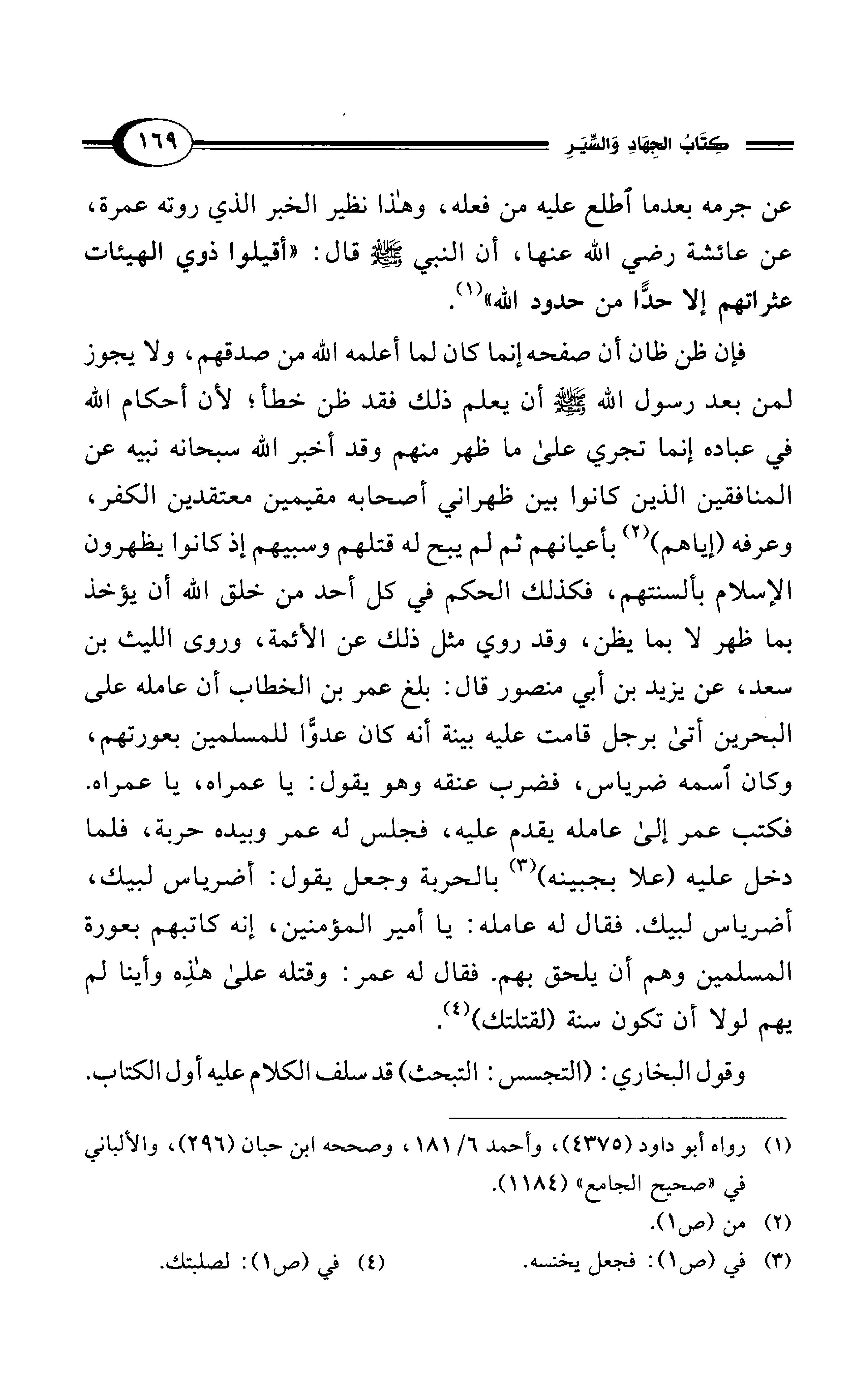 فإن ظن ظان أن صفحه إنما كان لما أعلمه الله من صدقهم، ولا يجوز لمن بعد رسول الله - صلى الله عليه وسلم - أن يعلم ذلك فقد ظن خطأ؛ لأن أحكام الله في عباده إنما تجري على ما ظهر منهم وقد أخبر الله سبحانه نبيه عن المنافقين الذين كانوا بين ظهراني أصحابه مقيمين معتقدين الكفر، وعرفه (إياهم) (¬2) بأعيانهم ثم لم يبح له قتلهم وسبيهم إذ كانوا يظهرون الإسلام بألسنتهم، فكذلك الحكم في كل أحد من خلق الله أن يؤخذ مما ظهر لا مما يظن، وقد روي مثل ذلك عن الأئمة، وروى الليث بن سعد، عن يزيد بن أبي منصور قال: بلغ عمر بن الخطاب أن عامله على البحرين أتى برجل قامت عليه بينة أنه كان عدوًّا للمسلمين بعورتهم، وكان اسمه ضرياس، فضرب عنقه وهو يقول: يا عمراه، يا عمراه. فكتب عمر إلى عامله يقدم عليه، فجلس له عمر وبيده حربة، فلما دخل عليه (على بجبينه) (¬3) بالحربة وجعل يقول: أضرياس لبيك، أضرياس لبيك. فقال له عامله: يا أمير المؤمنين، إنه كاتبهم بعورة المسلمين وهم أن يلحق بهم. فقال له عمر: وقتله على هذِه وأينا لم يهم لولا أن تكون سنة (لقتلتك) (¬4).