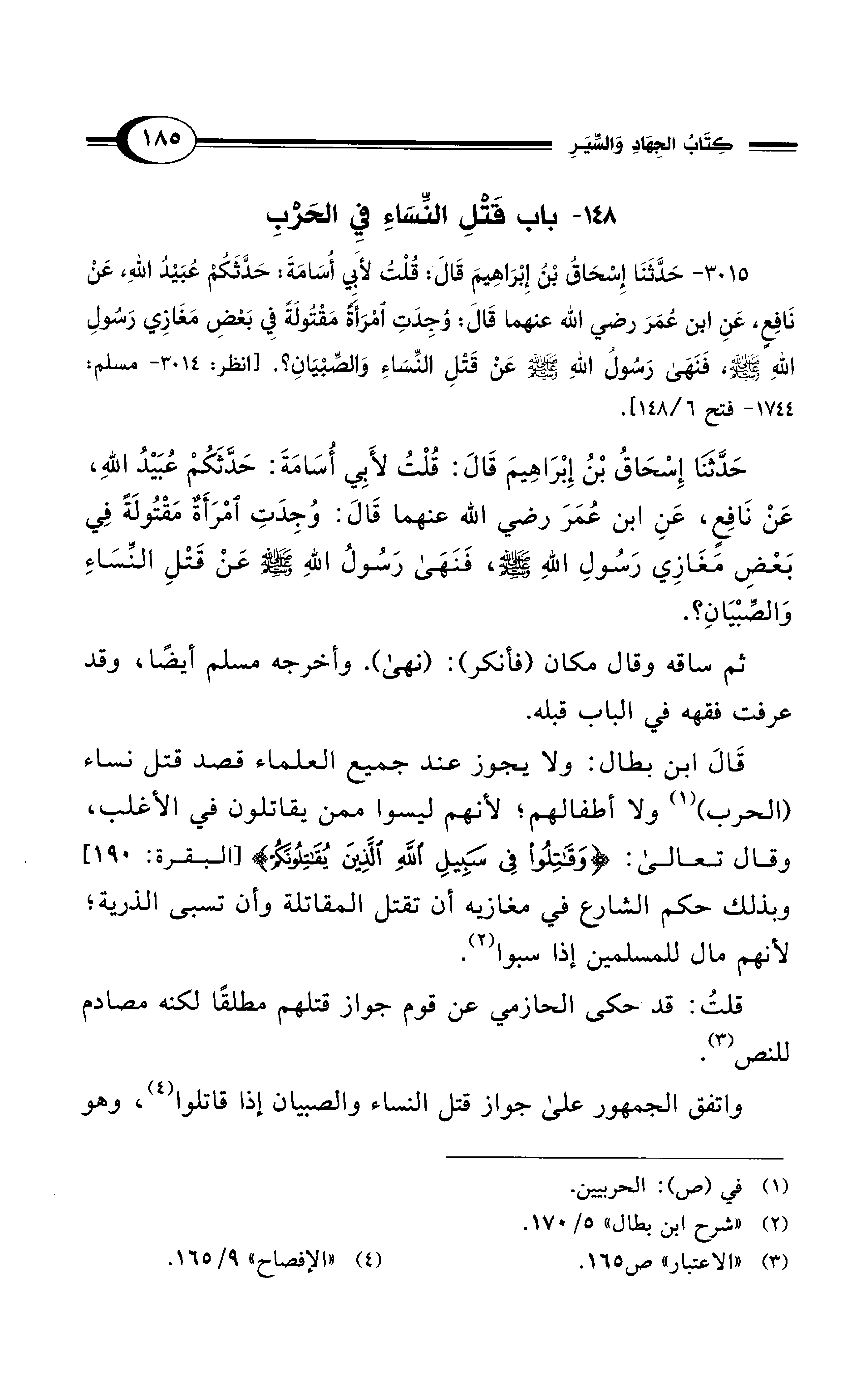 حَدَّثنَا إِسْحَاقُ بْنُ إِبْرَاهِيمَ قَالَ: قُلْتُ لأَبِي أُسَامَةَ: حَدَّثَكُمْ عُبَيْدُ اللهِ، عَنْ نَافِعٍ، عَنِ ابن عُمَرَ - رضي الله عنهما - قَالَ: وُجِدَتِ امْرَأَةٌ مَقْتُولَةً فِي بَعْضِ مَغَازِي رَسُولِ اللهِ - صلى الله عليه وسلم -، فَنَهَى رَسُولُ اللهِ - صلى الله عليه وسلم - عَنْ قَتْلِ النِّسَاءِ وَالصِّبْيَانِ؟.