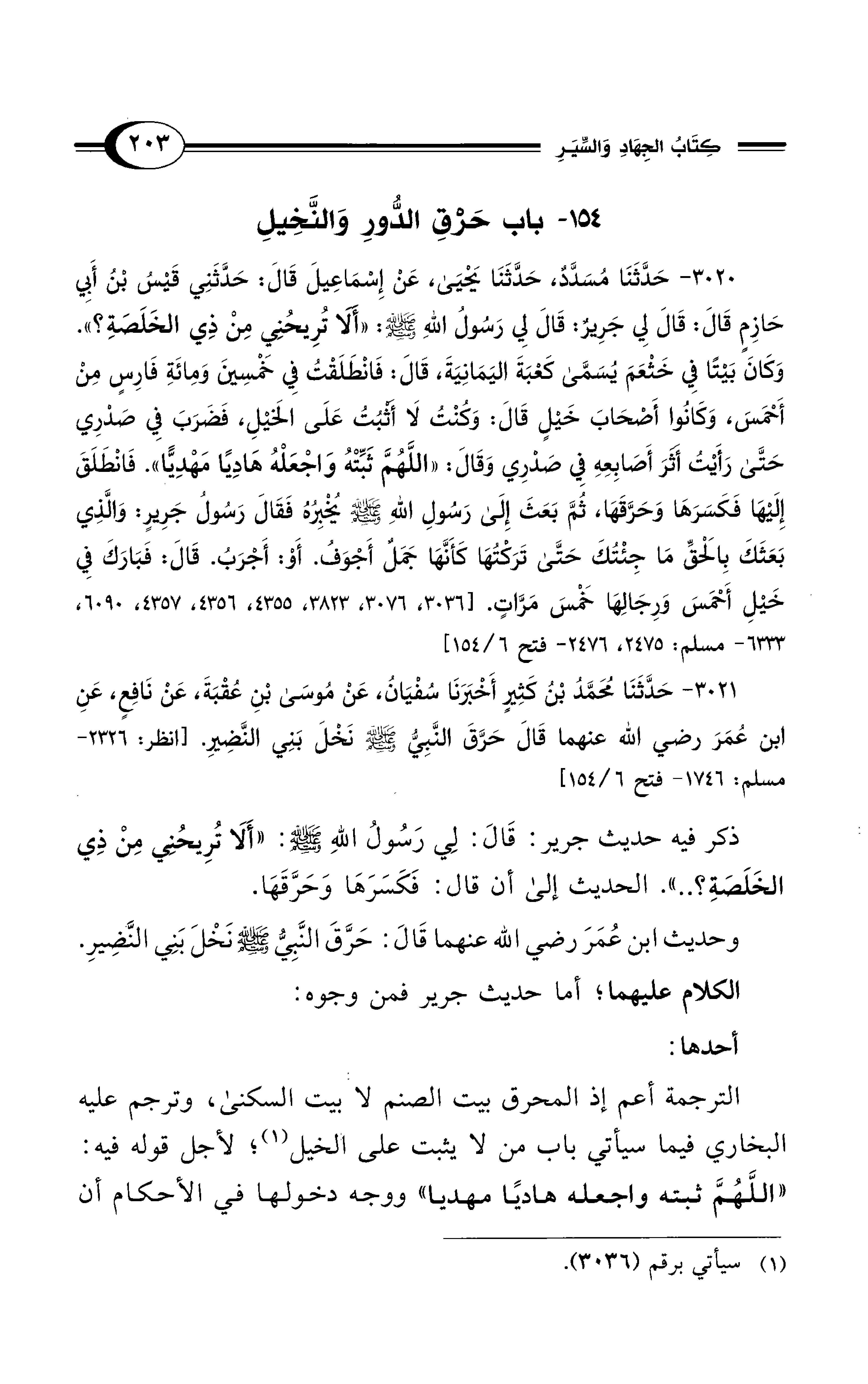 3020 - حَدَّثَنَا مُسَدَّدٌ، حَدَّثَنَا يَحْيَى، عَنْ إِسْمَاعِيلَ قَالَ: حَدَّثَنِي قَيْسُ بْنُ أَبِي حَازِمٍ قَالَ: قَالَ لِي جَرِيرٌ: قَالَ لِي رَسُولُ اللهِ - صلى الله عليه وسلم -: «أَلاَ تُرِيحُنِي مِنْ ذِي الخَلَصَةِ؟». وَكَانَ بَيْتًا فِي خَثْعَمَ يُسَمَّى كَعْبَةَ اليَمَانِيَةَ قَالَ: فَانْطَلَقْتُ فِي خَمْسِينَ وَمِائَةِ فَارِسٍ مِنْ أَحْمَسَ، وَكَانُوا أَصْحَابَ خَيْلٍ قَالَ: وَكُنْتُ لاَ أَثْبُتُ عَلَى الخَيْلِ، فَضَرَبَ فِي صَدْرِي حَتَّى رَأَيْتُ أَثَرَ أَصَابِعِهِ فِي صَدْرِي وَقَالَ «اللَّهُمَّ ثَبِّتْهُ وَاجْعَلْهُ هَادِيًا مَهْدِيًّا». فَانْطَلَقَ إِلَيْهَا فَكَسَرَهَا وَحَرَّقَهَا، ثُمَّ بَعَثَ إِلَى رَسُولِ اللهِ - صلى الله عليه وسلم - يُخْبِرُهُ فَقَالَ رَسُولُ جَرِيرٍ: وَالَّذِي بَعَثَكَ بِالْحَقِّ، مَا جِئْتُكَ حَتَّى تَرَكْتُهَا كَأَنَّهَا جَمَلٌ أَجْوَفُ أَوْ: أَجْرَبُ. قَالَ: فَبَارَكَ فِي خَيْلِ أَحْمَسَ وَرِجَالِهَا خَمْسَ مَرَّاتٍ. [3036، 3076، 3823، 4355، 4356، 4357، 6090، 6333 - مسلم: 2475، 2476 - فتح 6/ 154]