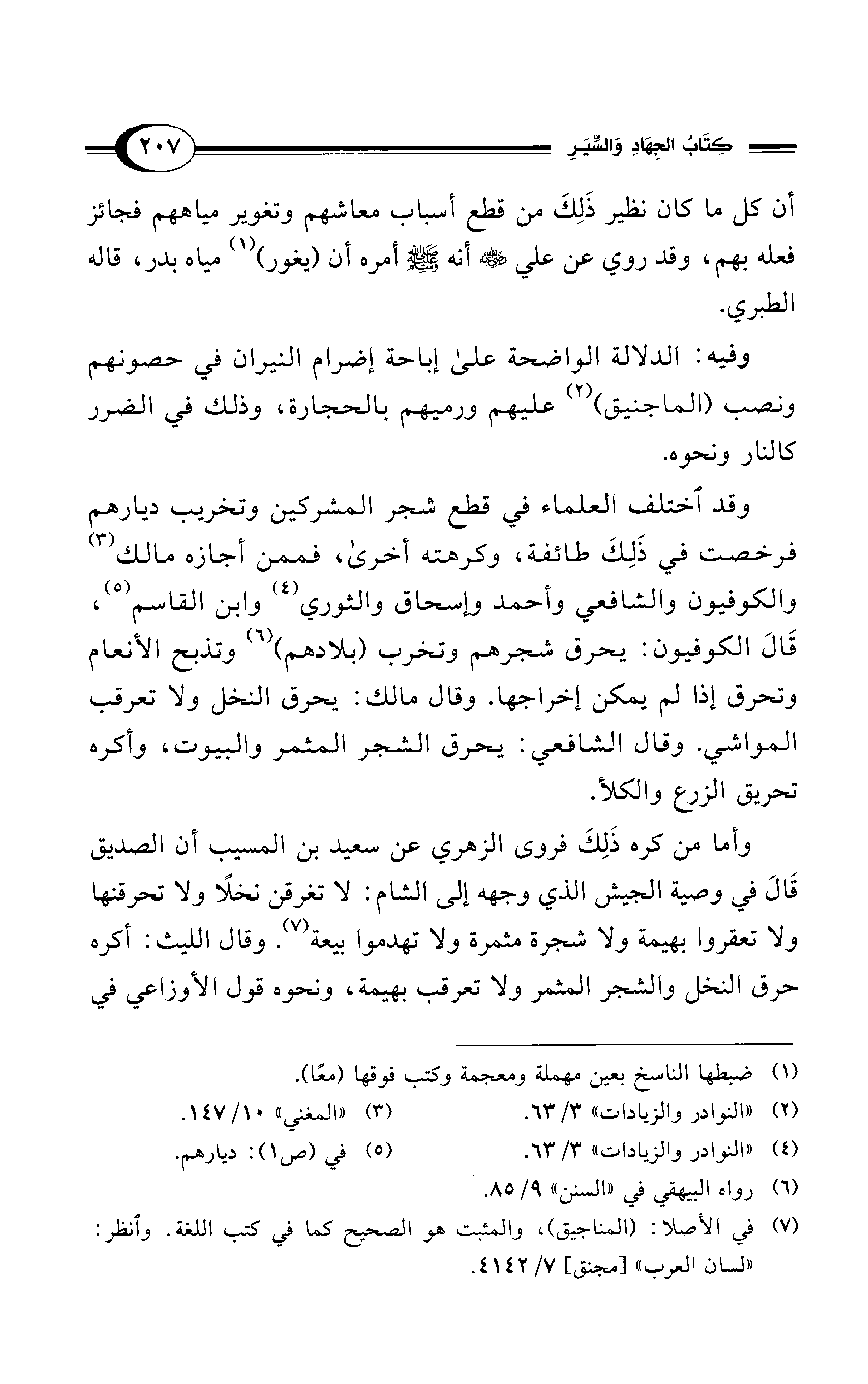 وقد اختلف العلماء في قطع شجر المشركين وتخريب ديارهم فرخصت في ذَلِكَ طائفة، وكرهته أخرى، فممن أجازه مالك (¬3) والكوفيون والشافعي وأحمد وإسحاق والثوري (¬4) وابن القاسم (¬5)، قَال الكوفيون: يحرق شجرهم وتخرب (بلادهم) (¬6) وتذبح الأنعام وتحرق إذا لم يمكن إخراجها. وقال مالك: يحرق النخل ولا تعرقب المواشي. وقال الشافعي: يحرق الشجر المثمر والبيوت، وأكره تحريق الزرع والكلأ.