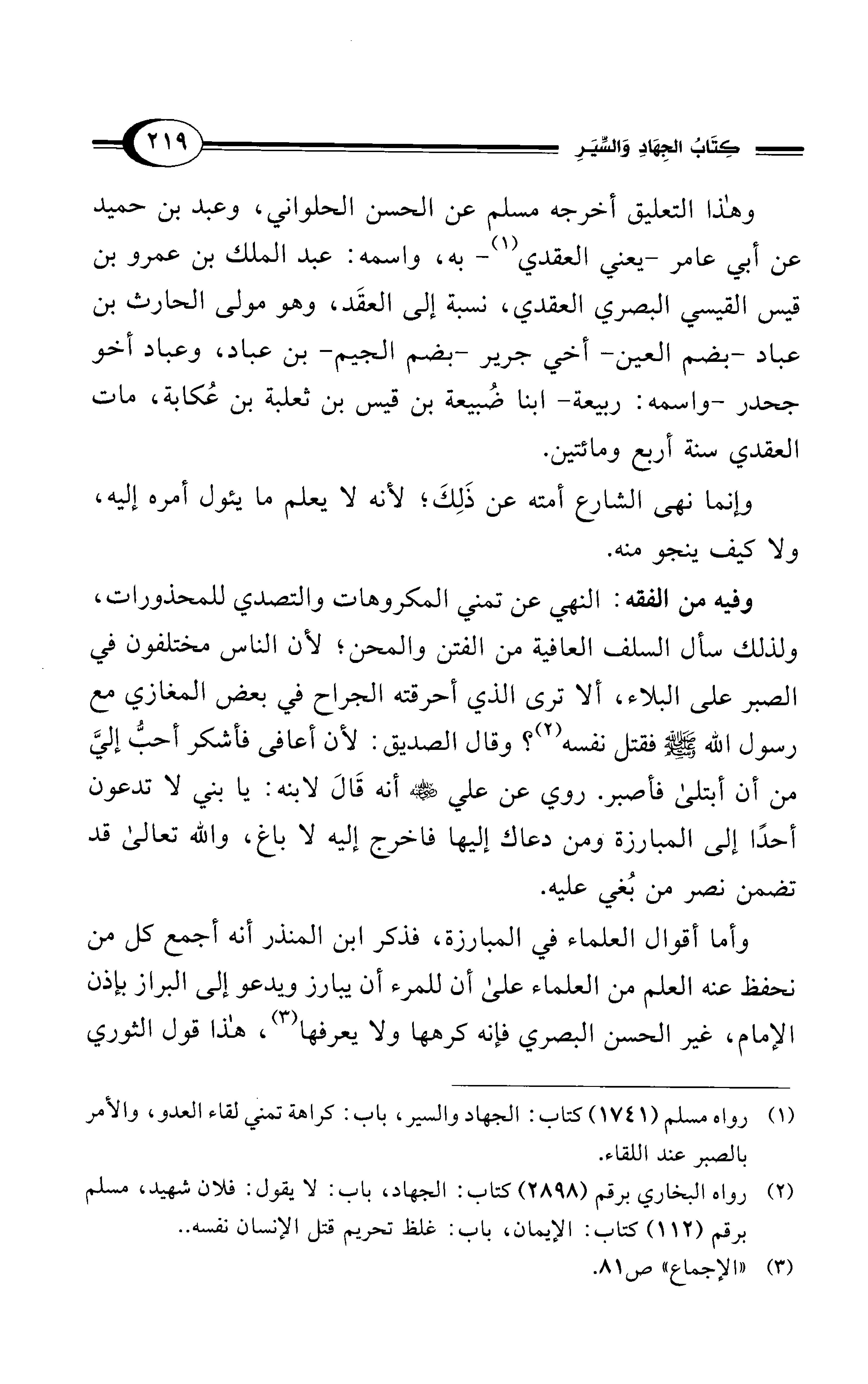 وأما أقوال العلماء في المبارزة، فذكر ابن المنذر أنه أجمع كل من نحفظ عنه العلم من العلماء على أن للمرء أن يبارز ويدعو إلى البراز بإذن الإمام، غير الحسن البصري فإنه كرهها ولا يعرفها (¬3)، هذا قول الثوري