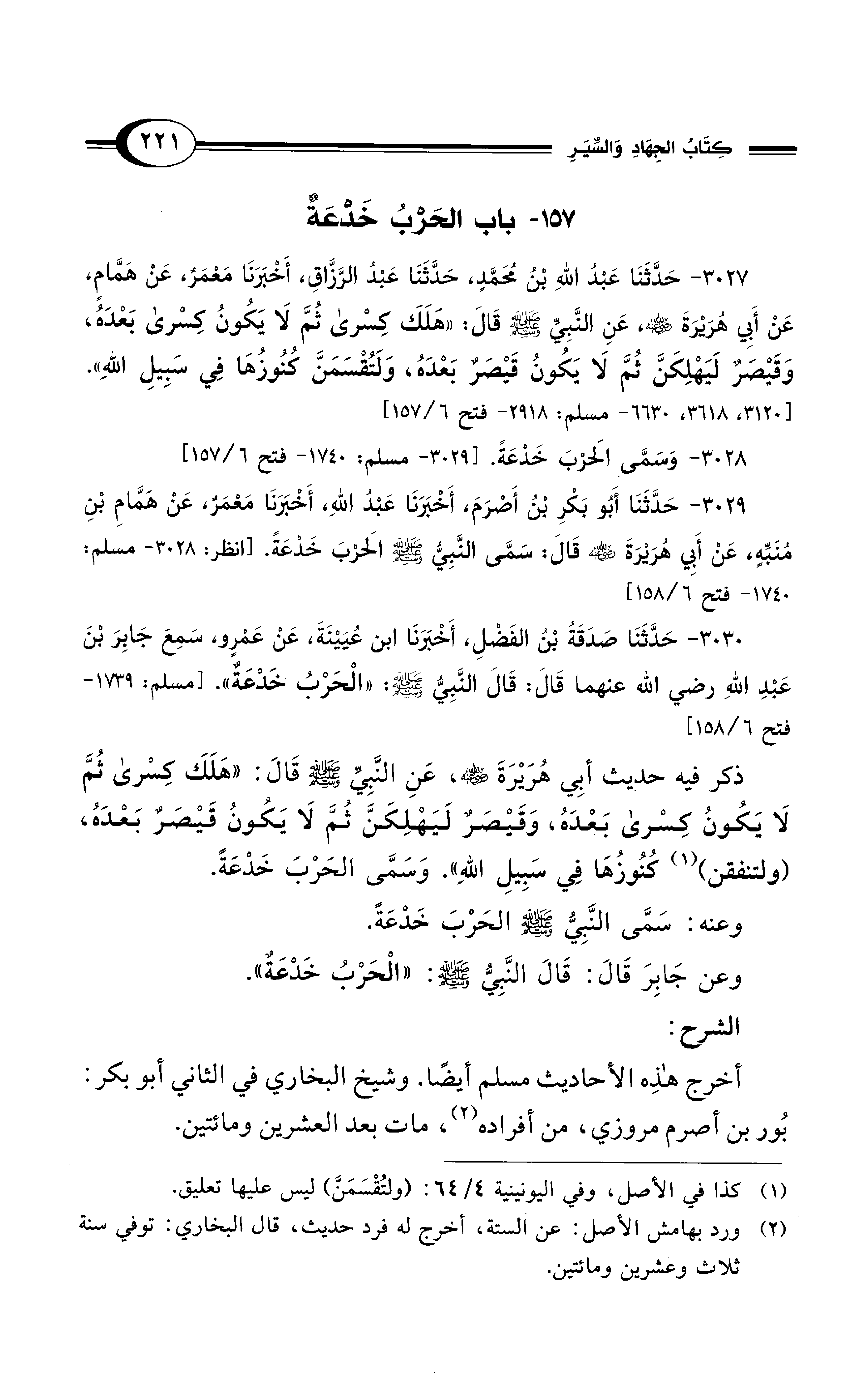 3027 - حَدَّثَنَا عَبْدُ اللهِ بْنُ مُحَمَّدٍ حَدَّثَنَا عَبْدُ الرَّزَّاقِ أَخْبَرَنَا مَعْمَرٌ عَنْ هَمَّامٍ عَنْ أَبِي هُرَيْرَةَ - رضي الله عنه - عَنِ النَّبِيِّ - صلى الله عليه وسلم - قَالَ: «هَلَكَ كِسْرَى ثُمَّ لاَ يَكُونُ كِسْرَى بَعْدَهُ، وَقَيْصَرٌ لَيَهْلِكَنَّ ثُمَّ لاَ يَكُونُ قَيْصَرٌ بَعْدَهُ، وَلَتُقْسَمَنَّ كُنُوزُهَا فِي سَبِيلِ اللهِ». [3120، 3618، 6630 - مسلم: 2918 - فتح 6/ 157]