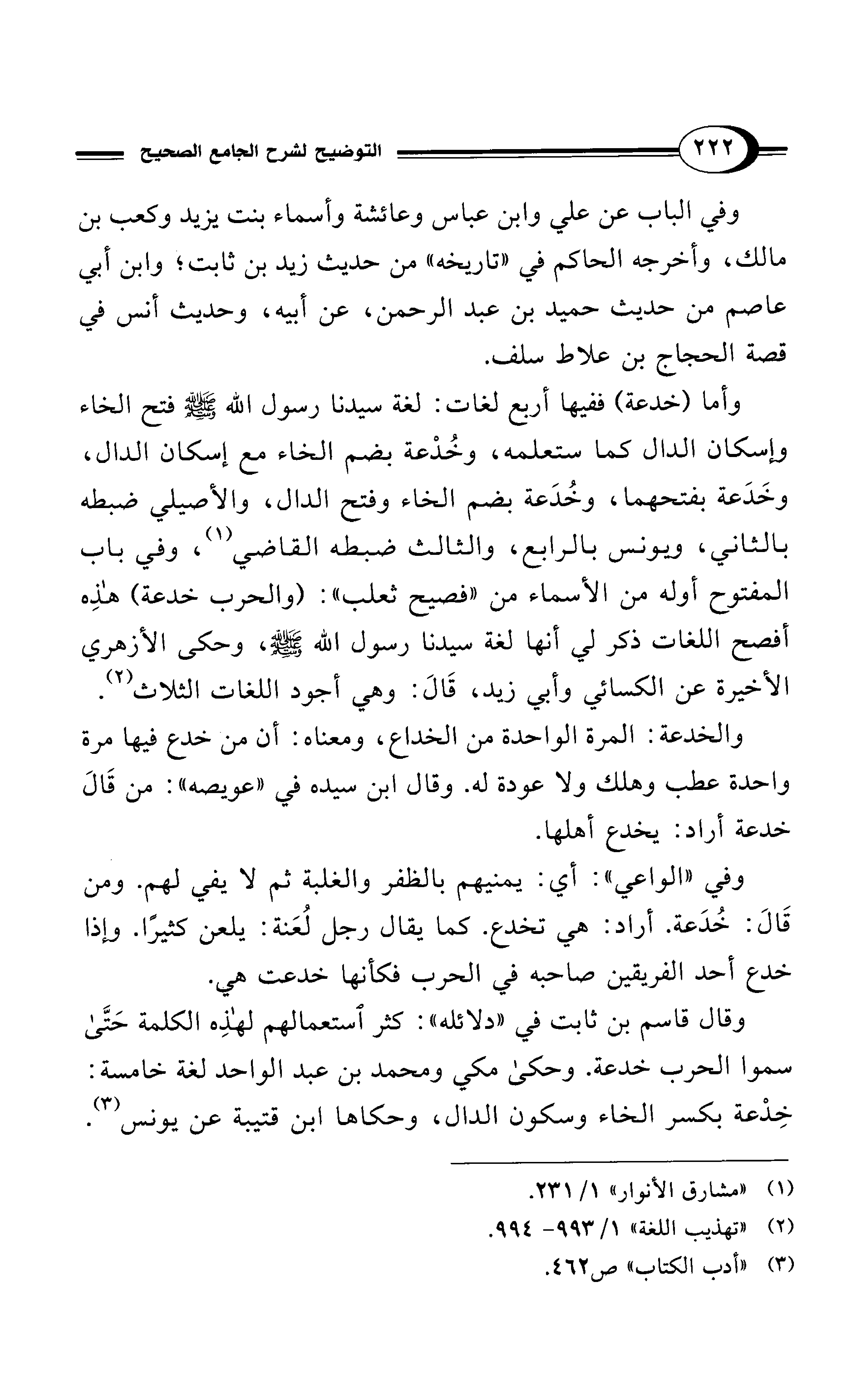 وأما (خدعة) ففيها أربع لغات: لغة سيدنا رسول - صلى الله عليه وسلم - فتح الخاء وإسكان الدال كما ستعلمه، وخُدْعة بضم الخاء مع إسكان الدال، وخَدَعة بفتحهما، وخُدَعة بضم الخاء وفتح الدال، والأصيلي ضبطه بالثاني، ويونس بالرابع، والثالث ضبطه القاضي (¬1)، وفي باب المفتوح أوله من الأسماء من "فصيح ثعلب": (والحرب خدعة) هذِه أفصح اللغات ذكر لي أنها لغة سيدنا رسول الله - صلى الله عليه وسلم -، وحكى الأزهري الأخيرة عن الكسائي وأبي زبد، قَالَ: وهي أجود اللغات الثلاث (¬2).