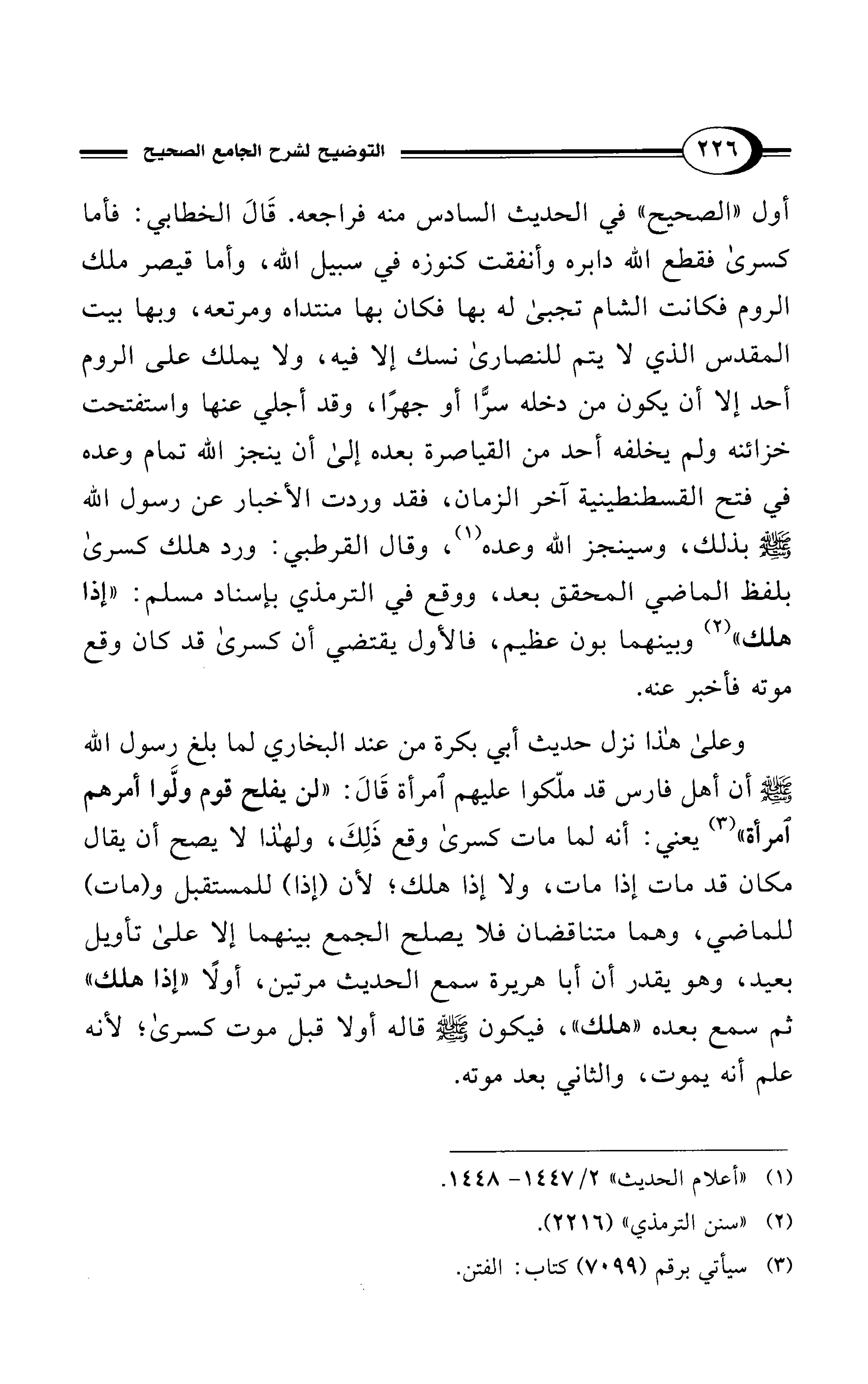 أول "الصحيح" في الحديث السادس منه فراجعه. قَالَ الخطابي: فأما كسرى فقطع الله دابره وأنفقت كنوزه في سبيل الله، وأما قيصر ملك الروم فكانت الشام تجبى له بها فكان بها منتداه ومرتعه، وبها بيت المقدس الذي لا يتم للنصارى نسك إلا فيه، ولا يملك على الروم أحد إلا أن يكون من دخله سرًّا أو جهرًا، وقد أجلي عنها واستفتحت خزائنه ولم يخلفه أحد من القياسرة بعده إلى أن ينجز الله تمام وعده في فتح القسطنطينية آخر الزمان، فقد وردت الأخبار عن رسول الله - صلى الله عليه وسلم - بذلك، وسينجز الله وعده (¬1)، وقال القرطبي: ورد هلك كسرى بلفظ الماضي المحقق بعد، ووقع في الترمذي بإسناد مسلم: "إذا هلك" (¬2) وبينهما بنون عظيم، فالأول يقتضي أن كسرى قد كان وقع موته فأخبر عنه.
