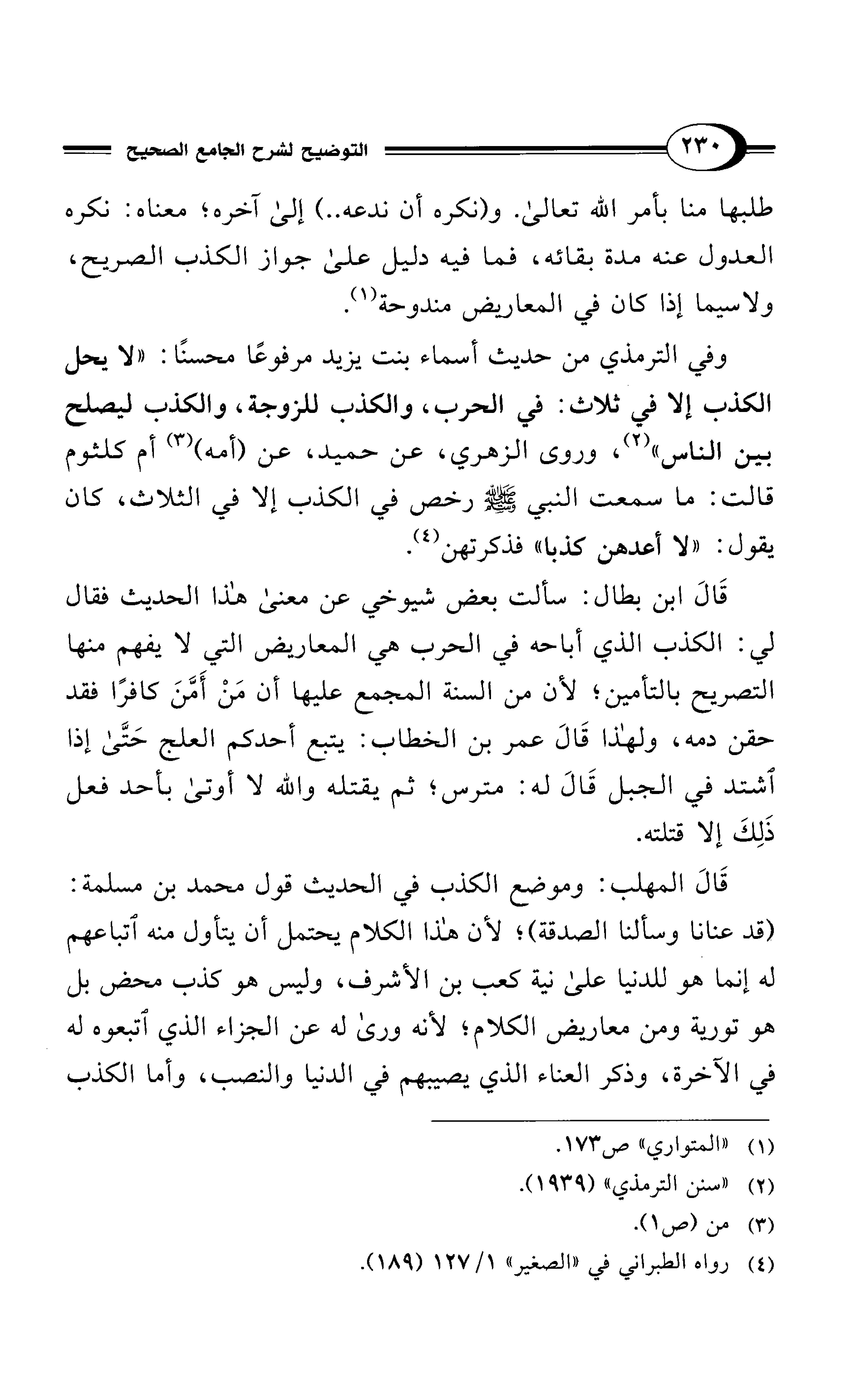 وفي الترمذي من حديث أسماء بنت يزيد مرفوعًا محسنًا: "لا يحل الكذب إلا في ثلاث: في الحرب، والكذب للزوجة، والكذب ليصلح بين الناس" (¬2)، وروى الزهري، عن حميد، عن (أمه) (¬3) أم كلثوم قالت: ما سمعت النبي - صلى الله عليه وسلم - رخص في الكذب إلا في الثلاث، كان يقول: "لا أعدهن كذبا" فذكرتهن (¬4).