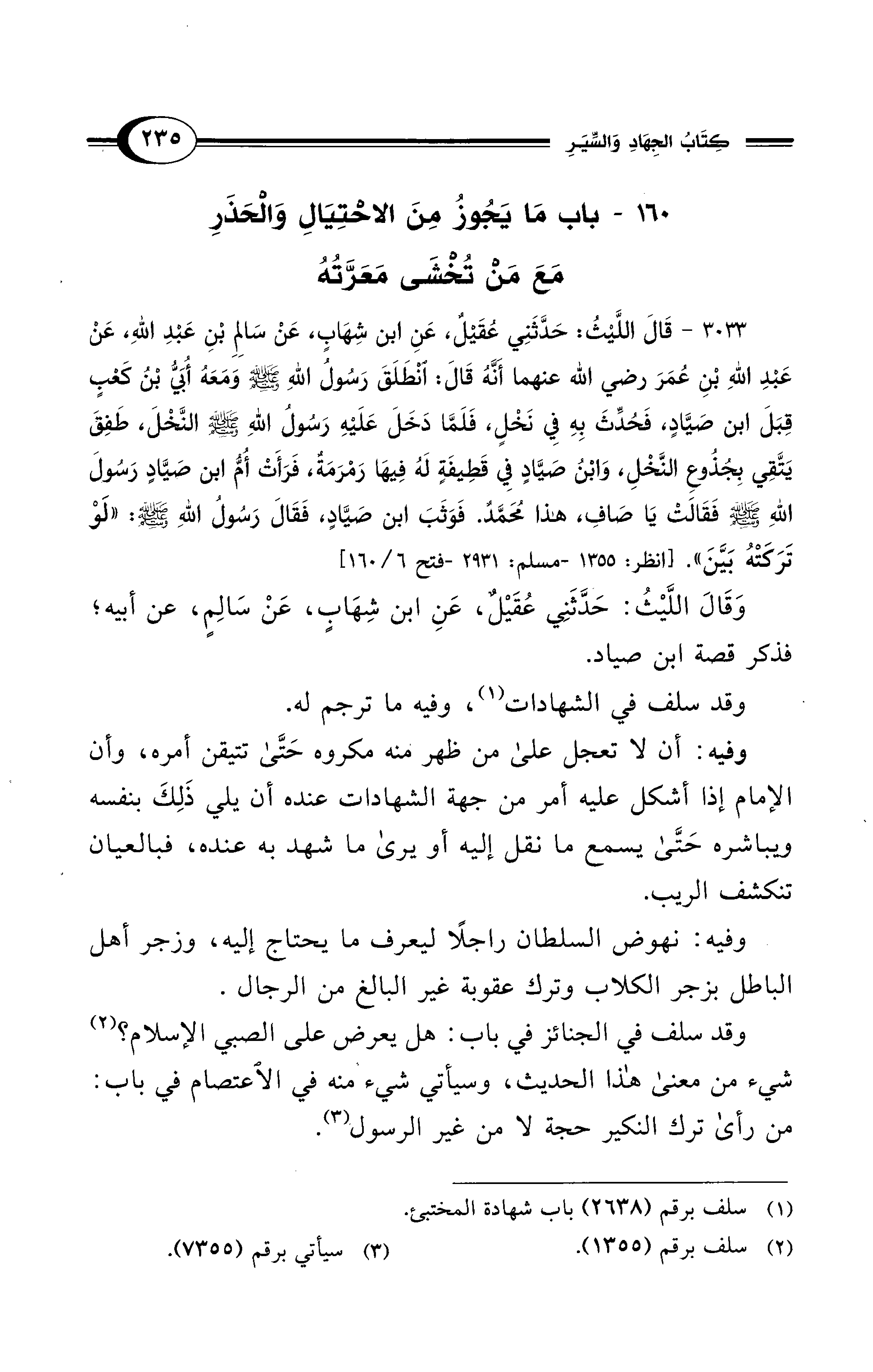 3033 - قَالَ اللَّيْثُ: حَدَّثَنِي عُقَيْلٌ، عَنِ ابْنِ شِهَابٍ، عَنْ سَالِمِ بْنِ عَبْدِ اللهِ، عَنْ عَبْدِ اللهِ بْنِ عُمَرَ - رضي الله عنهما - أَنَّهُ قَالَ: انْطَلَقَ رَسُولُ اللهِ - صلى الله عليه وسلم - وَمَعَهُ أُبَيُّ بْنُ كَعْبٍ قِبَلَ ابْنِ صَيَّادٍ، فَحُدِّثَ بِهِ فِي نَخْلٍ، فَلَمَّا دَخَلَ عَلَيْهِ رَسُولُ اللهِ - صلى الله عليه وسلم - النَّخْلَ، طَفِقَ يَتَّقِى بِجُذُوعِ النَّخْلِ، وَابْنُ صَيَّادٍ في قَطِيفَةٍ لَهُ فِيهَا رَمْرَمَةٌ، فَرَأَتْ أُمُّ ابْنِ صَيَّادٍ رَسُولَ اللهِ - صلى الله عليه وسلم - فَقَالَتْ: يَا صَافِ، هَذَا مُحَمَّدٌ، فَوَثَبَ ابْنُ صَيَّادٍ، فَقَالَ رَسُولُ اللهِ: - صلى الله عليه وسلم -: «لَوْ تَرَكَتْهُ بَيَّنَ». [انظر: 1355 - مسلم: 2931 - فتح 6/ 160]