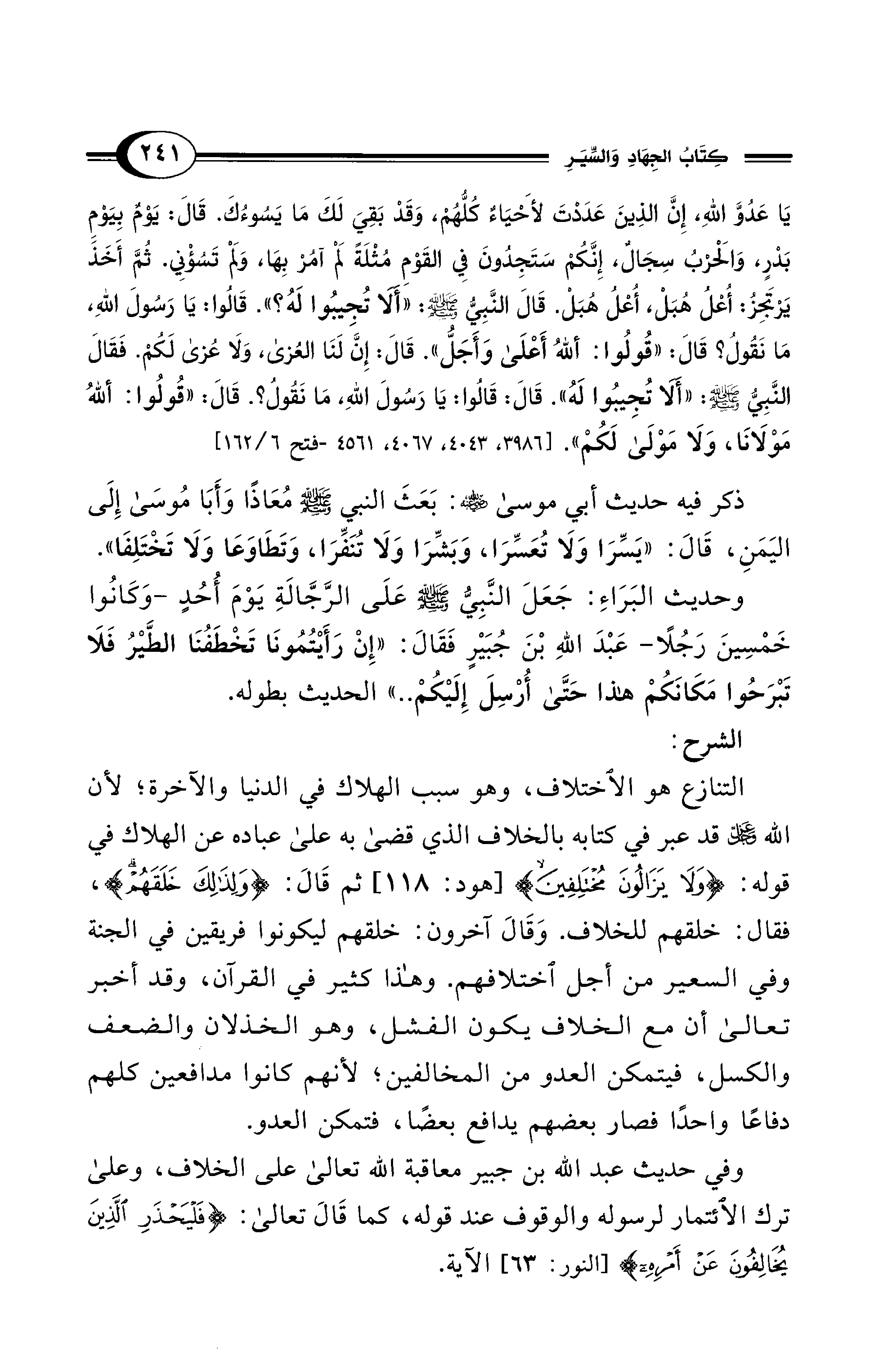 ذكر فيه حديث أبي موسى - رضي الله عنه -: بَعَثَ النبي - صلى الله عليه وسلم - معَاذًا وَأَبَا مُوسَى إِلَى اليَمَنِ، قَالَ: "يَسِّرَا وَلَا تُعَسِّرَا، وَبَشِّرَا وَلَا تُنَفِّرَا، وَتَطَاوَعَا وَلَا تَخْتَلِفَا".