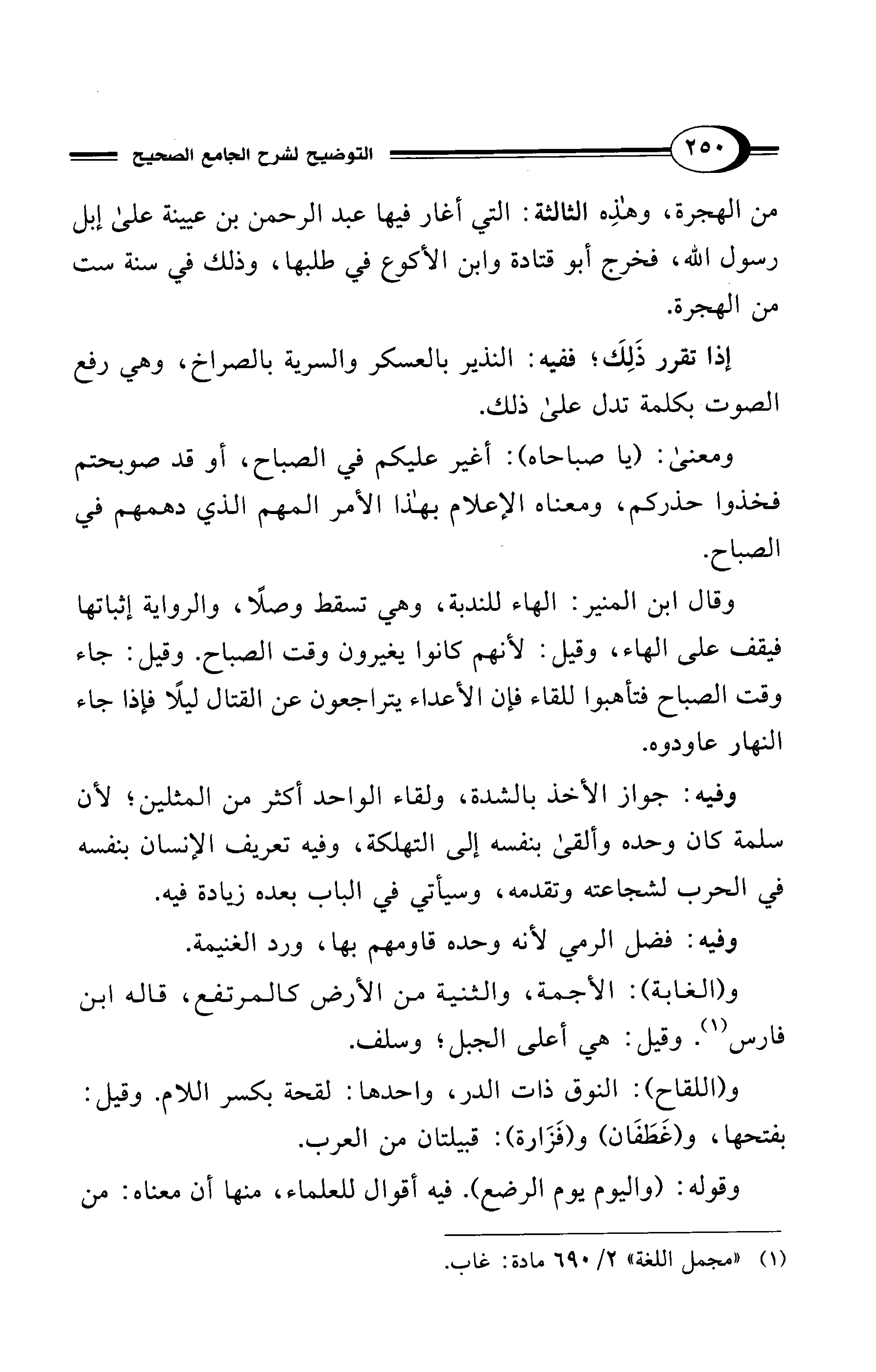 وقال ابن المنير: الهاء للندبة، وهي تسقط وصلاً، والرواية إثباتها فيقف على الهاء، وقيل: لأنهم كانوا يغيرون وقت الصباح. وقيل: جاء وقت الصباح فتأهبوا للقاء فإن الأعداء يتراجعون عن القتال ليلاً فإذا جاء النهار عاودوه.