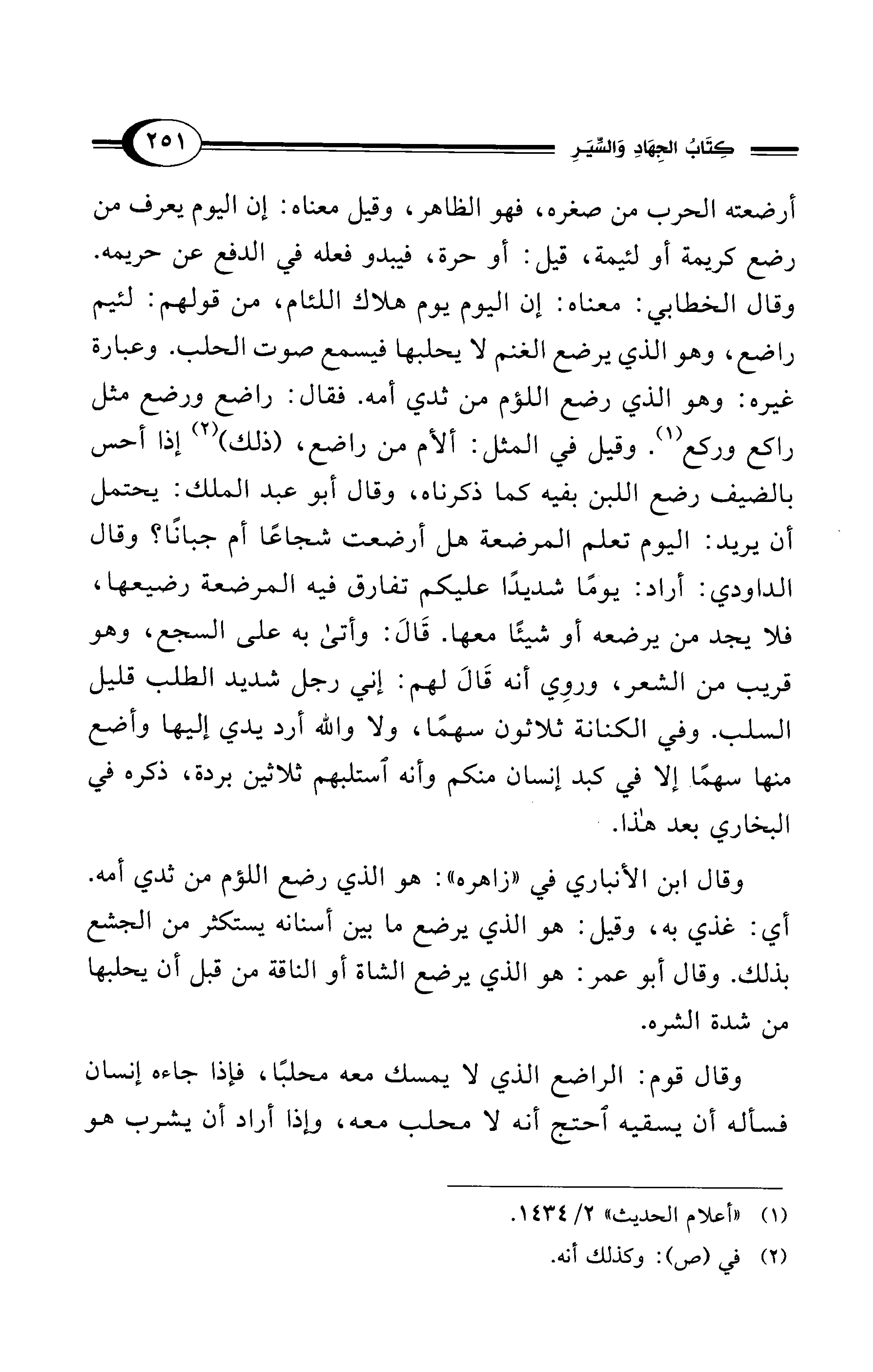 أرضعته الحرب من صغره، فهو الظاهر، وقيل معناه: إن اليوم يعرف من رضع كريمة أو لئيمة، قيل: أو حرة، فيبدو فعله في الدفع عن حريمه. وقال الخطابي: معناه: إن اليوم يوم هلاك اللئام، من قولهم: لئيم راضع، وهو الذي يرضع الغنم لا يحلبها فيسمع صوت الحلب. وعبارة غيره: وهو الذي رضع اللؤم من ثدي أمه. فقال: راضع ورضع مثل راكع وركع (¬1). وقيل في المثل: ألأم من راضع، (ذلك) (¬2) إذا أحس بالضيف رضع اللبن بفيه كما ذكرناه، وقال أبو عبد الملك: يحتمل أن يريد: اليوم تعلم المرضعة هل أرضعت شجاعًا أم جبانًا؟ وقال الداودي: أراد: يومًا شديدًا عليكم تفارق فيه المرضعة رضيعها، فلا يجد من يرضعه أو شيئًا معها. قَالَ: وأتى به على السجع، وهو قريب من الشعر، وروِي أنه قَالَ لهم: إني رجل شديد الطلب قليل السلب. وفي الكنانة ثلاثون سهمًا, ولا والله أرد يدي إليها وأضع منها سهمًا إلا في كبد إنسان منكم وأنه استلبهم ثلاثين بردة، ذكره في البخاري بعد هذا.