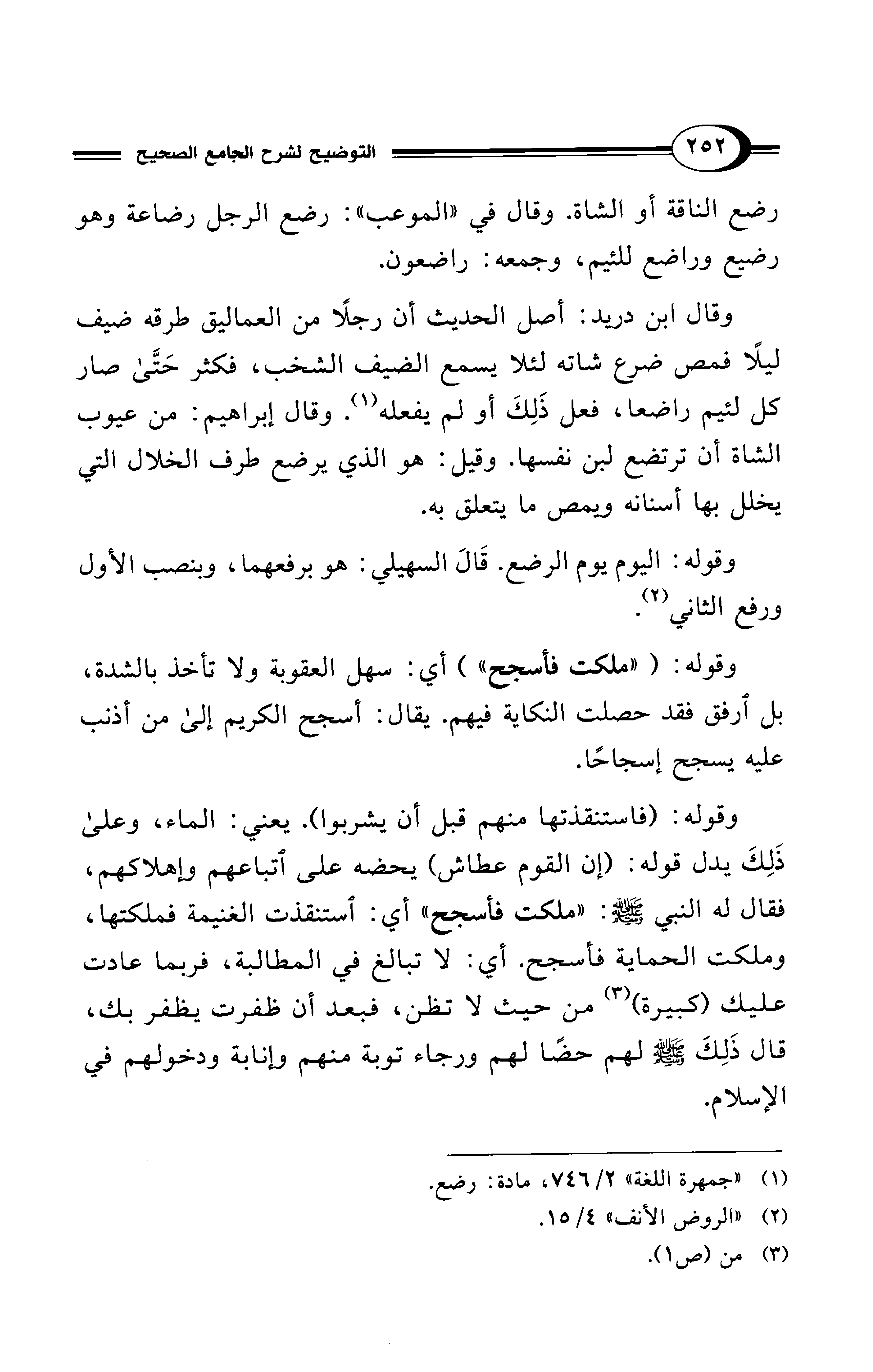 وقوله: (فاستنقذتها منهم قبل أن يشربوا). يعني: الماء، وعلى ذَلِكَ يدل قوله: (إن القوم عطاش) يحضه على اتباعهم وإهلاكهم، فقال له النبي - صلى الله عليه وسلم -: "ملكت فأسجح" أي: استنقذت الغنيمة فملكتها، وملكت الحماية فأسجح. أي: لا تبالغ في المطالبة، فربما عادت عليك (كبيرة) (¬3) من حيث لا تظن، فبعد أن ظفرت يظفر بك، قال ذَلِكَ - صلى الله عليه وسلم - لهم حضًا لهم ورجاء توبة منهم وإنابة ودخولهم في الإسلام.