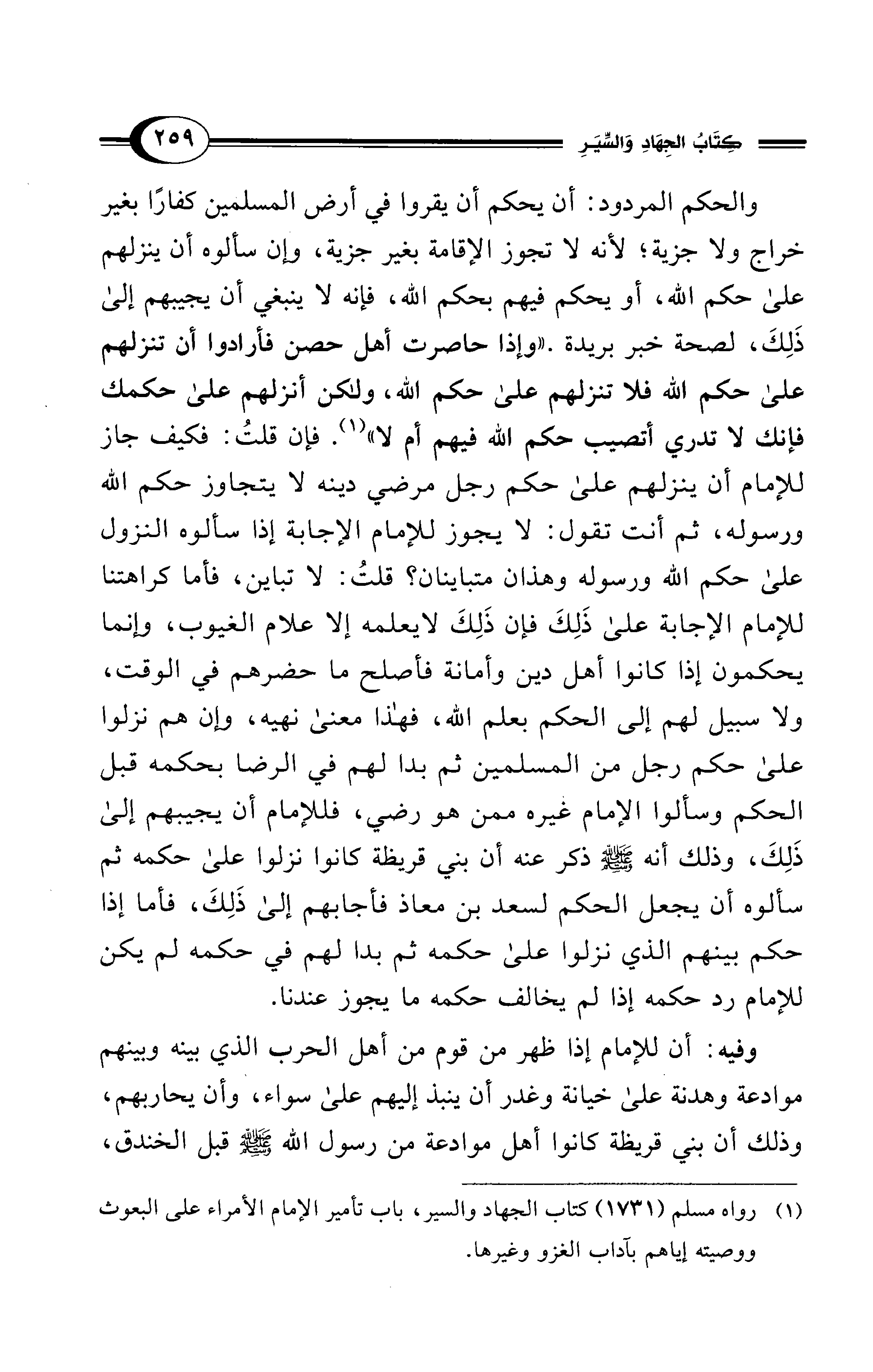 والحكم المردود: أن يحكم أن يقروا في أرض المسلمين كفارًا بغير خراج ولا جزية؛ لأنه لا تجوز الإقامة بغير جزية، وإن سألوه أن ينزلهم على حكم الله، أو يحكم فيهم بحكم الله، فإنه لا ينبغي أن يجيبهم إلى ذَلِكَ، لصحة خبر بريدة. "وإذا حاصرت أهل حصن فأرادوا أن تنزلهم على حكم الله فلا تنزلهم على حكم الله، ولكن أنزلهم على حكمك فإنك لا تدري أتصيب حكم الله فيهم أم لا" (¬1). فإن قلتُ: فكيف جاز للإمام أن ينزلهم على حكم رجل مرضي دينه لا يتجاوز حكم الله ورسوله، ثم أنت تقول: لا يجوز للإمام الإجابة إذا سألوه النزول على حكم الله ورسوله وهذان متباينان؟ قلتُ: لا تباين، فأما كراهتنا للإمام الإجابة على ذَلِكَ فإن ذَلِكَ لا يعلمه إلا علام الغيوب، وإنما يحكمون إذا كانوا أهل دين وأمانة فأصلح ما حضرهم في الوقت، ولا سبيل لهم إلى الحكم بعلم الله، فهذا معنى نهيه، وإن هم نزلوا على حكم رجل من المسلمين ثم بدا لهم في الرضا بحكمه قبل الحكم وسألوا الإمام غيره ممن هو رضي، فللإمام أن يجيبهم إلى ذَلِكَ، وذلك أنه - صلى الله عليه وسلم - ذكر عنه أن بني قريظة كانوا نزلوا على حكمه ثم سألوه أن يجعل الحكم لسعد بن معاذ فأجابهم إلى ذَلِكَ، فأما إذا