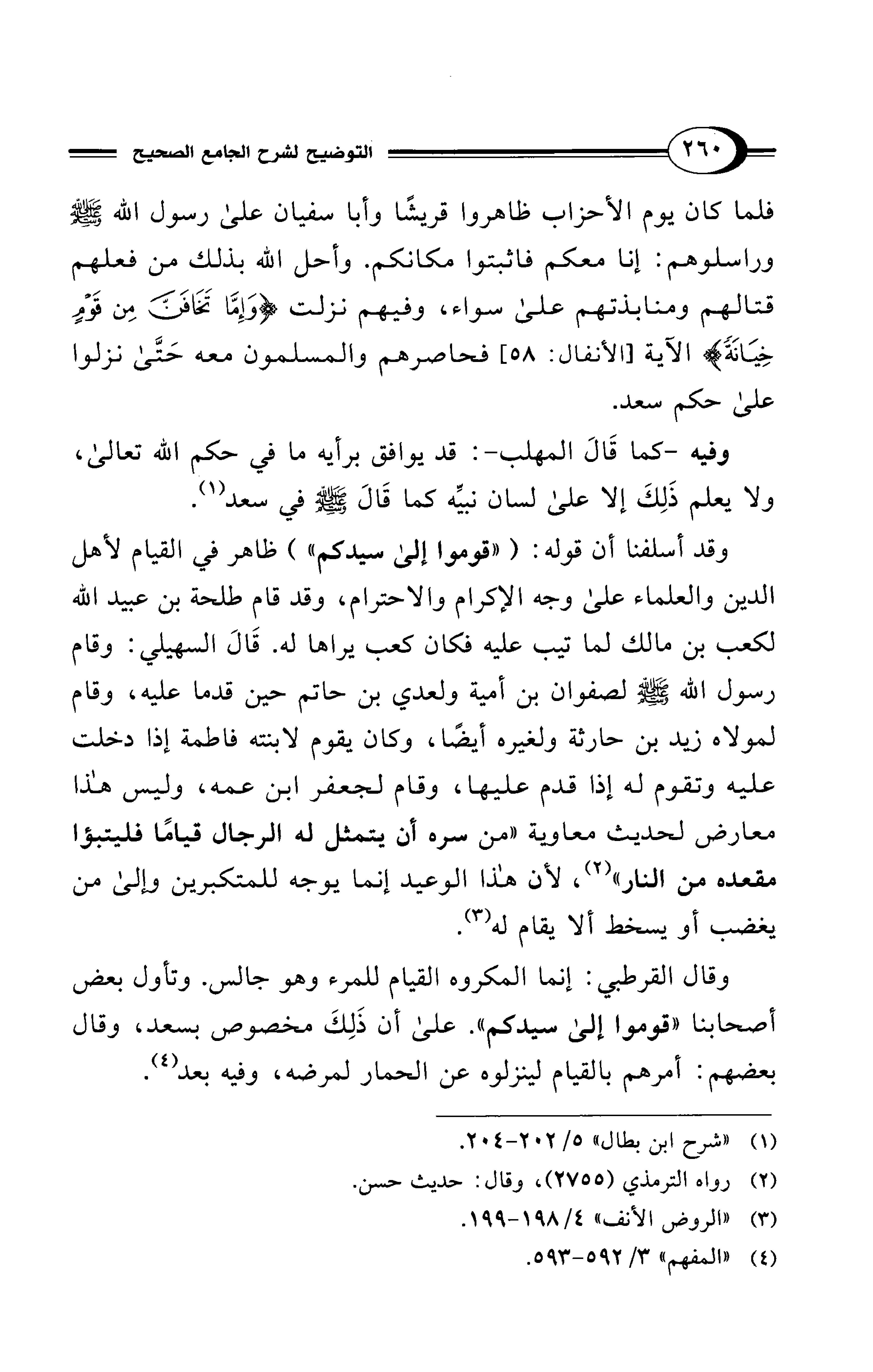 وقال القرطبي: إنما المكروه القيام للمرء وهو جالس. وتأول بعض أصحابنا "قوموا إلى سيدكم". على أن ذَلِكَ مخصوص بسعد، وقال بعضهم: أمرهم بالقيام لينزلوه عن الحمار لمرضه، وفيه بعد (¬4).
