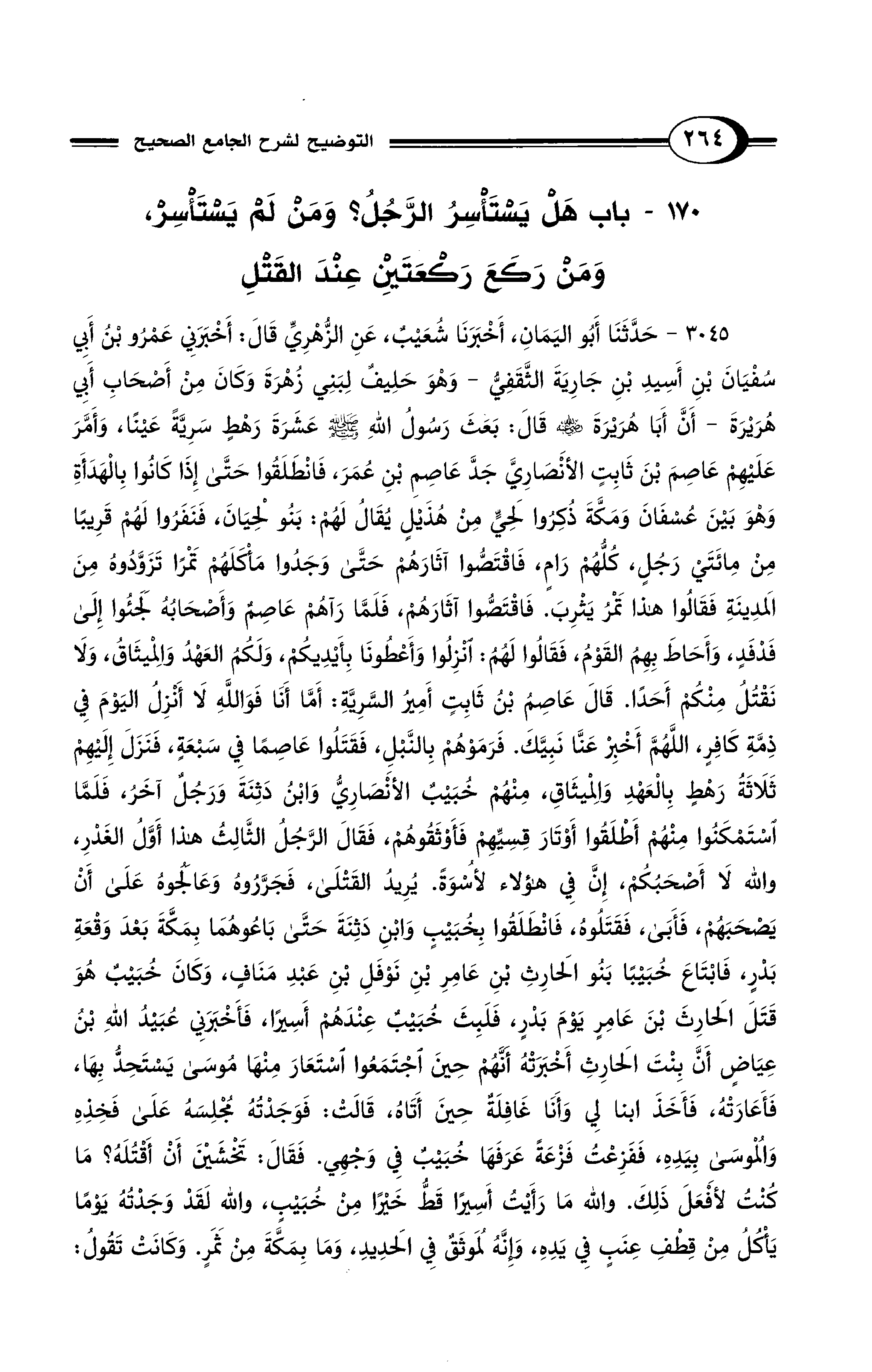 170 - باب هَل يَسْتَأْسِرُ الرَّجُلُ؟ وَمَنْ لَمْ يَسْتَأسِرْ، وَمَنْ رَكَعَ رَكْعَتَيْن عِنْدَ القَتْلِ