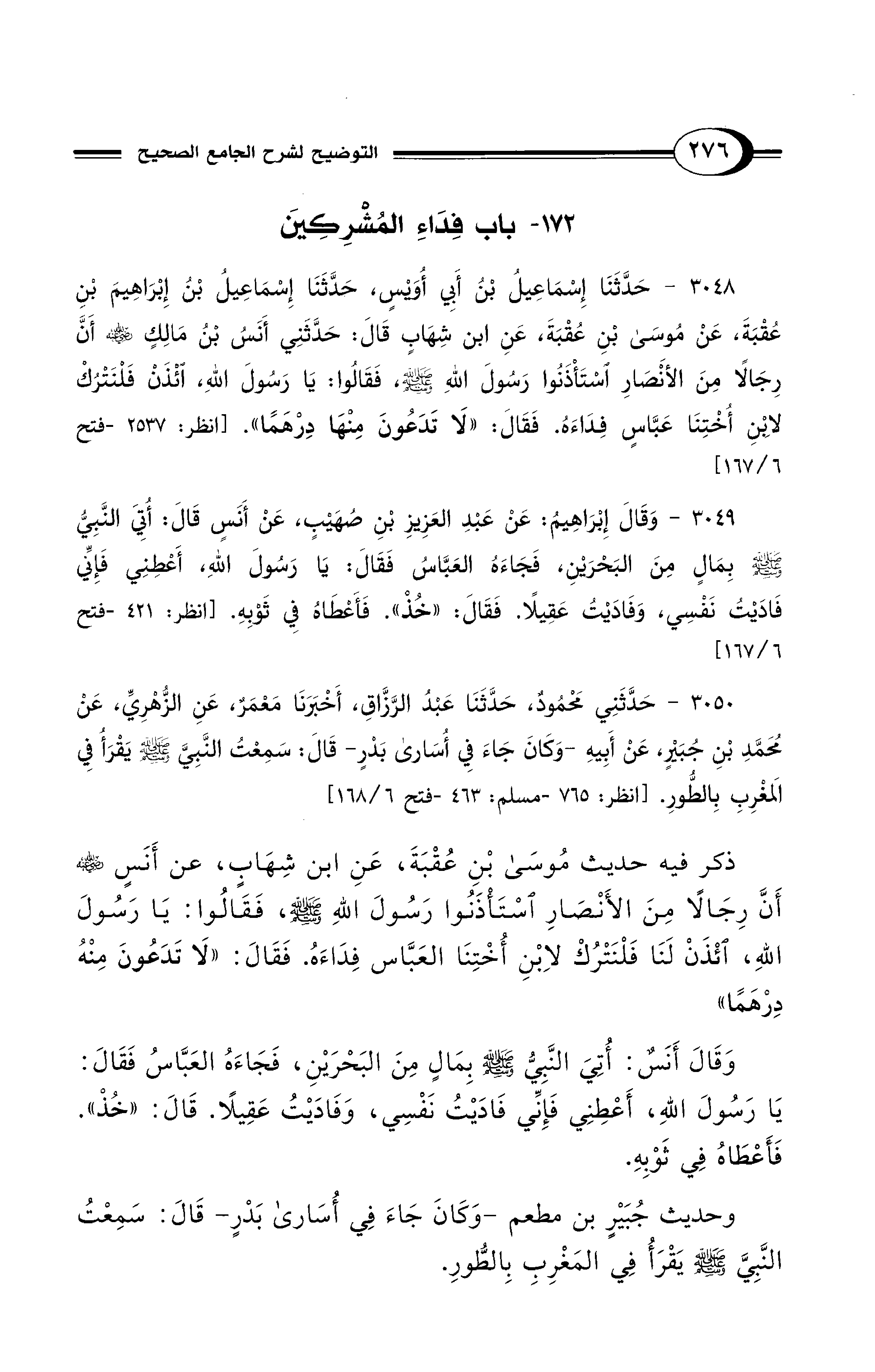 3048 - حَدَّثَنَا إِسْمَاعِيلُ بْنُ أَبِي أُوَيْسٍ، حَدَّثَنَا إِسْمَاعِيلُ بْنُ إِبْرَاهِيمَ بْنِ عُقْبَةَ، عَنْ مُوسَى بْنِ عُقْبَةَ، عَنِ ابْنِ شِهَابٍ قَالَ: حَدَّثَنِي أَنَسُ بْنُ مَالِكٍ - رضي الله عنه - أَنَّ رِجَالاً مِنَ الأَنْصَارِ اسْتَأْذَنُوا رَسُولَ اللهِ - صلى الله عليه وسلم -، فَقَالُوا: يَا رَسُولَ اللهِ، ائْذَنْ فَلْنَتْرُكْ لاِبْنِ أُخْتِنَا عَبَّاسٍ فِدَاءَهُ. فَقَالَ: «لاَ تَدَعُونَ مِنْهَا دِرْهَمًا». [انظر: 2537 - فتح 6/ 167]