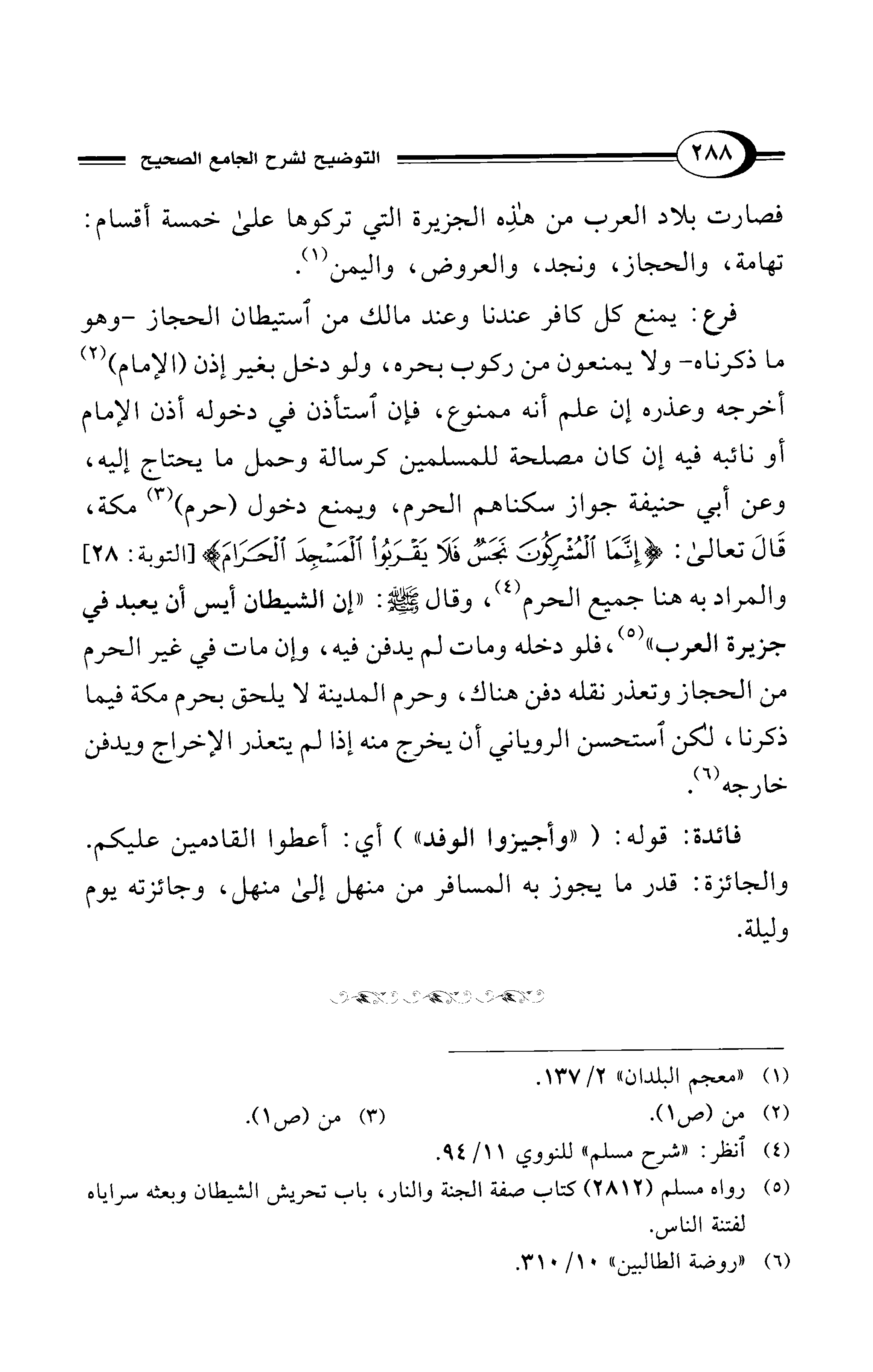 فرع: يمنع كل كافر عندنا وعند مالك من استيطان الحجاز -وهو ما ذكرناه- ولا يمنعون من ركوب بحره، ولو دخل بغير إذن (الإمام) (¬2) أخرجه وعذره إن علم أنه ممنوع، فإن استأذن في دخوله أذن الإمام أو نائبه فيه إن كان مصلحة للمسلمين كرسالة وحمل ما يحتاج إليه، وعن أبي حنيفة جواز سكناهم الحرم، ويمنع دخول (حرم) (¬3) مكة، قَالَ تعالى: {إِنَّمَا الْمُشْرِكُونَ نَجَسٌ فَلَا يَقْرَبُوا الْمَسْجِدَ الْحَرَامَ} [التوبة: 28] والمراد به هنا جميع الحرم (¬4)، وقال - صلى الله عليه وسلم -: "إن الشيطان أيس أن يعبد في جزيرة العرب" (¬5)، فلو دخله ومات لم يدفن فيه، وإن مات في غير الحرم من الحجاز وتعذر نقله دفن هناك، وحرم المدينة لا يلحق بحرم مكة فيما ذكرنا، لكن استحسن الروياني أن يخرج منه إذا لم يتعذر الإخراج ويدفن خارجه (¬6).