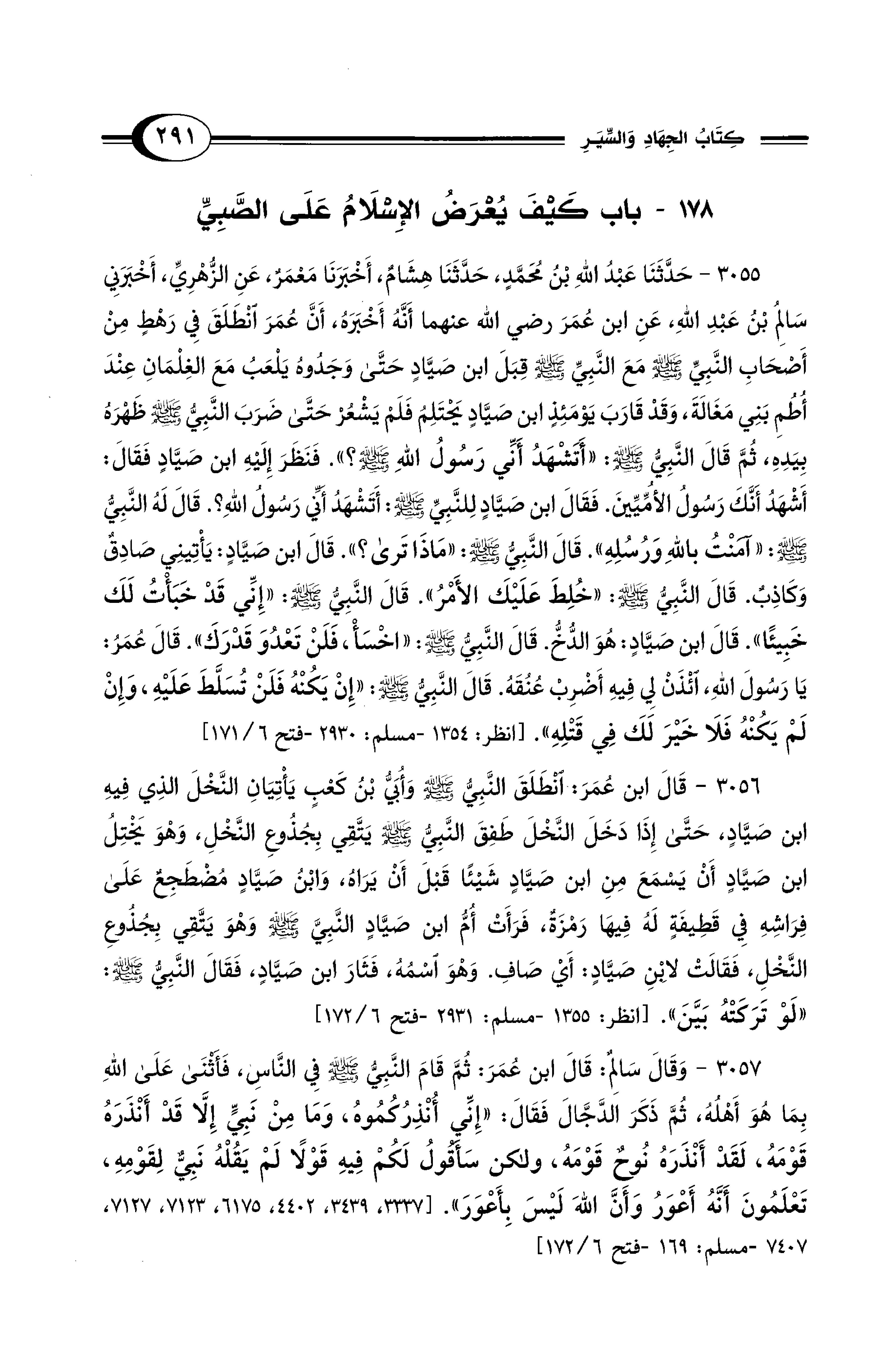 3055 - حَدَّثَنَا عَبْدُ اللهِ بْنُ مُحَمَّدٍ، حَدَّثَنَا هِشَامٌ، أَخْبَرَنَا مَعْمَرٌ، عَنِ الزُّهْرِيِّ، أَخْبَرَنِي سَالِمُ بْنُ عَبْدِ اللهِ عَنِ ابْنِ عُمَرَ - رضي الله عنهما - أَنَّهُ أَخْبَرَهُ، أَنَّ عُمَرَ انْطَلَقَ فِي رَهْطٍ مِنْ أَصْحَابِ النَّبِيِّ - صلى الله عليه وسلم - مَعَ النَّبِيِّ - صلى الله عليه وسلم - قِبَلَ ابْنِ صَيَّادٍ حَتَّى وَجَدُوهُ يَلْعَبُ مَعَ الغِلْمَانِ عِنْدَ أُطُمِ بَنِي مَغَالَةَ، وَقَدْ قَارَبَ يَوْمَئِذٍ ابْنُ صَيَّادٍ يَحْتَلِمُ، فَلَمْ يَشْعُرْ حَتَّى ضَرَبَ النَّبِيُّ - صلى الله عليه وسلم - ظَهْرَهُ بِيَدِهِ, ثُمَّ قَالَ النَّبِيُّ - صلى الله عليه وسلم -: «أَتَشْهَدُ أَنِّي رَسُولُ اللهِ - صلى الله عليه وسلم -؟». فَنَظَرَ إِلَيْهِ ابْنُ صَيَّادٍ فَقَالَ: أَشْهَدُ أَنَّكَ رَسُولُ الأُمِّيِّينَ. فَقَالَ ابْنُ صَيَّادٍ لِلنَّبِيِّ - صلى الله عليه وسلم -: أَتَشْهَدُ أَنِّي رَسُولُ اللهِ؟. قَالَ لَهُ النَّبِيُّ - صلى الله عليه وسلم -: «آمَنْتُ بِاللهِ وَرُسُلِهِ» قَالَ النَّبِيُّ - صلى الله عليه وسلم -: «مَاذَا تَرَى؟». قَالَ ابْنُ صَيَّادٍ: يَأْتِينِي صَادِقٌ وَكَاذِبٌ. قَالَ النَّبِيُّ - صلى الله عليه وسلم -: «خُلِطَ عَلَيْكَ الأَمْرُ». قَالَ النَّبِيُّ - صلى الله عليه وسلم -: «إِنِّي قَدْ خَبَأْتُ لَكَ خَبِيئًا». قَالَ ابْنُ صَيَّادٍ: هُوَ الدُّخُّ. قَالَ النَّبِيُّ - صلى الله عليه وسلم -: «اخْسَأْ, فَلَنْ تَعْدُوَ قَدْرَكَ». قَالَ عُمَرُ: يَا رَسُولَ اللهِ، ائْذَنْ لِي فِيهِ أَضْرِبْ عُنُقَهُ. قَالَ النَّبِيُّ - صلى الله عليه وسلم -: «إِنْ يَكُنْهُ فَلَنْ تُسَلَّطَ عَلَيْهِ، وَإِنْ لَمْ يَكُنْهُ فَلاَ خَيْرَ لَكَ فِي قَتْلِهِ». [انظر: 1354 - مسلم: 2930 - فتح 6/ 171]