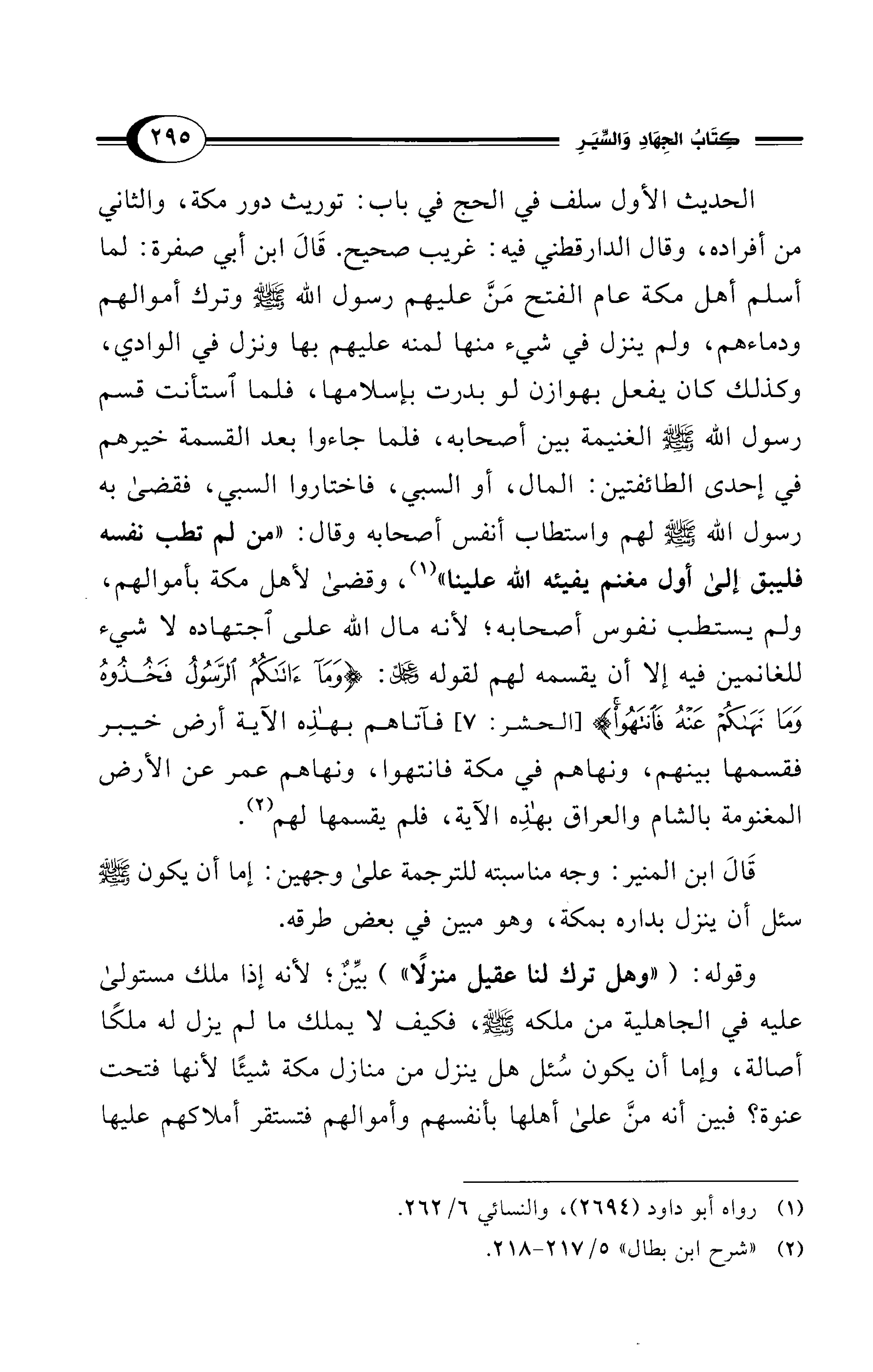 الحديث الأول سلف في الحج في باب: توريث دور مكة، والثاني من أفراده، وقال الدارقطني فيه: غريب صحيح. قَالَ ابن أبي صفرة: لما أسلم أهل مكة عام الفتح مَنَّ عليهم رسول الله - صلى الله عليه وسلم - وترك أموالهم ودماءهم، ولم ينزل في شيء منها لمنه عليهم بها ونزل في الوادي، وكذلك كان يفعل بهوازن لو بدرت بإسلامها، فلما استأنت قسم رسول الله - صلى الله عليه وسلم - الغنيمة بين أصحابه، فلما جاءوا بعد القسمة خيرهم في إحدى الطائفتين: المال، أو السبي، فاختاروا النبي، فقضى به رسول الله - صلى الله عليه وسلم - لهم واستطاب أنفس أصحابه وقال: "من لم تطب نفسه فليبق إلى أول مغنم يفيئه الله علينا" (¬1)، وقضى لأهل مكة بأموالهم، ولم يستطب نفوس أصحابه؛ لأنه مال الله على اجتهاده لا شيء للغانمين فيه إلا أن يقسمه لهم لقوله -عَزَّ وَجَلَّ-: {وَمَا آتَاكُمُ الرَّسُولُ فَخُذُوهُ وَمَا نَهَاكُمْ عَنْهُ فَانْتَهُوا} [الحشر: 7] فآتاهم بهذِه الآية أرض خيبر فقسمها بينهم، ونهاهم في مكة فانتهوا، ونهاهم عمر عن الأرض المغنومة بالشام والعراق بهذِه الآية، فلم يقسمها لهم (¬2).