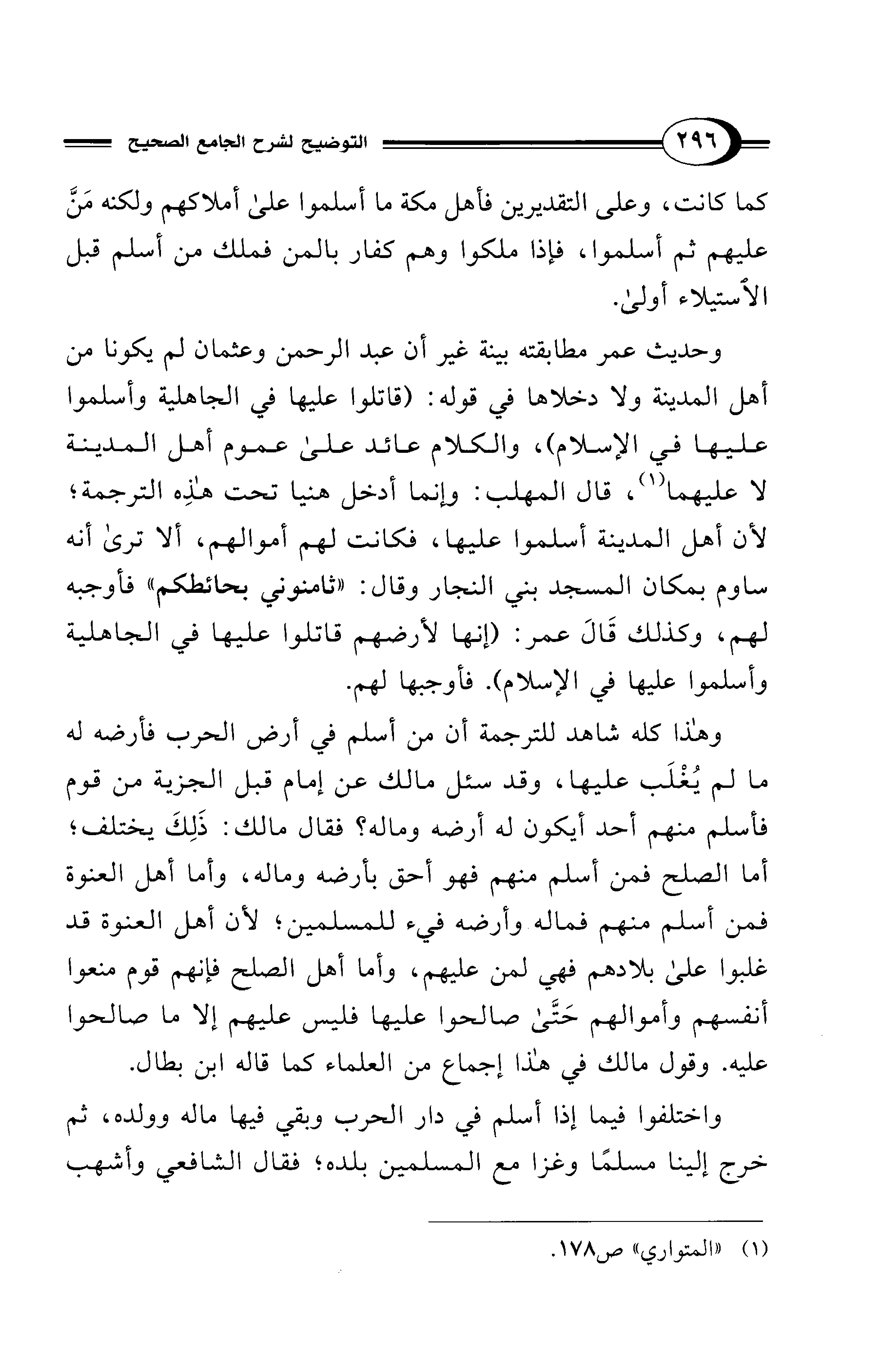 وهذا كله شاهد للترجمة أن من أسلم في أرض الحرب فأرضه له ما لم يُغْلَب عليها، وقد سئل مالك عن إمام قبل الجزية من قوم فأسلم منهم أحد أيكون له أرضه وماله؟ فقال مالك: ذَلِكَ يختلف؛