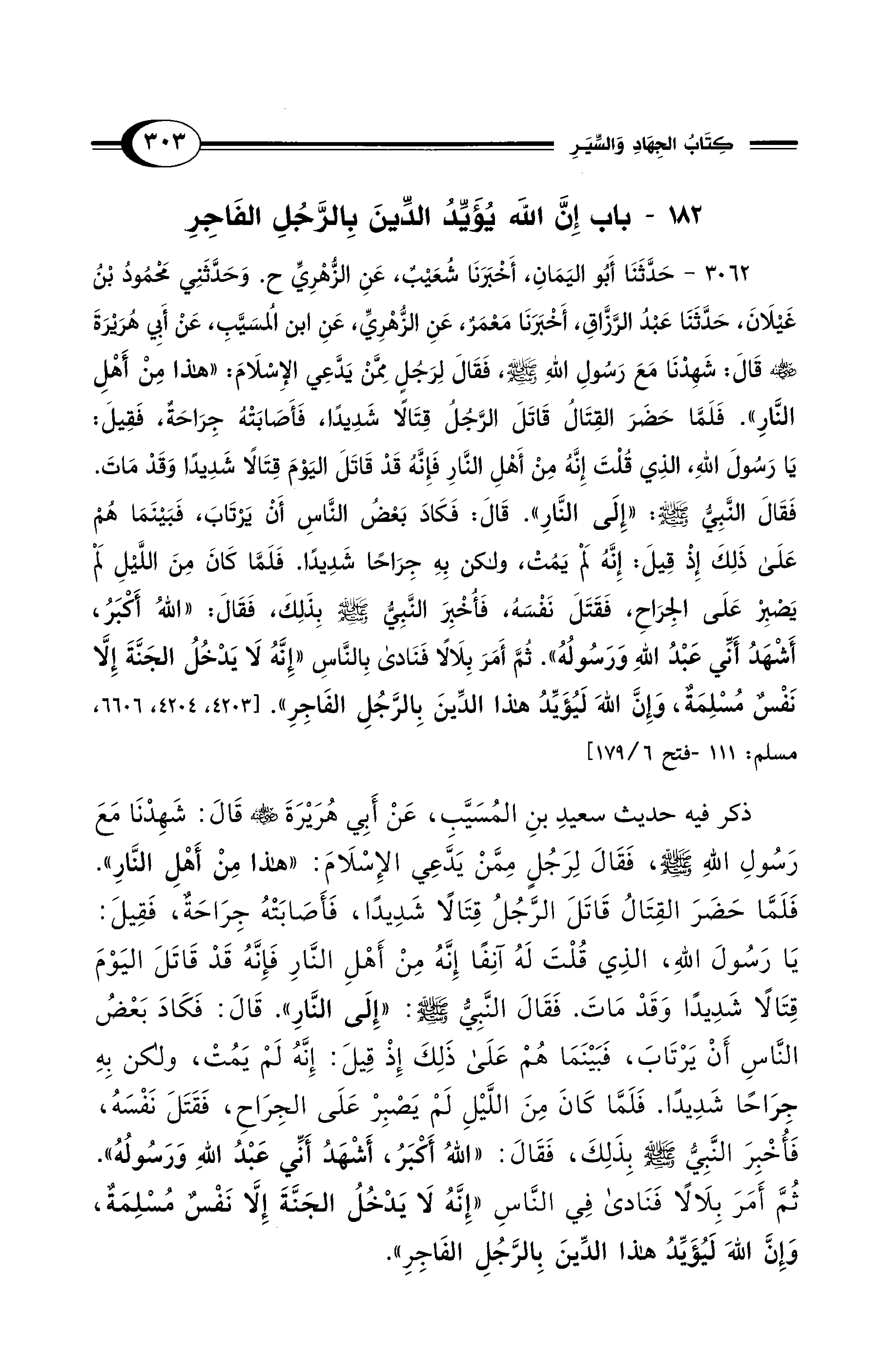 ذكر فيه حديث سعيدِ بنِ المُسَيَّبِ، عَنْ أَبِي هُرَيْرَةَ - رضي الله عنه - قَالَ: شَهِدْنَا مَعَ رَسُولِ اللهِ - صلى الله عليه وسلم -، فَقَالَ لِرَجُلٍ مِمَّنْ يَدَّعِي الإِسْلَامَ: "هذا مِنْ أَهْلِ النَّارِ". فَلَمَّا حَضَرَ القِتَالُ قَاتَلَ الرَّجُلُ قِتَالًا شَدِيدًا، فَأَصَابَتْهُ جِرَاحَة، فَقِيلَ: يَا رَسُولَ اللهِ، الذِي قُلْتَ لَهُ آنِفًا إِنَّهُ مِنْ أَهْلِ النَّارِ فَإِنَّهُ قَدْ قَاتَلَ اليَوْمَ قِتَالًا شَدِيدًا وَقَدْ مَاتَ. فَقَالَ النَّبِيُّ - صلى الله عليه وسلم -: "إِلَى النَّارِ". قَالَ: فَكَادَ بَعْضُ النَّاسِ أَنْ يَرْتَابَ، فَبَيْنَمَا هُمْ عَلَى ذَلِكَ إِذْ قِيلَ: إِنَّهُ لَمْ يَمُتْ، ولكن بِهِ جِرَاحًا شَدِيدًا. فَلَمَّا كَانَ مِنَ اللَّيْلِ لَمْ يَصْبِرْ عَلَى الجِرَاحِ، فَقَتَلَ نَفْسَهُ، فَأُخْبِرَ النَّبِيُّ - صلى الله عليه وسلم - بِذَلِكَ، فَقَالَ: "اللهُ أَكبَرُ، أَشْهَدُ أَنِّي عَبْدُ اللهِ وَرَسُولُهُ". ثُمَّ أَمَرَ بِلَالًا فَنَادى فِي النَّاسِ "إِنَّهُ لَا يدخلُ الجَنَّةَ إِلَّا نَفْسٌ مُسْلِمَةٌ، وَإِنَّ الله لَيُؤَيِّدُ هذا الدِّينَ بِالرَّجُلِ الفَاجِرِ".