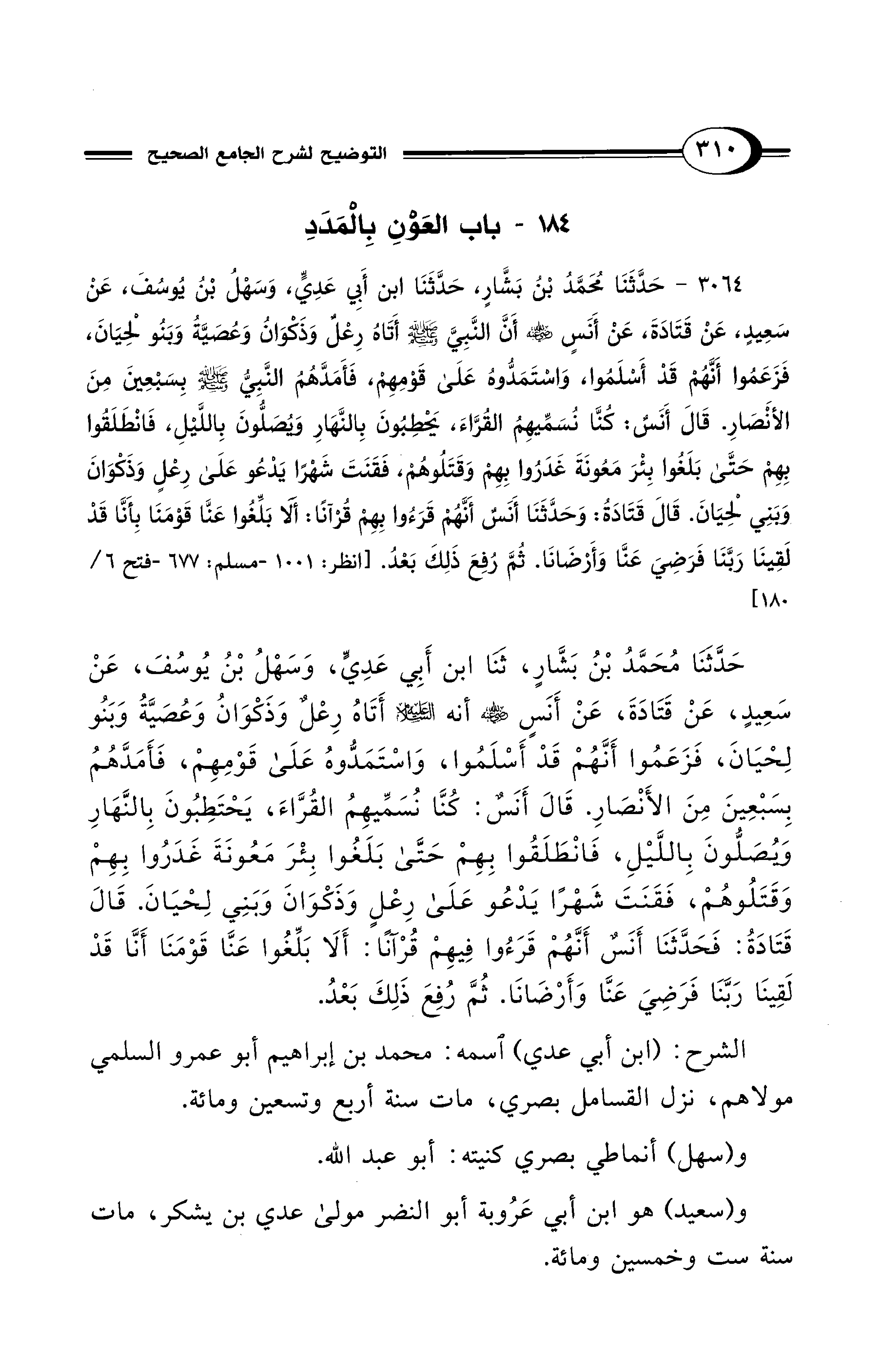 حَدَّثنَا مُحَمَّدُ بْنُ بَشَّارٍ، ثَنَا ابن أَبِي عَدِي، وَسهْلُ بْنُ يُوسُفَ، عَنْ سَعِيدٍ، عَنْ قَتَادَةَ، عَنْ أَنَسٍ - رضي الله عنه - أنه - صلى الله عليه وسلم - أَتَاهُ رِعْلٌ وَذَكْوَانُ وَعُصَيَّةُ وَبَنُو لِحْيَانَ، فَزَعَمُوا أَنَّهُمْ قَدْ أَسْلَمُوا، وَاسْتَمَدُّوهُ عَلَى قَوْمِهِمْ، فَأَمَدَّهُمُ بِسَبْعِينَ مِنَ الأَنْصَارِ. قَالَ أَنَسٌ: كُنَّا نُسَمِّيهِمُ القُرَّاءَ، يَحْتَطِبُونَ بِالنَّهَارِ وَيُصَلُّونَ بِاللَّيْلِ، فَانْطَلَقُوا بِهِمْ حَتَّى بَلَغُوا بِئْرَ مَعُونَةَ غَدَرُوا بِهِمْ وَقَتَلُوهُمْ، فَقَنَتَ شَهْرًا يَدْعُو عَلَى رِعْلٍ وَذَكْوَانَ وَبَنِي لِحْيَانَ. قَالَ قَتَادَةُ: فَحَدَّثَنَا أَنَسٌ أَنَّهُمْ قَرَءُوا فِيهِمْ قُرْآنًا: أَلَا بَلِّغُوا عَنَّا قَوْمَنَا أَنَّا قَدْ لَقِينَا رَبَّنَا فَرَضِيَ عَنَّا وَأَرْضَانَا. ثُمَّ رُفِعَ ذَلِكَ بَعْدُ.