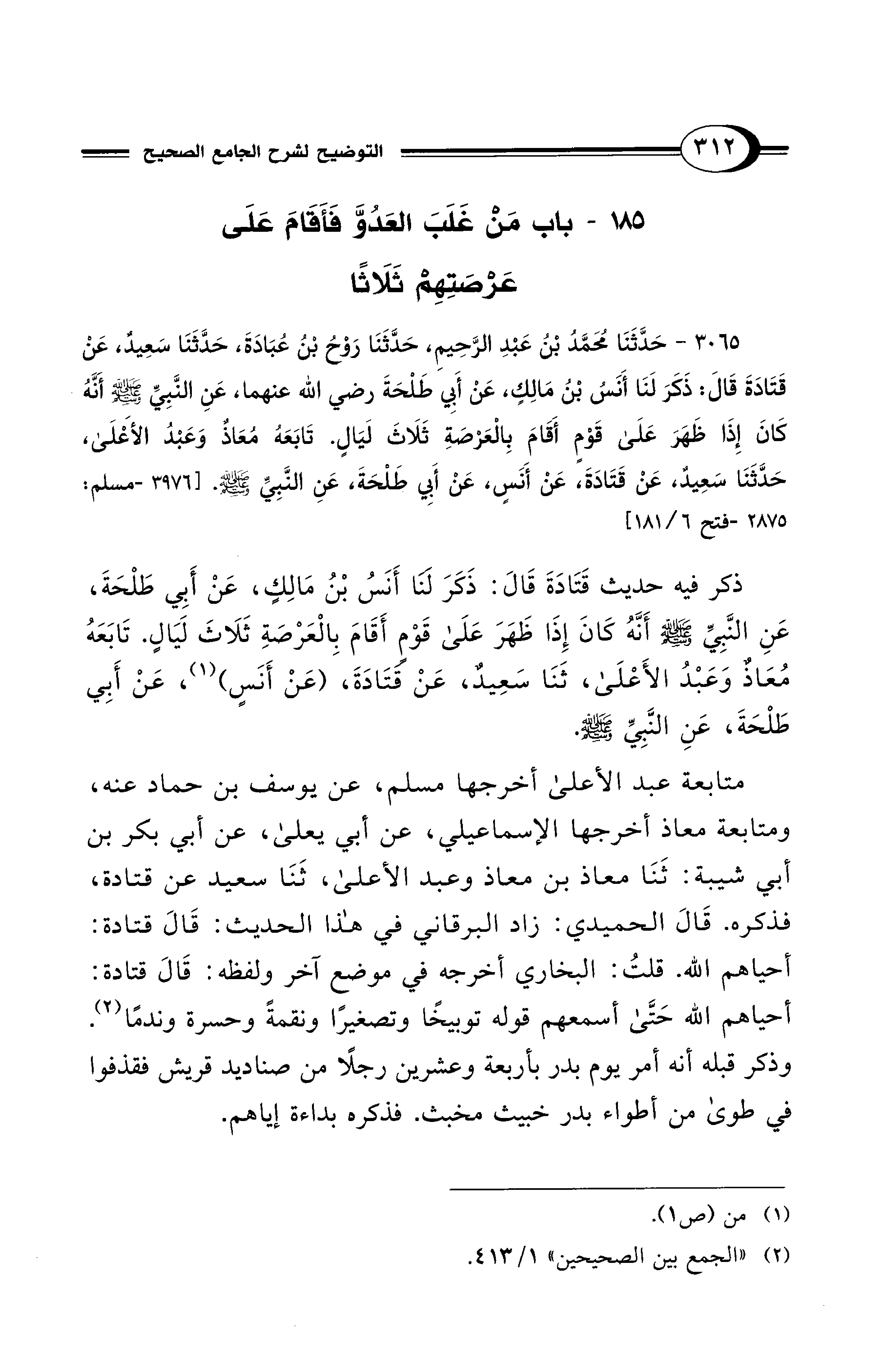 3065 - حَدَّثَنَا مُحَمَّدُ بْنُ عَبْدِ الرَّحِيمِ، حَدَّثَنَا رَوْحُ بْنُ عُبَادَةَ، حَدَّثَنَا سَعِيدٌ، عَنْ قَتَادَةَ قَالَ: ذَكَرَ لَنَا أَنَسُ بْنُ مَالِكٍ، عَنْ أَبِي طَلْحَةَ - رضي الله عنهما - عَنِ النَّبِيِّ - صلى الله عليه وسلم - أَنَّهُ كَانَ إِذَا ظَهَرَ عَلَى قَوْمٍ أَقَامَ بِالْعَرْصَةِ ثَلاَثَ لَيَالٍ. تَابَعَهُ مُعَاذٌ وَعَبْدُ الأَعْلَى حَدَّثَنَا سَعِيدٌ عَنْ قَتَادَةَ عَنْ أَنَسٍ عَنْ أَبِي طَلْحَةَ عَنِ النَّبِيِّ - صلى الله عليه وسلم -. [3976 - مسلم: 2875 - فتح 6/ 181]