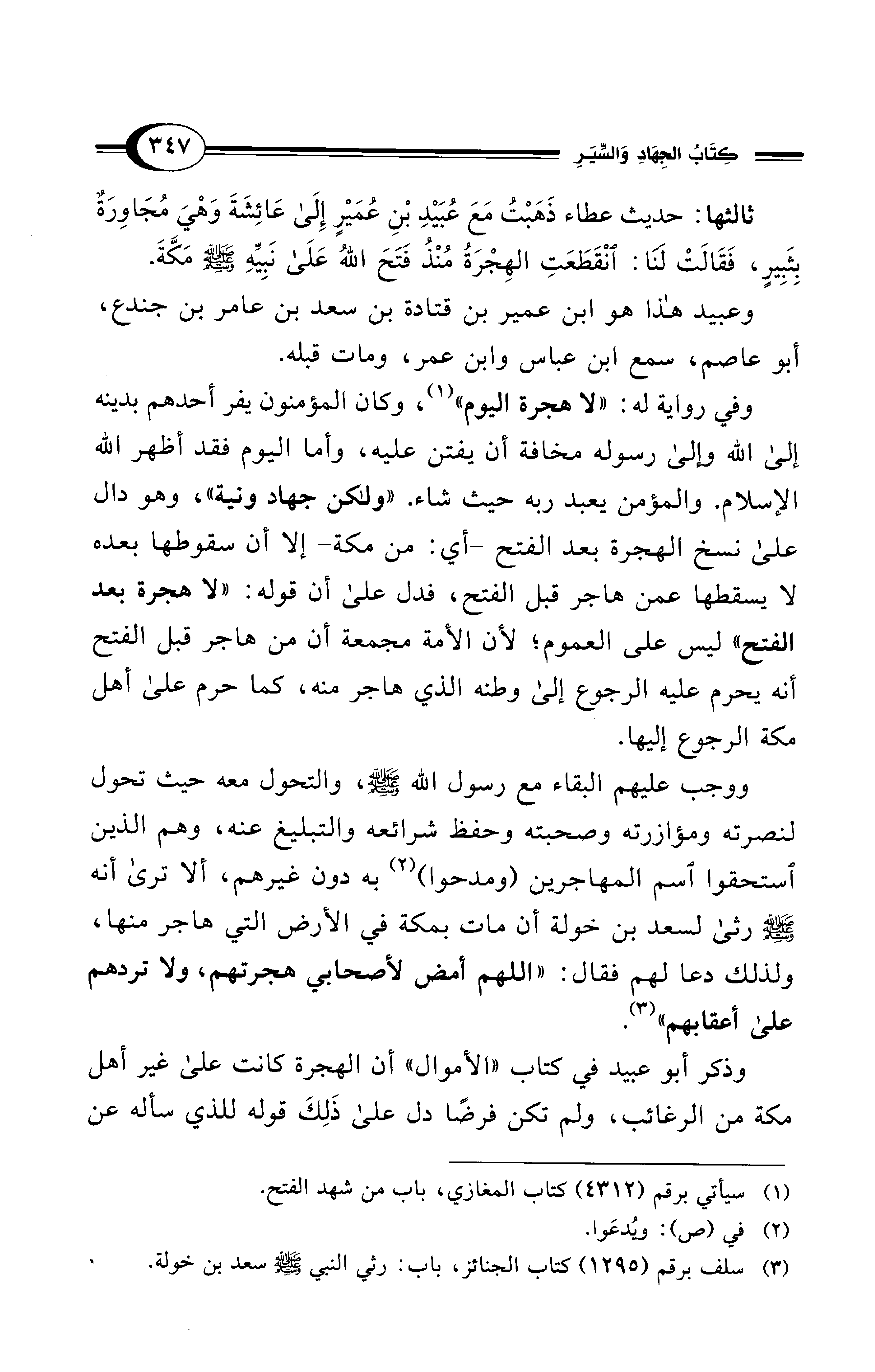 ثالثها: حديث عطاء ذَهَبْتُ مَعَ عُبَيْدِ بْنِ عُمَيْرٍ إلى عَائِشَةَ وَهْيَ مُجَاوِرَةٌ بِثَبِيرٍ، فَقَالَتْ لنَا: انْقَطَعَتِ الهِجْرَةُ مُنْذُ فَتَحَ اللهُ عَلَى نَبِيِّهِ - صلى الله عليه وسلم - مَكَّةَ.