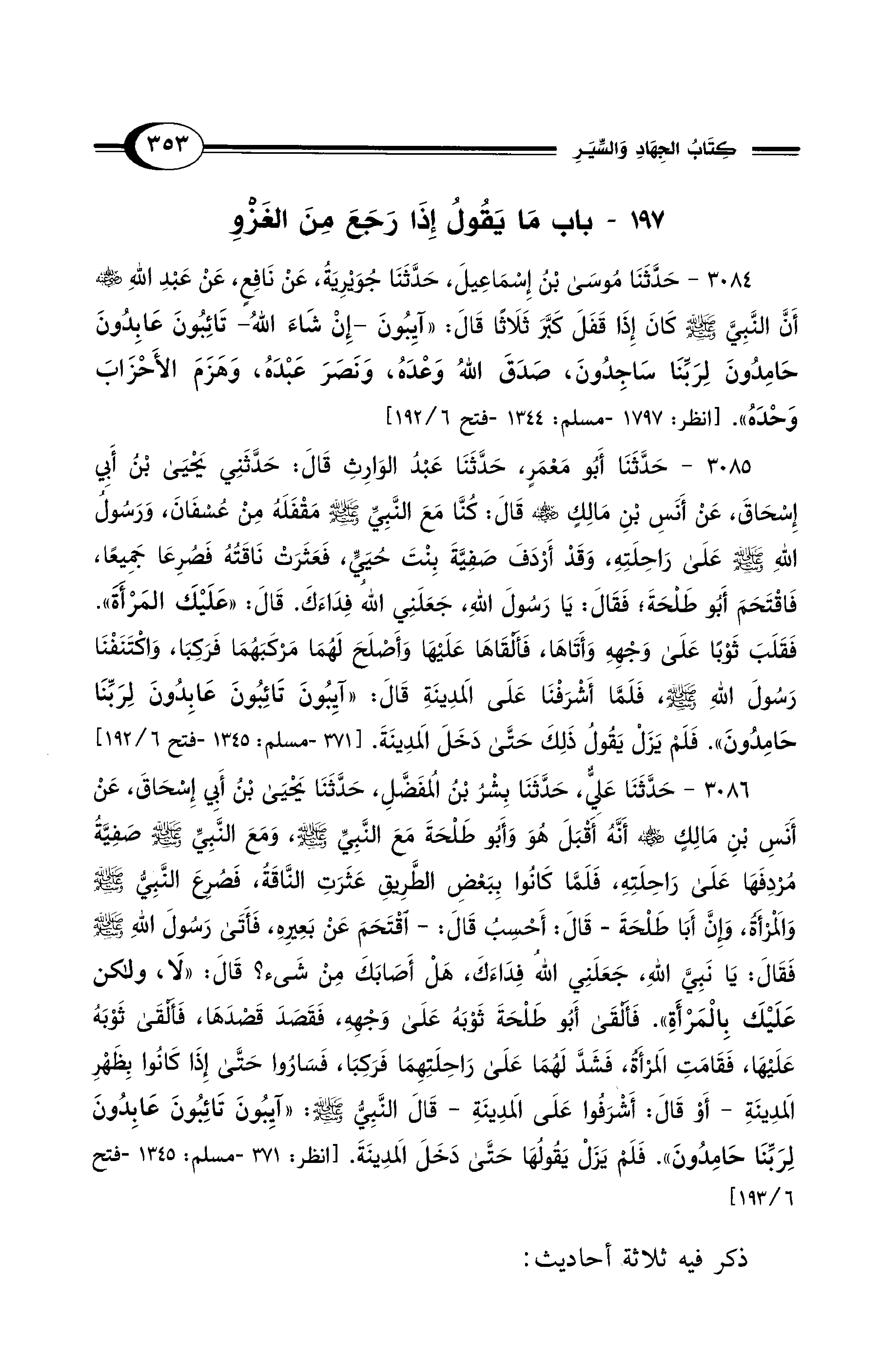 3085 - حَدَّثَنَا أَبُو مَعْمَرٍ، حَدَّثَنَا عَبْدُ الْوَارِثِ قَالَ: حَدَّثَنِي يَحْيَى بْنُ أَبِي إِسْحَاقَ، عَنْ أَنَسِ بْنِ مَالِكٍ - رضي الله عنه - قَالَ: كُنَّا مَعَ النَّبِيِّ - صلى الله عليه وسلم - مَقْفَلَهُ مِنْ عُسْفَانَ، وَرَسُولُ اللهِ - صلى الله عليه وسلم - عَلَى رَاحِلَتِهِ، وَقَدْ أَرْدَفَ صَفِيَّةَ بِنْتَ حُيَيٍّ، فَعَثَرَتْ نَاقَتُهُ فَصُرِعَا جَمِيعًا، فَاقْتَحَمَ أَبُو طَلْحَةَ فَقَالَ: يَا رَسُولَ اللهِ، جَعَلَنِي الله فِدَاءَكَ. قَالَ: «عَلَيْكَ المَرْأَةَ». فَقَلَبَ ثَوْبًا عَلَى وَجْهِهِ وَأَتَاهَا، فَأَلْقَاهَا عَلَيْهَا وَأَصْلَحَ لَهُمَا مَرْكَبَهُمَا فَرَكِبَا، وَاكْتَنَفْنَا رَسُولَ اللهِ - صلى الله عليه وسلم -، فَلَمَّا أَشْرَفْنَا عَلَى المَدِينَةِ قَالَ: «آيِبُونَ تَائِبُونَ عَابِدُونَ لِرَبِّنَا حَامِدُونَ». فَلَمْ يَزَلْ يَقُولُ ذَلِكَ حَتَّى دَخَلَ المَدِينَةَ. [371 - مسلم: 1345 - فتح 6/ 192]