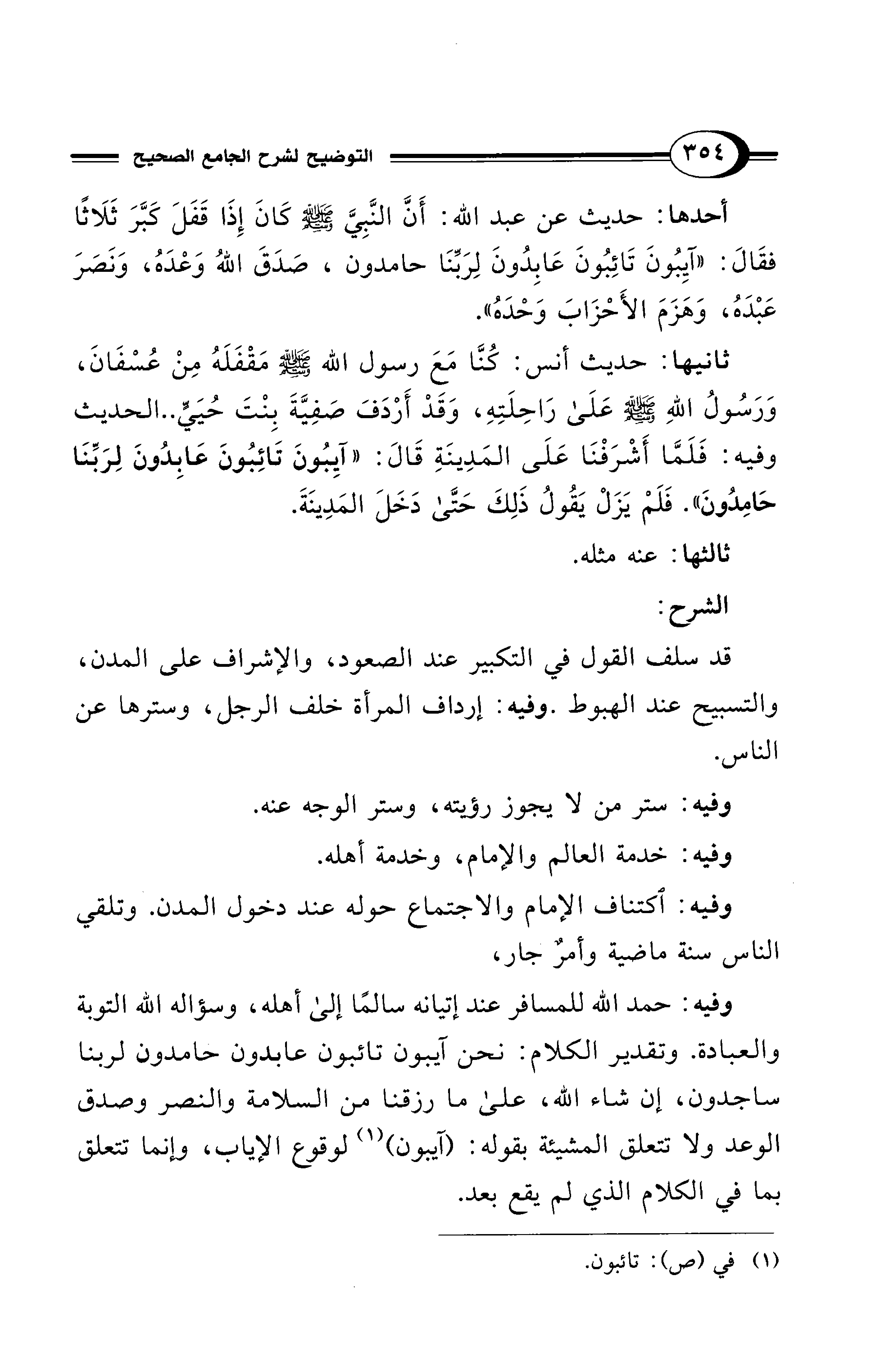 ثانيها: حديث أنس: كُنَّا مَعَ رسول الله - صلى الله عليه وسلم - مَقْفَلَهُ مِنْ عُسْفَانَ، وَرَسُولُ اللهِ - صلى الله عليه وسلم - عَلَى رَاحِلَتِهِ، وَقَدْ أَرْدَفَ صَفِيَّةَ بِنْتَ حُيَيٍّ .. الحديث وفيه: فَلَمَّا أَشْرَفْنَا عَلَى المَدِينَةِ قَالَ: "آيِبُونَ تَائِبُونَ عَابِدُونَ لِرَبِّنَا حَامِدُونَ". فَلَمْ يَزَلْ يَقُولُ ذَلِكَ حَتَّى دَخَلَ المَدِينَةَ.