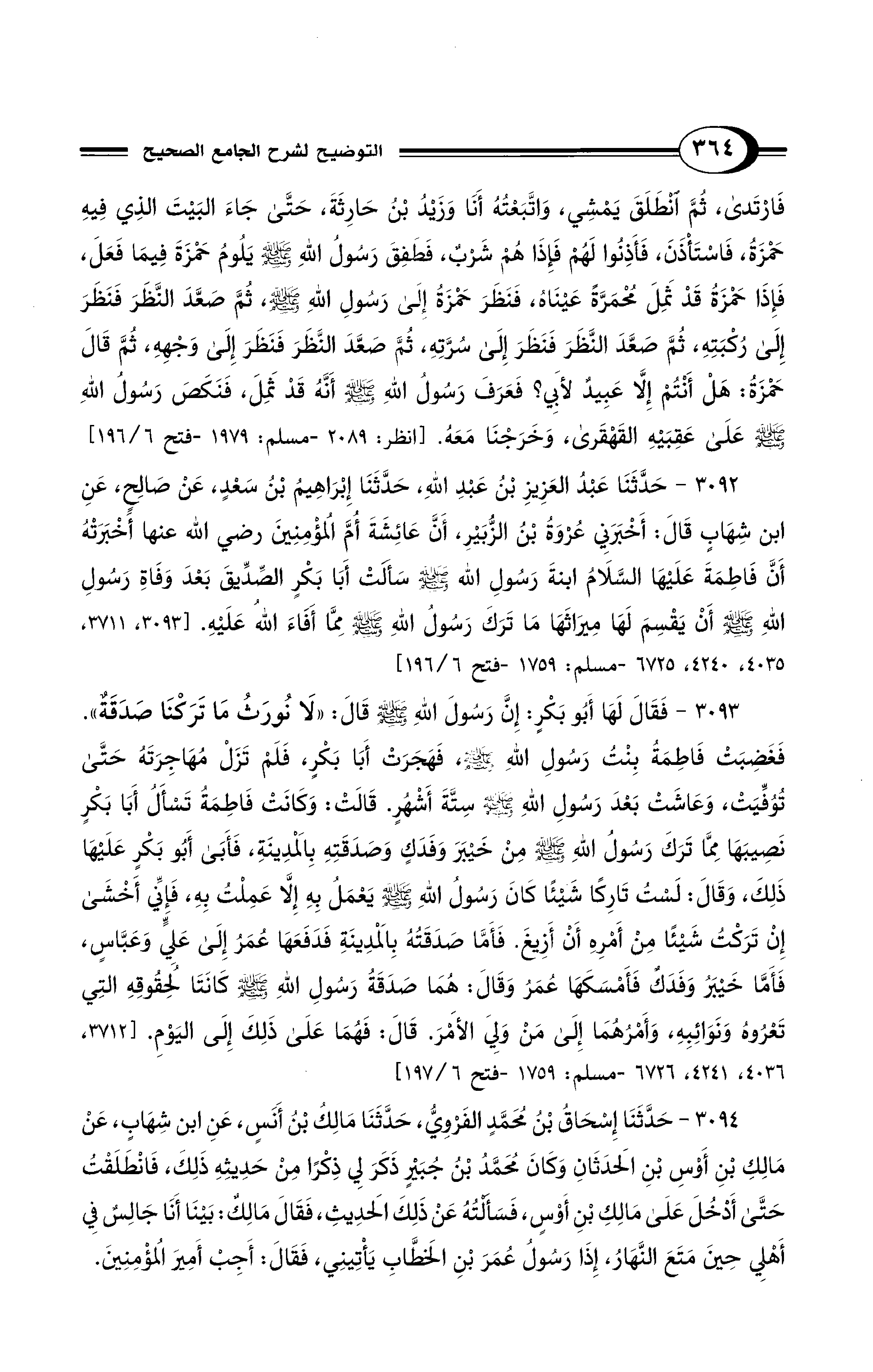 3092 - حَدَّثَنَا عَبْدُ العَزِيزِ بْنُ عَبْدِ اللهِ، حَدَّثَنَا إِبْرَاهِيمُ بْنُ سَعْدٍ، عَنْ صَالِحٍ، عَنِ ابْنِ شِهَابٍ قَالَ: أَخْبَرَنِي عُرْوَةُ بْنُ الزُّبَيْرِ، أَنَّ عَائِشَةَ أُمَّ الْمُؤْمِنِينَ - رضي الله عنها - أَخْبَرَتْهُ أَنَّ فَاطِمَةَ - عَلَيْهَا السَّلاَمُ - ابْنَةَ رَسُولِ اللهِ - صلى الله عليه وسلم - سَأَلَتْ أَبَا بَكْرٍ الصِّدِّيقَ بَعْدَ وَفَاةِ رَسُولِ اللهِ - صلى الله عليه وسلم - أَنْ يَقْسِمَ لَهَا مِيرَاثَهَا، مَا تَرَكَ رَسُولُ اللهِ - صلى الله عليه وسلم - مِمَّا أَفَاءَ الله عَلَيْهِ. [3093، 3711،4035، 4240، 6725 - مسلم: 1759 - فتح 6/ 196]