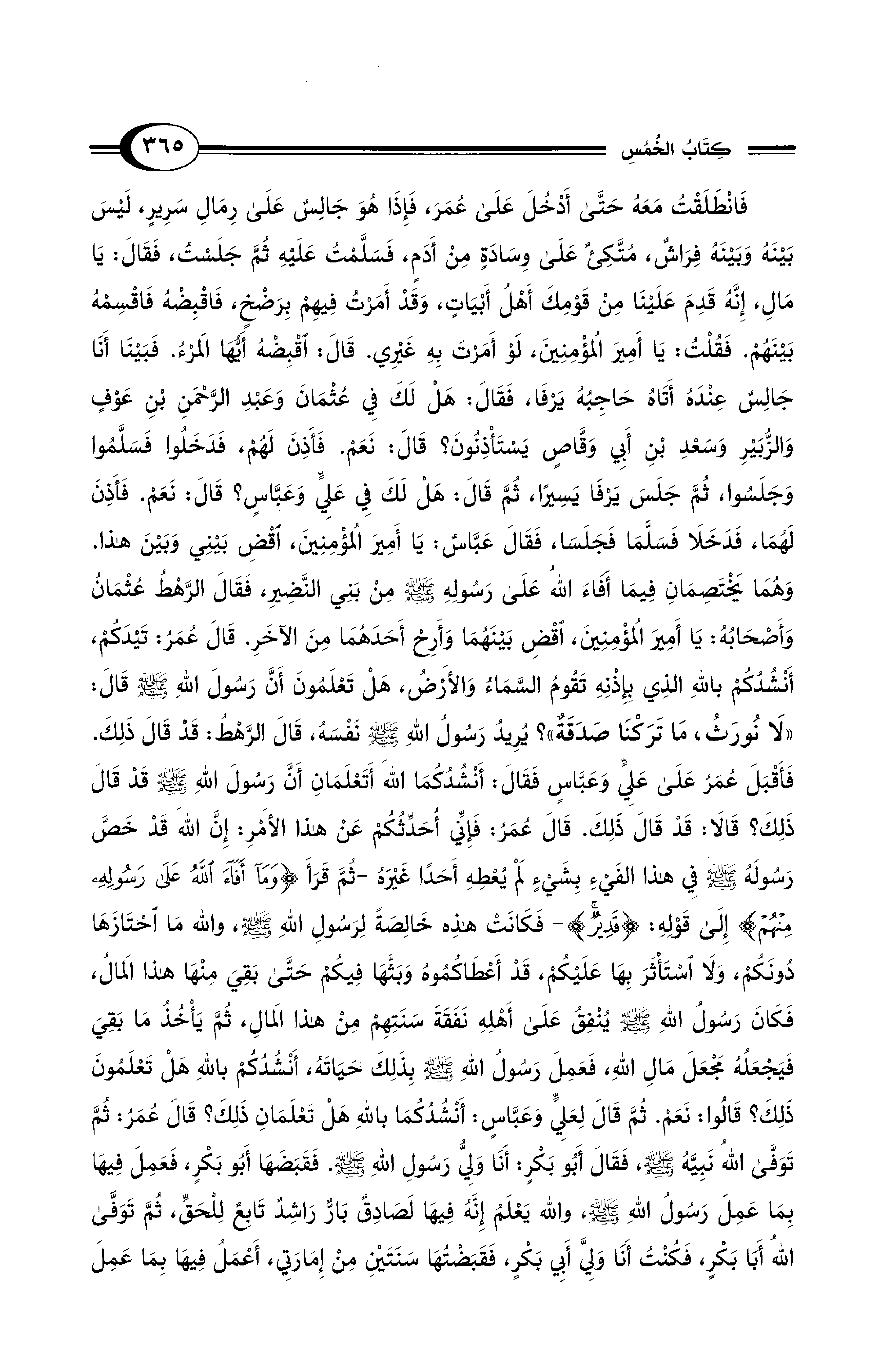 فَانْطَلَقْتُ مَعَهُ حَتَّى أَدْخُلَ عَلَى عُمَرَ، فَإِذَا هُوَ جَالِسٌ عَلَى رِمَالِ سَرِيرٍ، لَيْسَ بَيْنَهُ وَبَيْنَهُ فِرَاشٌ مُتَّكِئٌ عَلَى وِسَادَةٍ مِنْ أَدَمٍ، فَسَلَّمْتُ عَلَيْهِ ثُمَّ جَلَسْتُ فَقَالَ: يَا مَالِ، إِنَّهُ قَدِمَ عَلَيْنَا مِنْ قَوْمِكَ أَهْلُ أَبْيَاتٍ، وَقَدْ أَمَرْتُ فِيهِمْ بِرَضْخٍ فَاقْبِضْهُ فَاقْسِمْهُ بَيْنَهُمْ. فَقُلْتُ: يَا أَمِيرَ الْمُؤْمِنِينَ، لَوْ أَمَرْتَ بِهِ غَيْرِي. قَالَ: اقْبِضْهُ أَيُّهَا المَرْءُ. فَبَيْنَا أَنَا جَالِسٌ عِنْدَهُ أَتَاهُ حَاجِبُهُ يَرْفَا فَقَالَ: هَلْ لَكَ فِي عُثْمَانَ وَعَبْدِ الرَّحْمَنِ بْنِ عَوْفٍ وَالزُّبَيْرِ وَسَعْدِ بْنِ أَبِي وَقَّاصٍ يَسْتَأْذِنُونَ؟ قَالَ: نَعَمْ. فَأَذِنَ لَهُمْ فَدَخَلُوا فَسَلَّمُوا وَجَلَسُوا، ثُمَّ جَلَسَ يَرْفَا يَسِيرًا ثُمَّ قَالَ: هَلْ لَكَ فِي عَلِيٍّ وَعَبَّاسٍ؟ قَالَ: نَعَمْ. فَأَذِنَ لَهُمَا، فَدَخَلاَ فَسَلَّمَا فَجَلَسَا، فَقَالَ عَبَّاسٌ: يَا أَمِيرَ الْمُؤْمِنِينَ، اقْضِ بَيْنِي وَبَيْنَ هَذَا. وَهُمَا يَخْتَصِمَانِ فِيمَا أَفَاءَ الله عَلَى رَسُولِهِ - صلى الله عليه وسلم - مِنْ بَنِي النَّضِيرِ. فَقَالَ الرَّهْطُ عُثْمَانُ وَأَصْحَابُهُ: يَا أَمِيرَ الْمُؤْمِنِينَ، اقْضِ بَيْنَهُمَا وَأَرِحْ أَحَدَهُمَا مِنَ الآخَرِ. قَالَ عُمَرُ: تَيْدَكُمْ، أَنْشُدُكُمْ بِاللهِ الذِي بِإِذْنِهِ تَقُومُ السَّمَاءُ وَالأَرْضُ، هَلْ تَعْلَمُونَ أَنَّ رَسُولَ اللهِ - صلى الله عليه وسلم - قَالَ: «لاَ نُورَثُ مَا تَرَكْنَا صَدَقَةٌ»؟. يُرِيدُ رَسُولُ اللهِ - صلى الله عليه وسلم - نَفْسَهُ. قَالَ الرَّهْطُ: قَدْ قَالَ ذَلِكَ. فَأَقْبَلَ عُمَرُ عَلَى عَلِيٍّ وَعَبَّاسٍ فَقَالَ: أَنْشُدُكُمَا اللهَ، أَتَعْلَمَانِ أَنَّ رَسُولَ اللهِ - صلى الله عليه وسلم - قَدْ قَالَ ذَلِكَ؟ قَالاَ: قَدْ قَالَ ذَلِكَ. قَالَ عُمَرُ: فَإِنِّي أُحَدِّثُكُمْ عَنْ هَذَا الأَمْرِ: إِنَّ اللهَ قَدْ خَصَّ رَسُولَهُ - صلى الله عليه وسلم - فِي هَذَا الفَيْءِ بِشَيْءٍ لَمْ يُعْطِهِ أَحَدًا غَيْرَهُ -ثُمَّ قَرَأَ {وَمَا أَفَاءَ الله عَلَى رَسُولِهِ مِنْهُمْ} إِلَى قَوْلِهِ: {قَدِيرٌ} - فَكَانَتْ هَذِهِ خَالِصَةً لِرَسُولِ اللهِ - صلى الله عليه وسلم -. وَاللهِ مَا احْتَازَهَا دُونَكُمْ، وَلاَ اسْتَأْثَرَ بِهَا عَلَيْكُمْ قَدْ أَعْطَاكُمُوهُ، وَبَثَّهَا فِيكُمْ حَتَّى بَقِيَ مِنْهَا هَذَا الْمَالُ، فَكَانَ رَسُولُ اللهِ - صلى الله عليه وسلم - يُنْفِقُ عَلَى أَهْلِهِ نَفَقَةَ سَنَتِهِمْ مِنْ هَذَا المَالِ، ثُمَّ يَأْخُذُ مَا بَقِيَ فَيَجْعَلُهُ مَجْعَلَ مَالِ اللهِ، فَعَمِلَ رَسُولُ اللهِ - صلى الله عليه وسلم - بِذَلِكَ حَيَاتَهُ، أَنْشُدُكُمْ بِاللهِ هَلْ تَعْلَمُونَ ذَلِكَ؟ قَالُوا: نَعَمْ. ثُمَّ قَالَ لِعَلِيٍّ وَعَبَّاسٍ: أَنْشُدُكُمَا بِاللهِ هَلْ تَعْلَمَانِ ذَلِكَ؟ قَالَ عُمَرُ: ثُمَّ تَوَفَّى الله نَبِيَّهُ - صلى الله عليه وسلم - فَقَالَ أَبُو بَكْرٍ: أَنَا وَلِيُّ رَسُولِ اللهِ - صلى الله عليه وسلم -. فَقَبَضَهَا أَبُو بَكْرٍ، فَعَمِلَ فِيهَا بِمَا عَمِلَ رَسُولُ اللهِ - صلى الله عليه وسلم -، وَاللهُ يَعْلَمُ إِنَّهُ فِيهَا لَصَادِقٌ بَارٌّ رَاشِدٌ تَابِعٌ لِلْحَقِّ، ثُمَّ تَوَفَّى الله أَبَا بَكْرٍ، فَكُنْتُ أَنَا وَلِىَّ أَبِي بَكْرٍ، فَقَبَضْتُهَا سَنَتَيْنِ مِنْ إِمَارَتِي، أَعْمَلُ فِيهَا بِمَا عَمِلَ