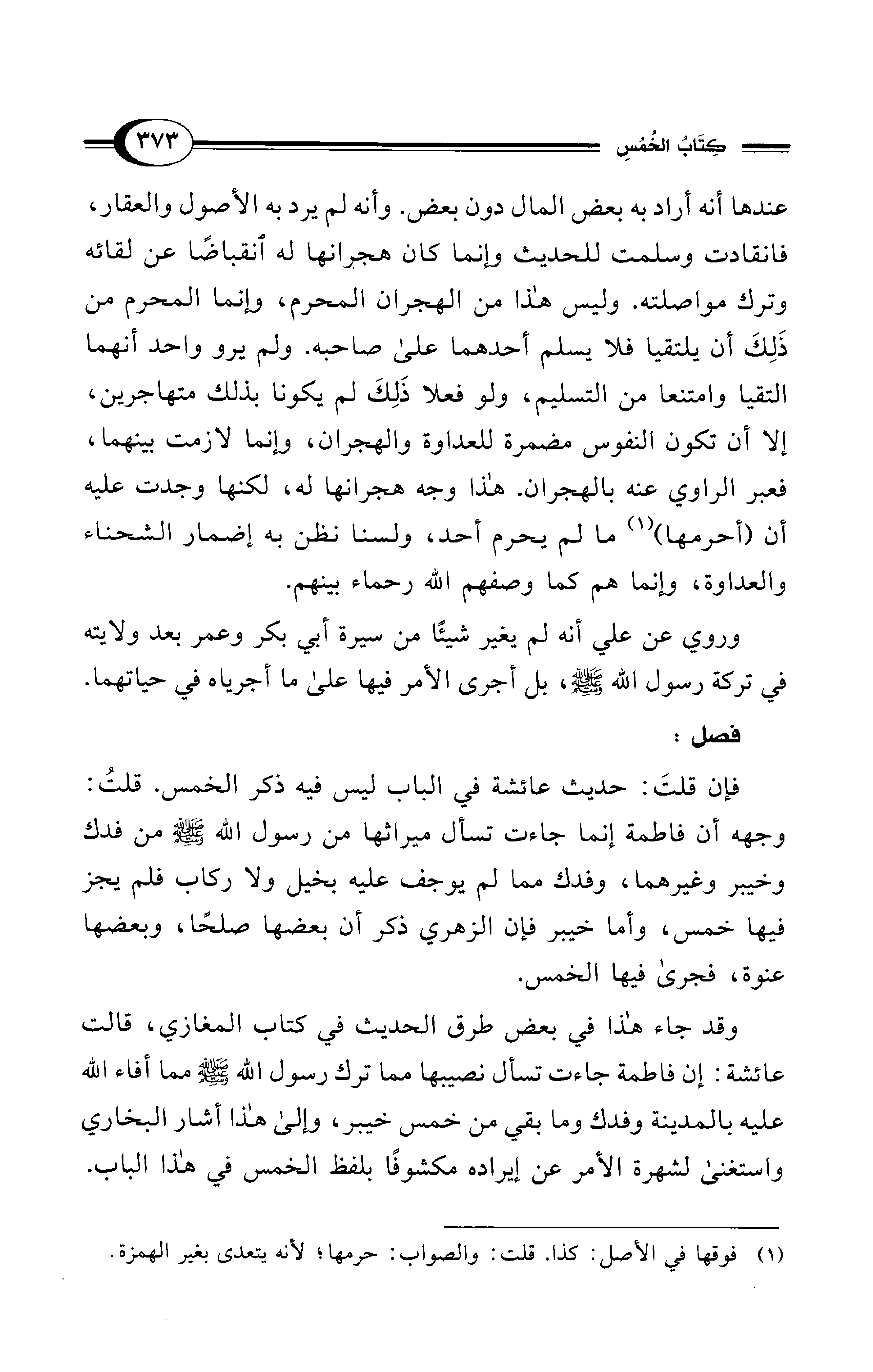 عندها أنه أراد به بعض المال دون بعض. وأنه لم يرد به الأصول والعقار، فانقادت وسلمت للحديث وإنما كان هجرانها له انقباضًا عن لقائه وترك مواصلته. وليس هذا من الهجران المحرم، وإنما المحرم من ذَلِكَ أن يلتقيا فلا يسلم أحدهما على صاحبه. ولم يرو واحد أنهما التقيا وامتنعا من التسليم، ولو فعلا ذَلِكَ لم يكونا بذلك متهاجرين، إلا أن تكون النفوس مضمرة للعداوة والهجران، وإنما لازمت بينهما، فعبر الراوي عنه بالهجران. هذا وجه هجرانها له، لكنها وجدت عليه أن (أحرمها) (¬1) ما لم يحرم أحد، ولسنا نظن به إضمار الشحناء والعداوة، وإنما هم كما وصفهم الله رحماء بينهم.