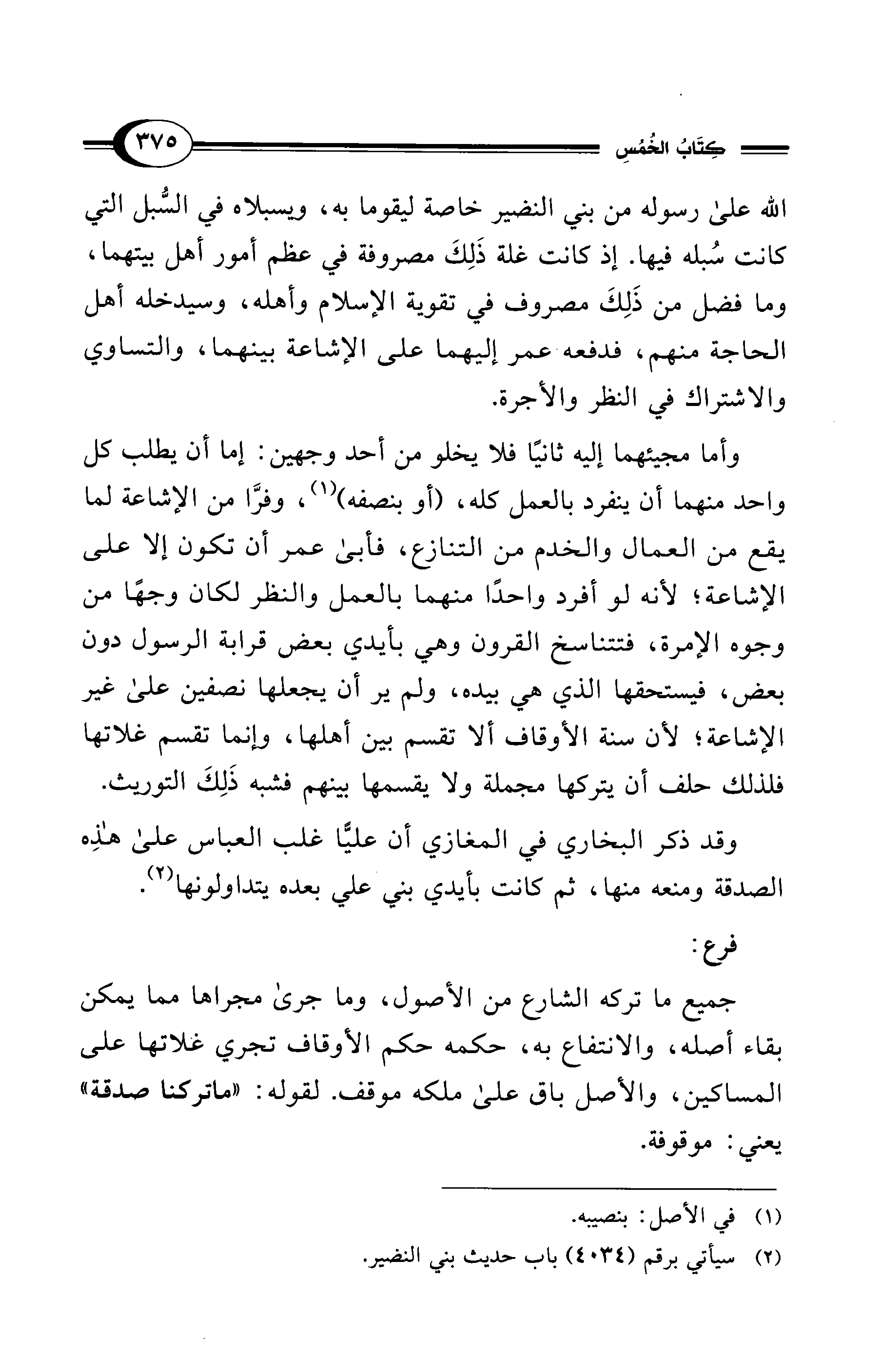 الله على رسوله من بني النضير خاصة ليقوما به، ويسبلاه في السُّبل التي كانت سُبله فيها. إذ كانت غلة ذَلِكَ مصروفة في عظم أمور أهل بيتهما، وما فضل من ذَلِكَ مصروف في تقوية الإسلام وأهله، وسيدخله أهل الحاجة منهم، فدفعه عمر إليهما على الإشاعة بينهما، والتساوي والاشتراك في النظر والأجرة.