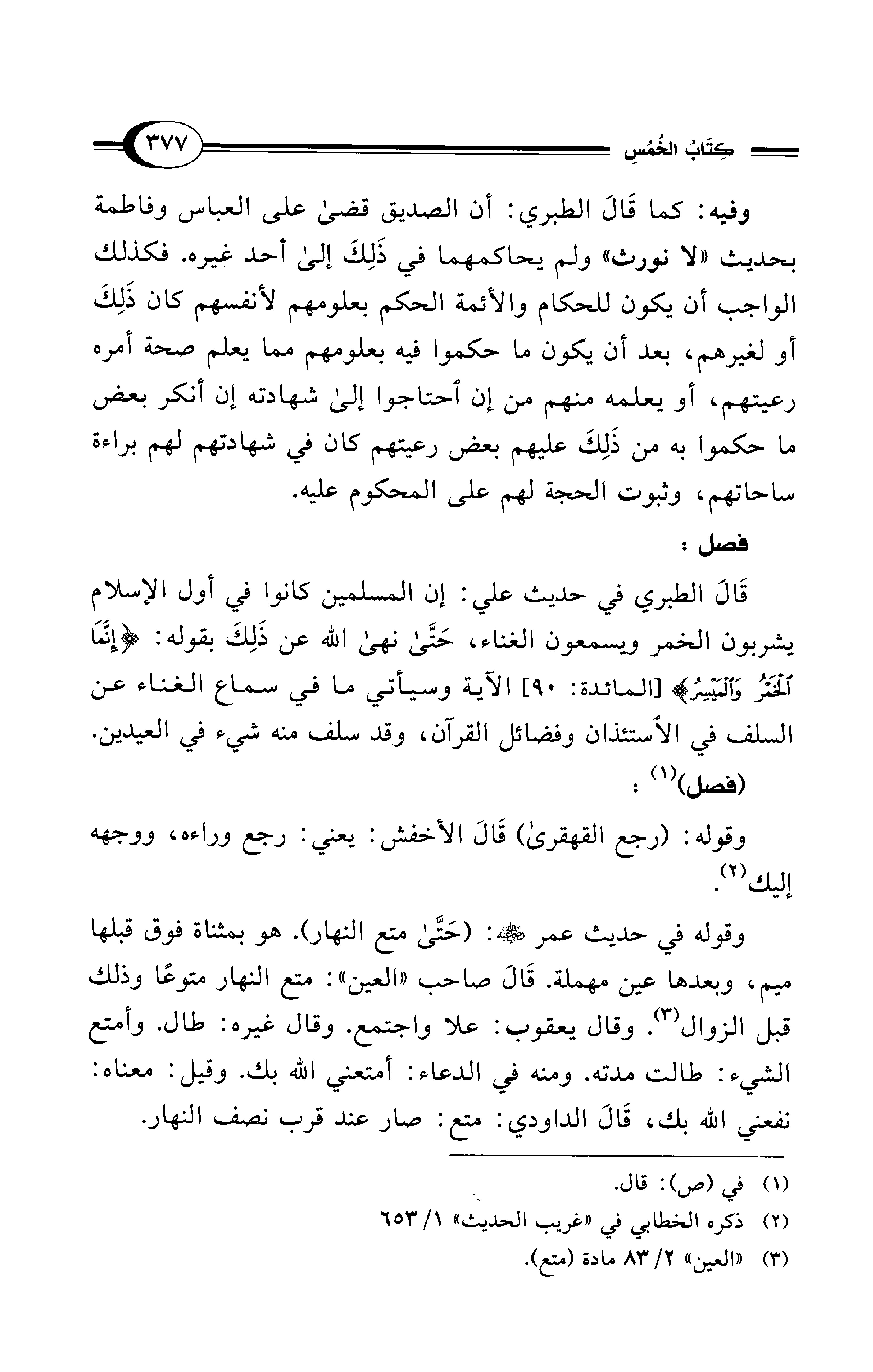 قَالَ الطبري في حديث على: إن المسلمين كانوا في أول الإسلام يشربون الخمر ويسمعون الغناء، حَتَّى نهى الله عن ذَلِكَ بقوله: {إِنَّمَا الْخَمْرُ وَالْمَيْسِرُ} [المائدة: 90] الآية وسيأتي ما في سماع الغناء عن السلف في الاستئذان وفضائل القرآن، وقد سلف منه شيء في العيدين.