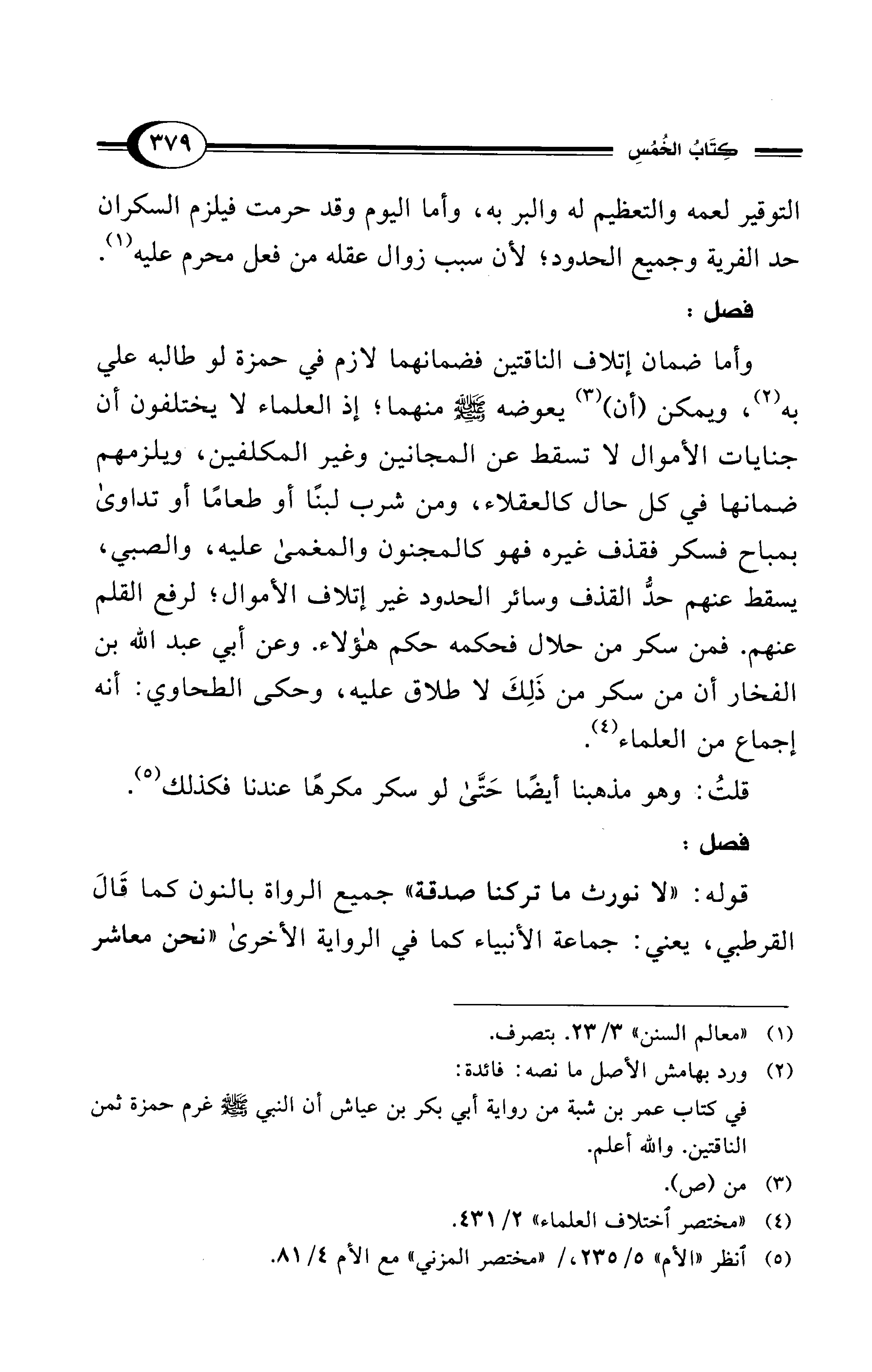 وأما ضمان إتلاف الناقتين فضمانهما لازم في حمزة لو طالبه على به (¬2)، ويمكن (أن) (¬3) يعوضه - صلى الله عليه وسلم - منهما؛ إذ العلماء لا يختلفون أن جنايات الأموال لا تسقط عن المجانين وغير المكلفين، ويلزمهم ضمانها في كل حال كالعقلاء، ومن شرب لبنًا أو طعامًا أو تداوى بمباح فسكر فقذف غيره فهو كالمجنون والمغمى عليه، والصبي، يسقط عنهم حدُّ القذف وسائر الحدود غير إتلاف الأموال؛ لرفع القلم عنهم. فمن سكر من حلال فحكمه حكم هؤلاء. وعن أبي عبد الله بن الفخار أن من سكر من ذَلِكَ لا طلاق عليه، وحكى الطحاوي: أنه إجماع من العلماء (¬4).