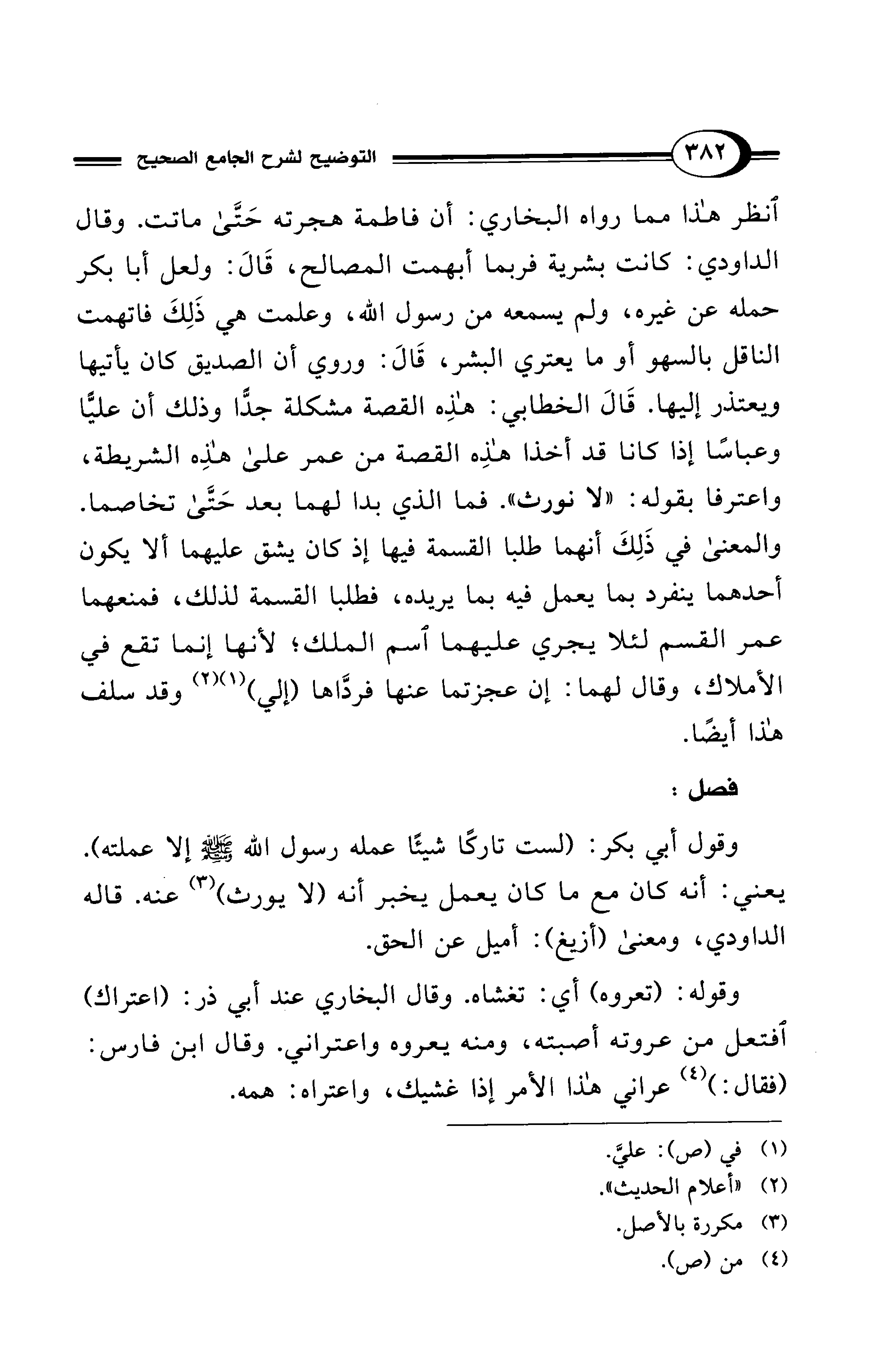 انظر هذا مما رواه البخاري: أن فاطمة هجرته حَتَّى ماتت. وقال الداودي: كانت بشرية فربما أبهمت المصالح، قَالَ: ولعل أبا بكر حمله عن غيره، ولم يسمعه من رسول الله، وعلمت هي ذَلِكَ فاتهمت الناقل بالسهو أو ما يعتري البشر، قَالَ: وروي أن الصديق كان يأتيها ويعتذر إليها. قَالَ الخطابي: هذِه القصة مشكلة جدًّا وذلك أن عليًّا وعباسًا إذا كانا قد أخذا هذِه القصة من عمر على هذِه الشريطة، واعترفا بقوله: "لا نورث". فما الذي بدا لهما بعد حَتَّى تخاصما. والمعنى في ذَلِكَ أنهما طلبا القسمة فيها إذ كان يشق عليهما ألا يكون أحدهما ينفرد مما يعمل فيه مما يريده، فطلبا القسمة لذلك، فمنعهما عمر القسم لئلا يجري عليهما اسم الملك؛ لأنها إنما تقع في الأملاك، وقال لهما: إن عجزتما عنها فردَّاها (إلي) (¬1) (¬2) وقد سلف هذا أيضًا.