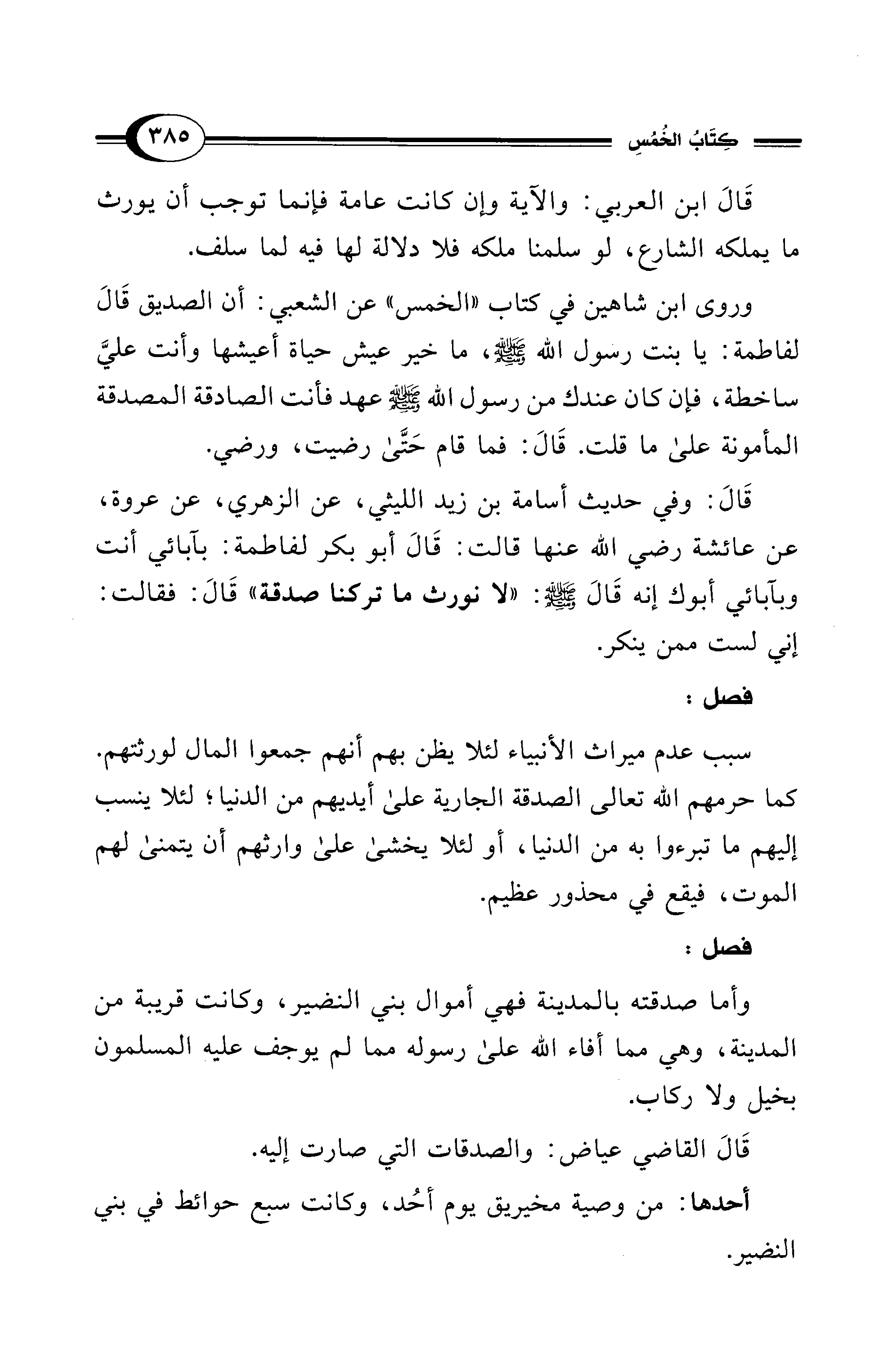 قَالَ: وفي حديث أسامة بن زيد الليثي، عن الزهري، عن عروة، عن عائشة - رضي الله عنها - قالت: قَالَ أبو بكر لفاطمة: بآبائي أنت وبآبائي أبوك إنه قَالَ - صلى الله عليه وسلم -: "لا نورث ما تركنا صدقة" قَالَ: فقالت: إني لست ممن ينكر.