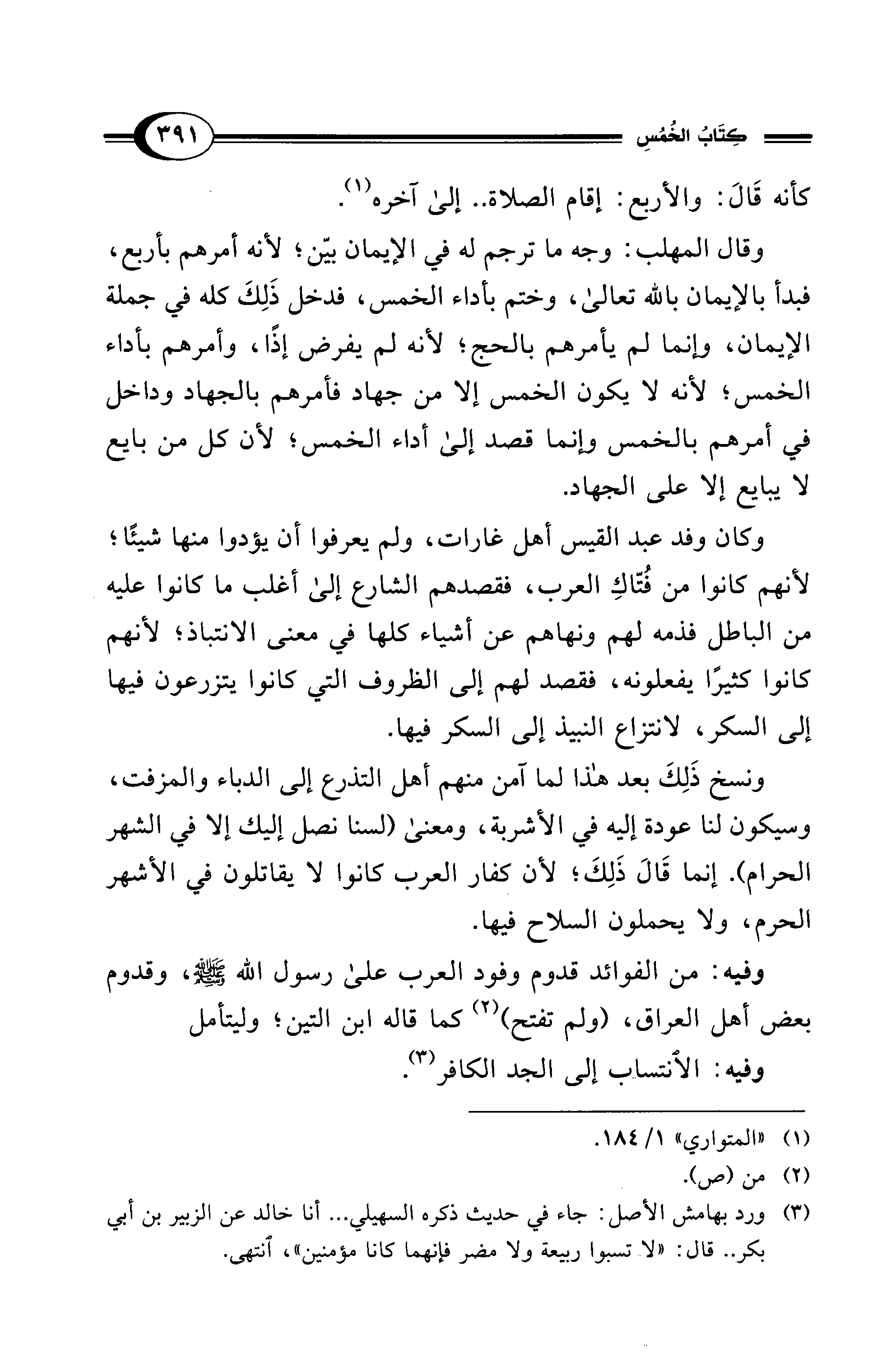 وقال المهلب: وجه ما ترجم له في الإيمان بيّن؛ لأنه أمرهم بأربع، فبدأ بالإيمان بالله تعالى، وختم بأداء الخمس، فدخل ذَلِكَ كله في جملة الإيمان, وإنما لم يأمرهم بالحج؛ لأنه لم يفرض إذًا، وأمرهم بأداء الخمس؛ لأنه لا يكون الخمس إلا من جهاد فأمرهم بالجهاد وداخل في أمرهم بالخمس وإنما قصد إلى أداء الخمس؛ لأن كل من بايع لا يبايع إلا على الجهاد.