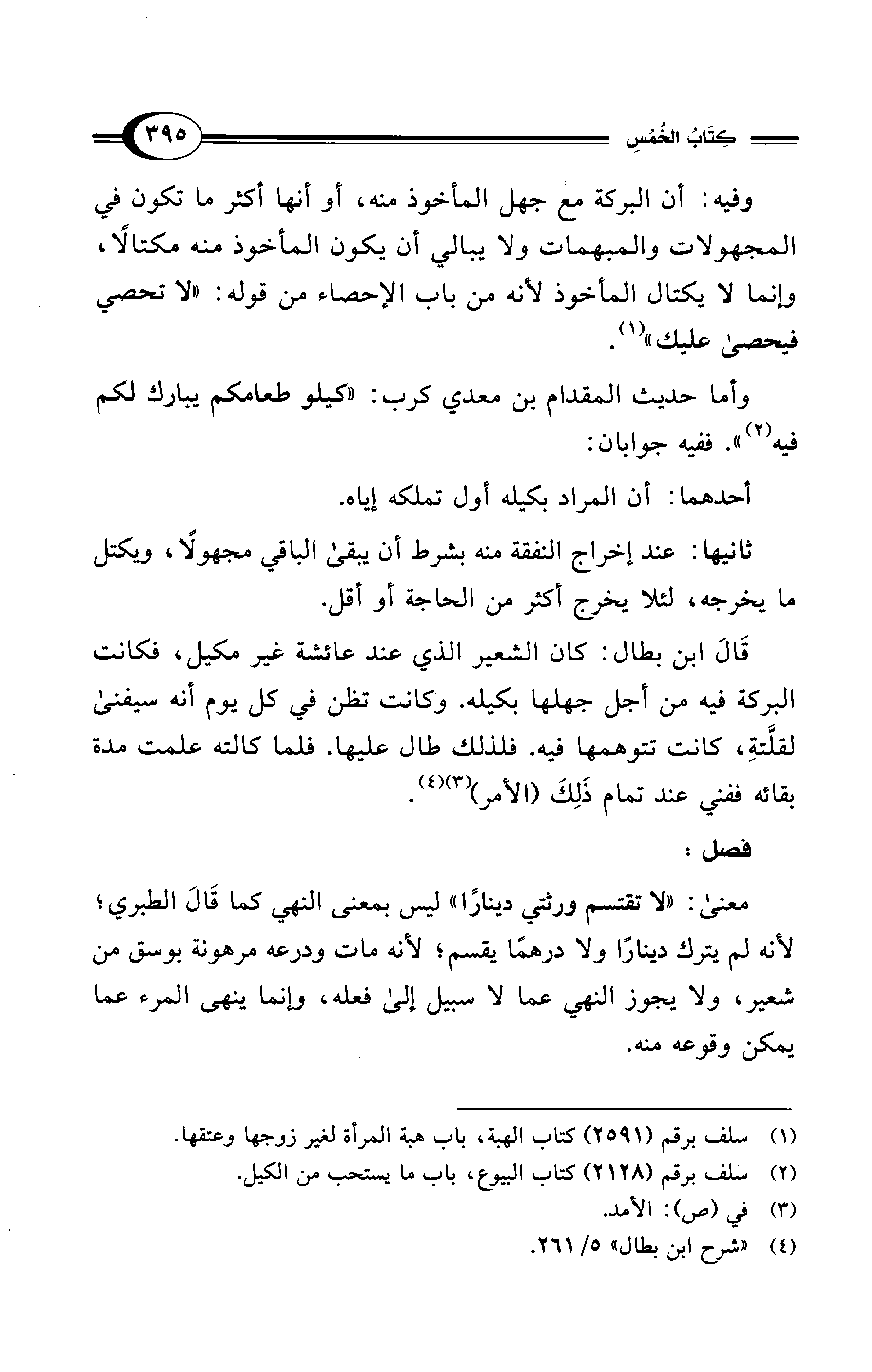 وفيه: أن البركة مع جهل المأخوذ منه، أو أنها أكثر ما تكون في المجهولات والمبهمات ولا يبالي أن يكون المأخوذ منه مكتالاً، وإنما لا يكتال المأخوذ لأنه من باب الإحصاء من قوله: "لا تحصي فيحصى عليك" (¬1).