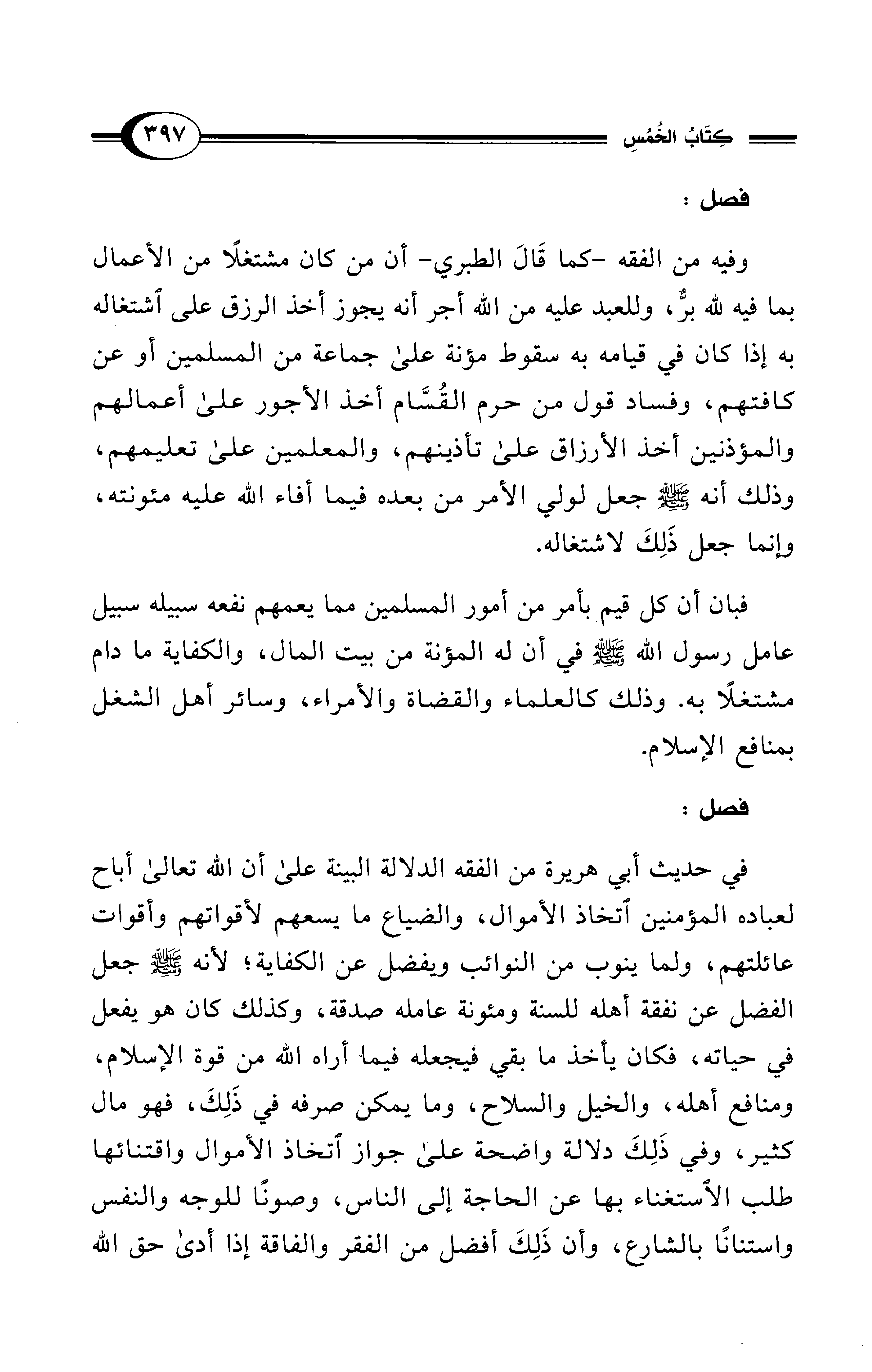 فبان أن كل قيم بأمر من أمور المسلمين مما يعمهم نفعه سبيله سبيل عامل رسول الله - صلى الله عليه وسلم - في أن له المؤنة من بيت المال، والكفاية ما دام مشتغلًا به. وذلك كالعلماء والقضاة والأمراء، وسائر أهل الشغل بمنافع الإسلام.
