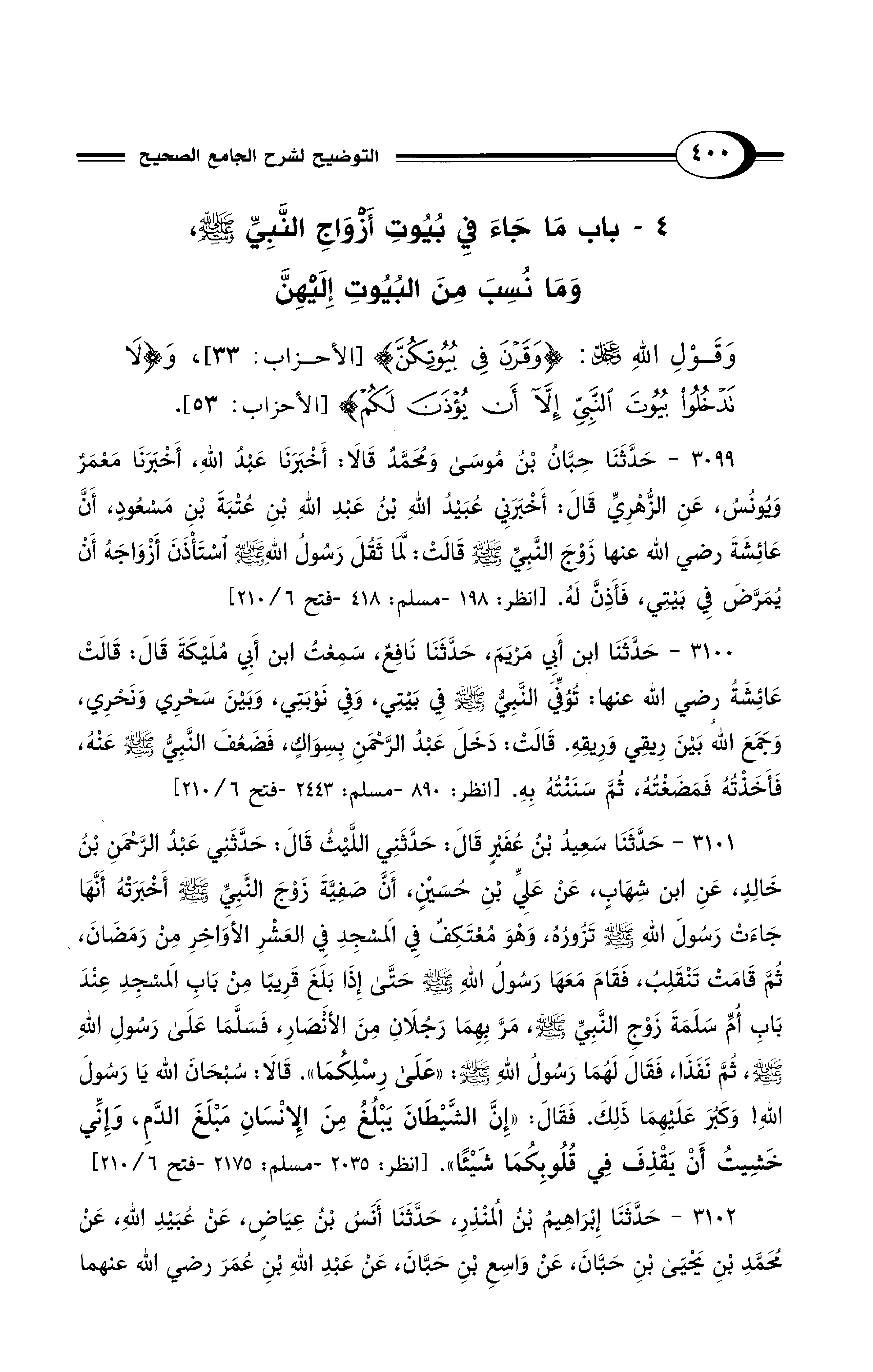 وَقَوْلِ اللهِ -عَزَّ وَجَلَّ-: {وَقَرْنَ فِي بُيُوتِكُنَّ} [الأحزاب: 33]، وَ {لَا تَدْخُلُوا بُيُوتَ النَّبِيِّ إِلَّا أَنْ يُؤْذَنَ لَكُمْ} [الأحزاب: 53].