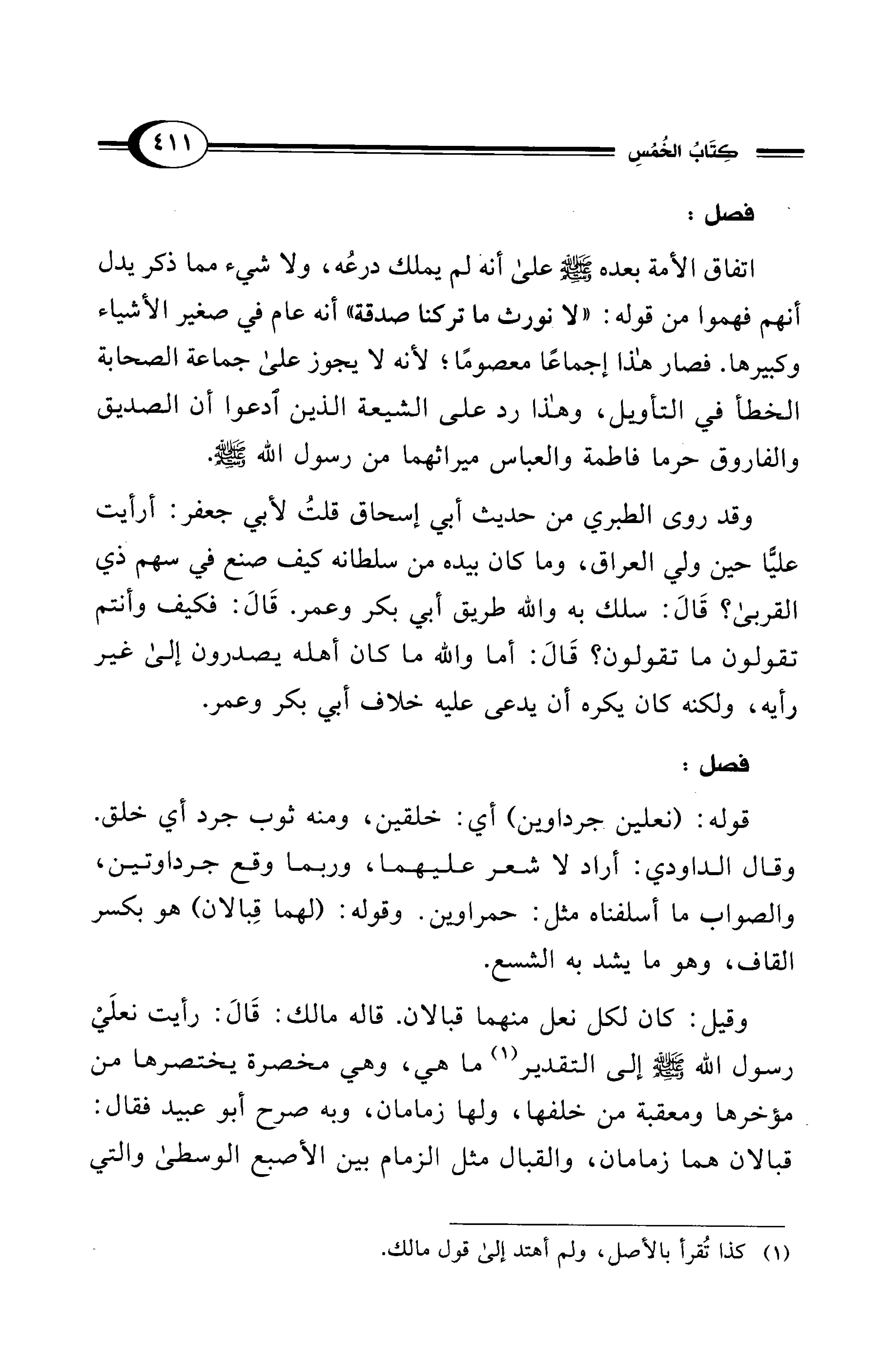 وقد روى الطبري من حديث أبي إسحاق قلتُ لأبي جعفر: أرأيت عليًّا حين ولي العراق، وما كان بيده من سلطانه كيف صنع في سهم ذي القربى؟ قَالَ: سلك به والله طريق أبي بكر وعمر. قَالَ: فكيف وأنتم تقولون ما تقولون؟ قَالَ: أما والله ما كان أهله يصدرون إلى غير رأيه، ولكنه كان يكره أن يدعى عليه خلاف أبي بكر وعمر.