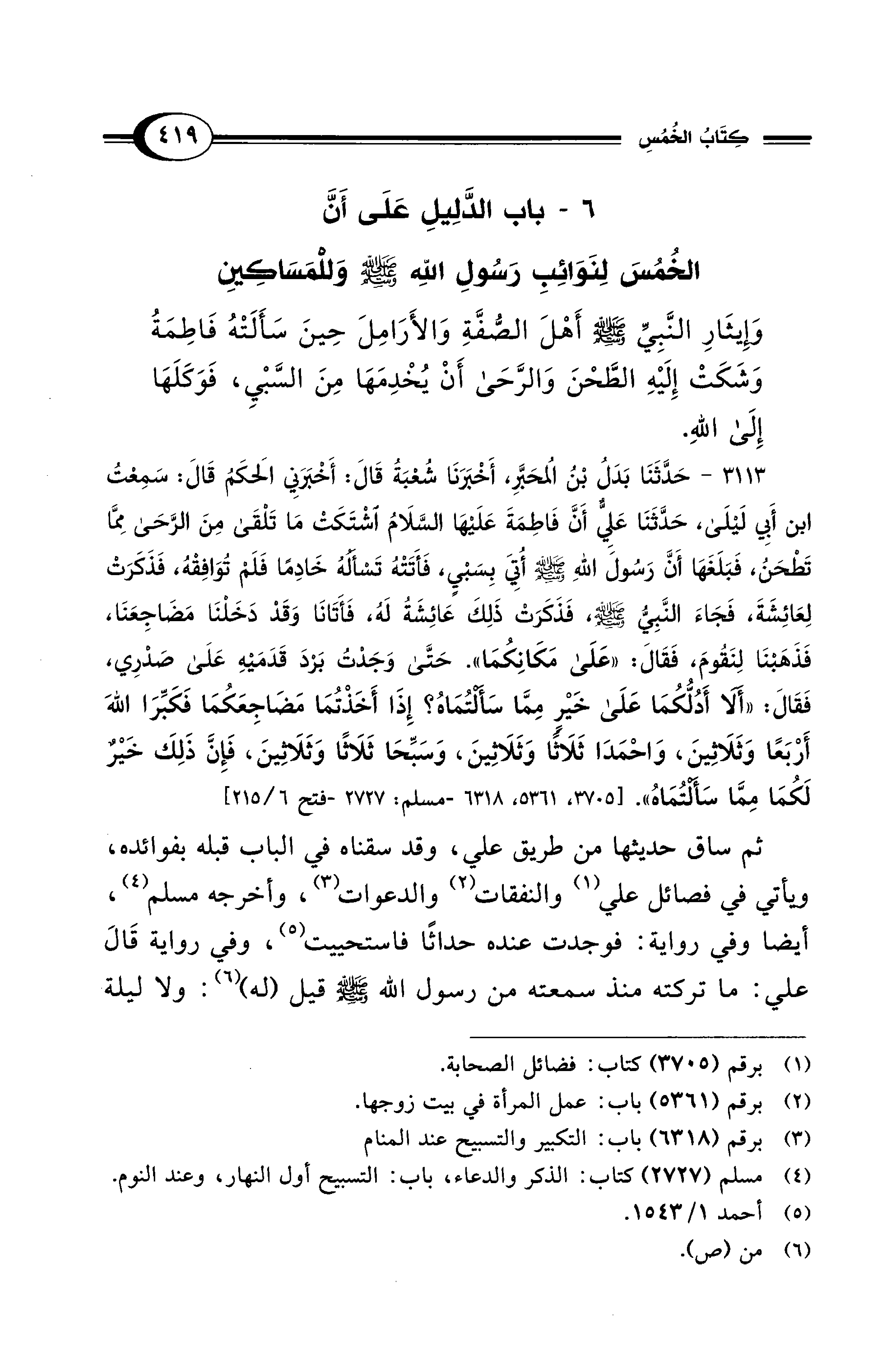 6 - باب الدَّلِيلِ عَلَى أَنَّ الخُمُسَ لِنَوَائِبِ رَسُولِ الله - صلى الله عليه وسلم - وَللْمَسَاكِيِن