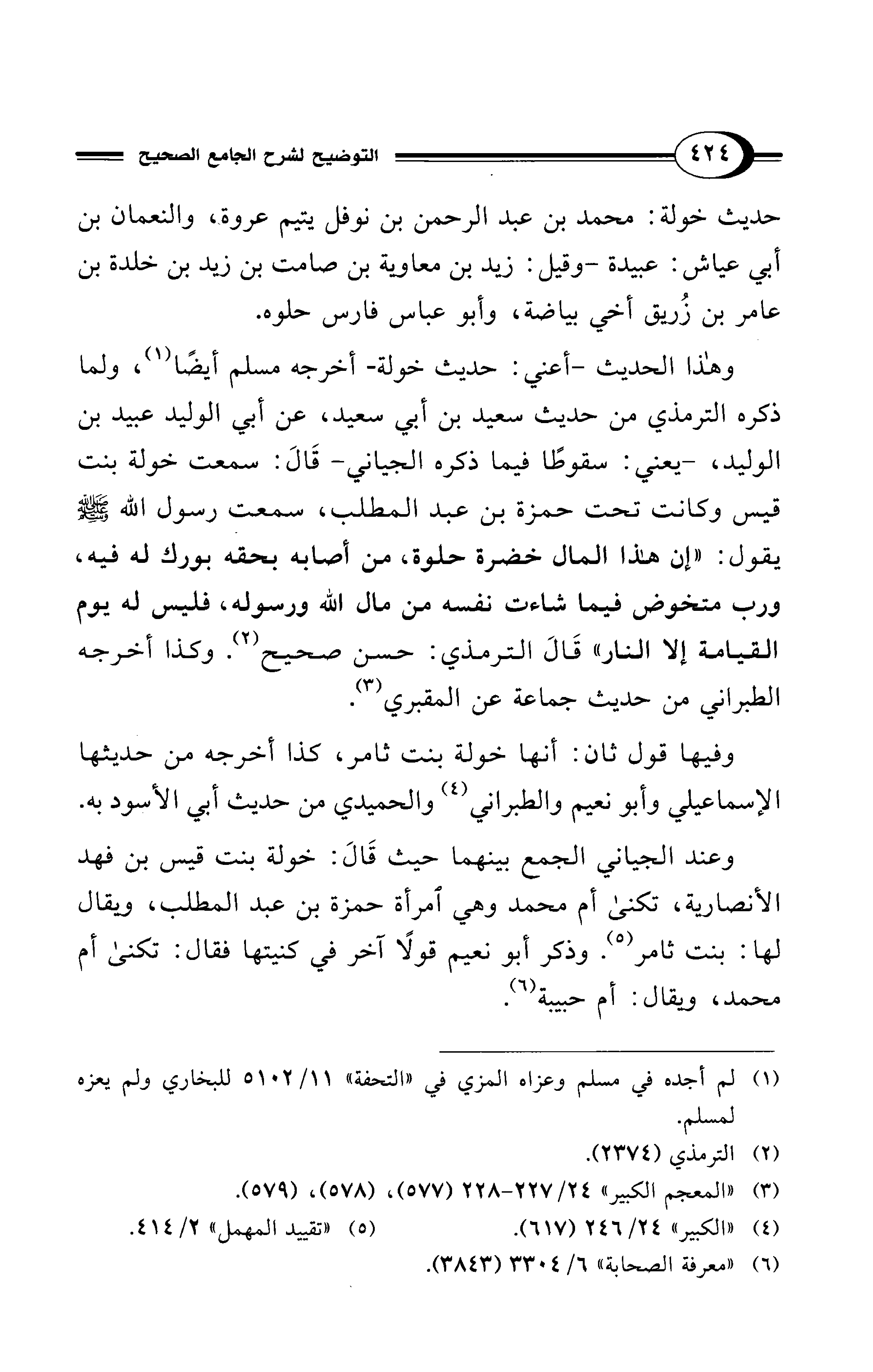 وهذا الحديث -أعني: حديث خولة- أخرجه مسلم أيضًا (¬1)، ولما ذكره الترمذي من حديث سعيد بن أبي سعيد، عن أبي الوليد عبيد بن الوليد، -يعني: سقوطًا فيما ذكره الجياني- قَالَ: سمعت خولة بنت قيس وكانت تحت حمزة بن عبد المطلب، سمعت رسول الله - صلى الله عليه وسلم - يقول: "إن هذا المال خضرة حلوة، من أصابه بحقه بورك له فيه، ورب متخوض فيما شاءت نفسه من مال الله ورسوله، فليس له يوم القيامة إلا النار" قَالَ الترمذي: حسن صحيح (¬2). وكذا أخرجه الطبراني من حديث جماعة عن المقبري (¬3).