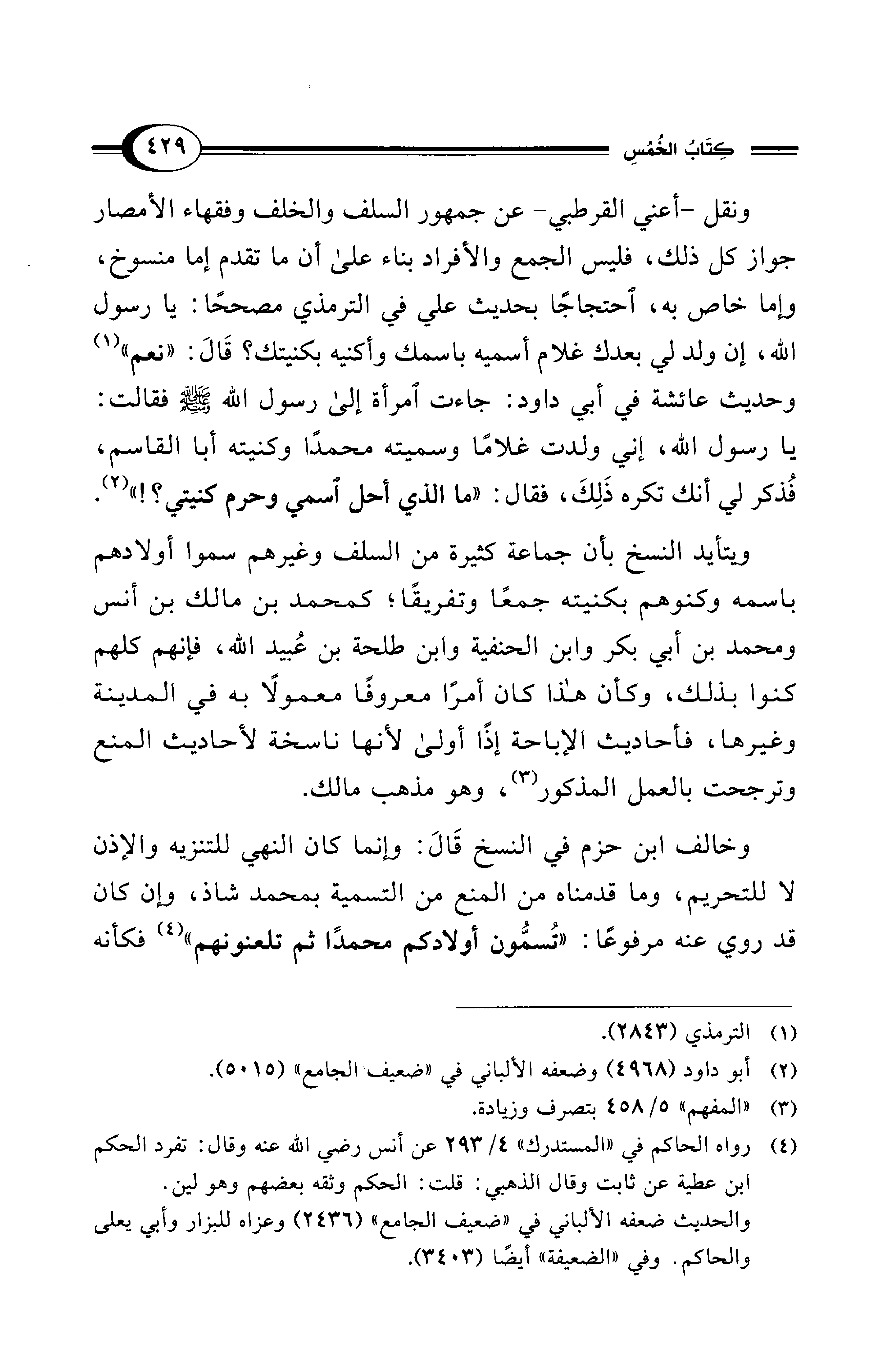 ويتأيد النسخ بأن جماعة كثيرة من السلف وغيرهم سموا أولادهم باسمه وكنوهم بكنيته جمعًا وتفريقًا؛ كمحمد بن مالك بن أنس ومحمد بن أبي بكر وابن الحنفية وابن طلحة بن عُبيد الله، فإنهم كلهم كنوا بذلك، وكأن هذا كان أمرًا معروفًا معمولًا به في المدينة وغيرها، فأحاديث الإباحة إذًا أولى لأنها ناسخة لأحاديث المنع وترجحت بالعمل المذكور (¬3)، وهو مذهب مالك.