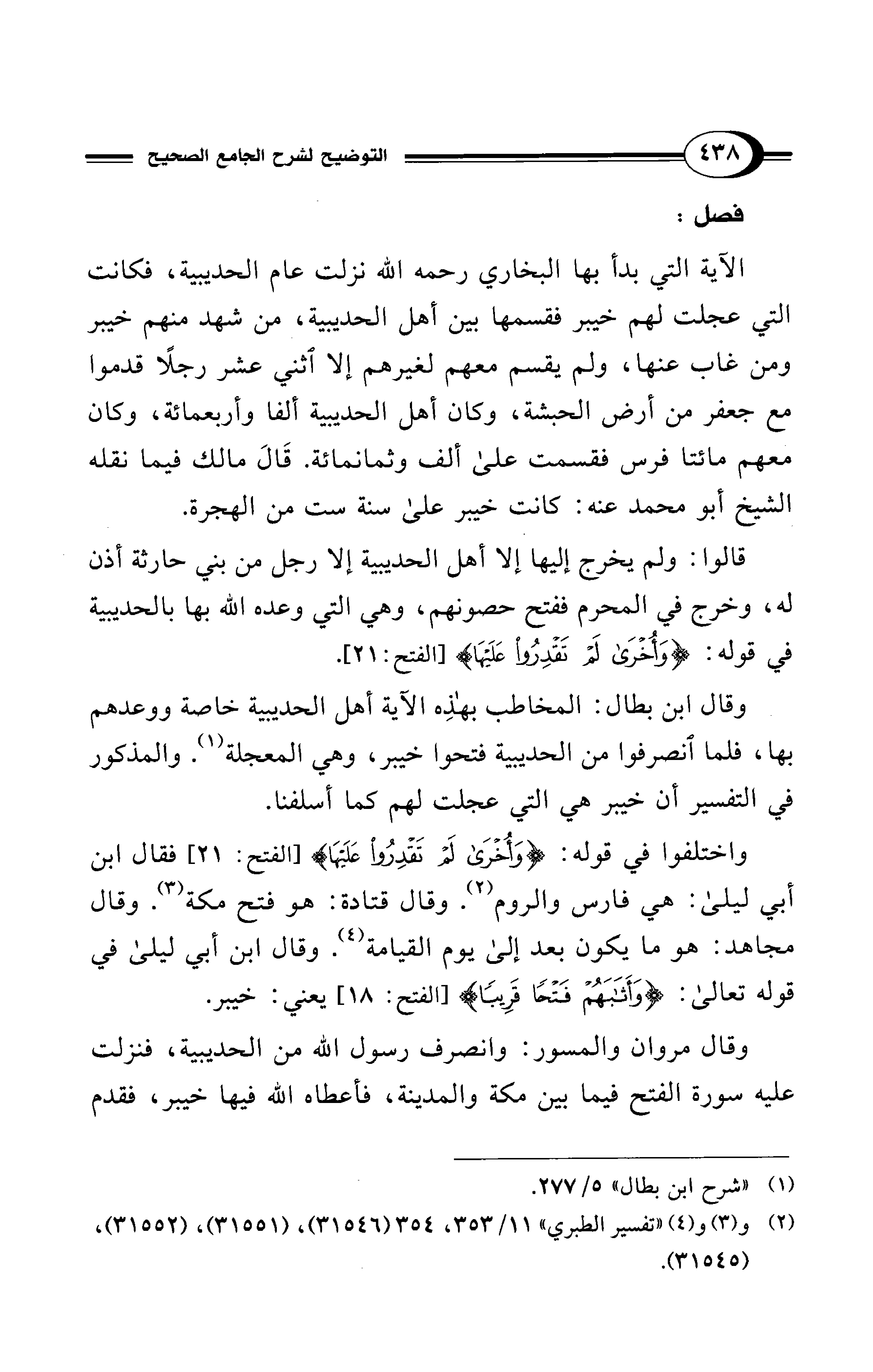 الآية التي بدأ بها البخاري -رحمه الله- نزلت عام الحديبية، فكانت التي عجلت لهم خيبر فقسمها بين أهل الحديبية، من شهد منهم خيبر ومن غاب عنها, ولم يقسم معهم لغيرهم إلا اثني عشر رجلاً قدموا مع جعفر من أرض الحبشة، وكان أهل الحديبية ألفا وأربعمائة، وكان معهم مائتا فرس فقسمت على ألف وثمانمائة. قَالَ مالك فيما نقله الشيخ أبو محمد عنه: كانت خيبر على سنة ست من الهجرة.