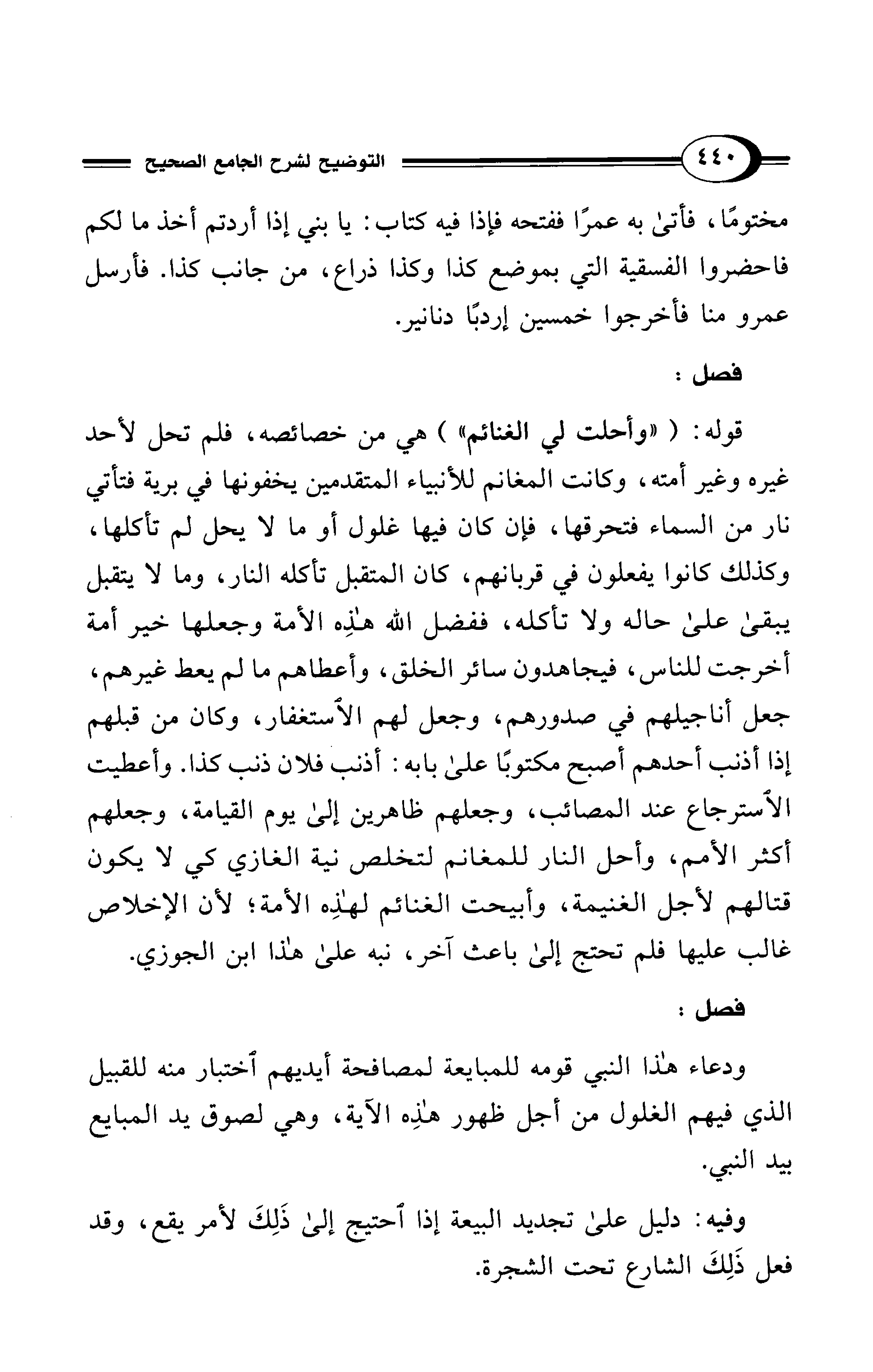 قوله: ("وأحلت لي الغنائم") هي من خصائصه، فلم تحل لأحد غيره وغير أمته، وكانت المغانم للأنبياء المتقدمين يخفونها في برية فتأتي نار من السماء فتحرقها، فإن كان فيها غلول أو ما لا يحل لم تأكلها، وكذلك كانوا يفعلون في قربانهم، كان المتقبل تأكله النار، وما لا يتقبل يبقى على حاله ولا تأكله، ففضل الله هذِه الأمة وجعلها خير أمة أخرجت للناس، فيجاهدون سائر الخلق، وأعطاهم ما لم يعط غيرهم، جعل أناجيلهم في صدورهم، وجعل لهم الاستغفار، وكان من قبلهم إذا أذنب أحدهم أصبح مكتوبًا على بابه: أذنب فلان ذنب كذا. وأعطيت الاسترجاع عند المصائب، وجعلهم ظاهرين إلى يوم القيامة، وجعلهم أكثر الأمم، وأحل النار للمغانم لتخلص نية المغازي كي لا يكون قتالهم لأجل الغنيمة، وأبيحت الغنائم لهذِه الأمة؛ لأن الإخلاص غالب عليها فلم تحتج إلى باعث آخر، نبه على هذا ابن الجوزي.