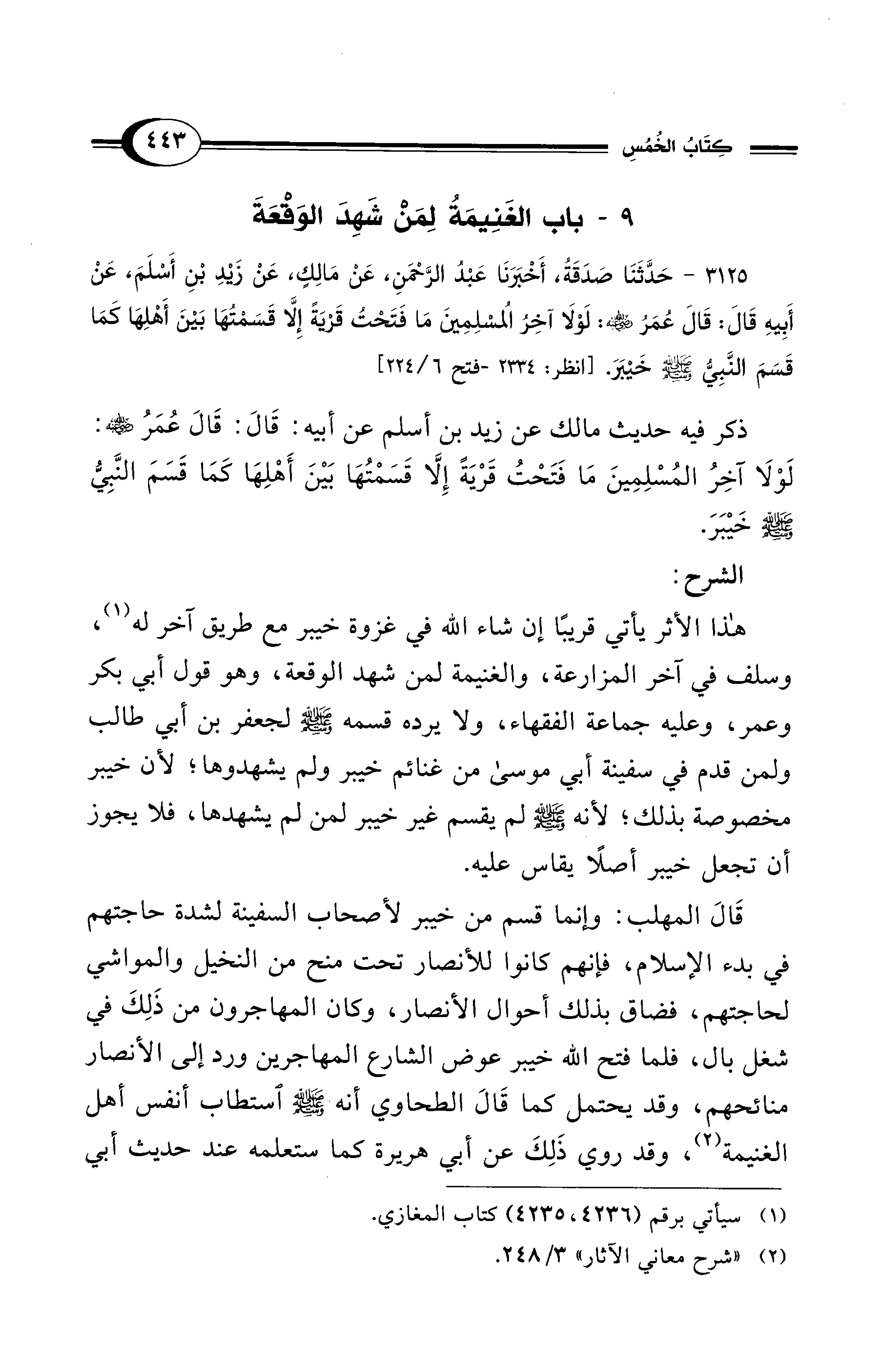 هذا الأثر يأتي قريبًا إن شاء الله في غزوة خيبر مع طريق آخر له (¬1)، وسلف في آخر المزارعة، والغنيمة لمن شهد الوقعة، وهو قول أبي بكر وعمر، وعليه جماعة الفقهاء، ولا يرده قسمه - صلى الله عليه وسلم - لجعفر بن أبي طالب ولمن قدم في سفينة أبي موسى من غنائم خيبر ولم يشهدوها؛ لأن خيبر مخصوصة بذلك؛ لأنه - صلى الله عليه وسلم - لم يقسم غير خيبر لمن لم يشهدها، فلا يجوز أن تجعل خيبر أصلاً يقاس عليه.