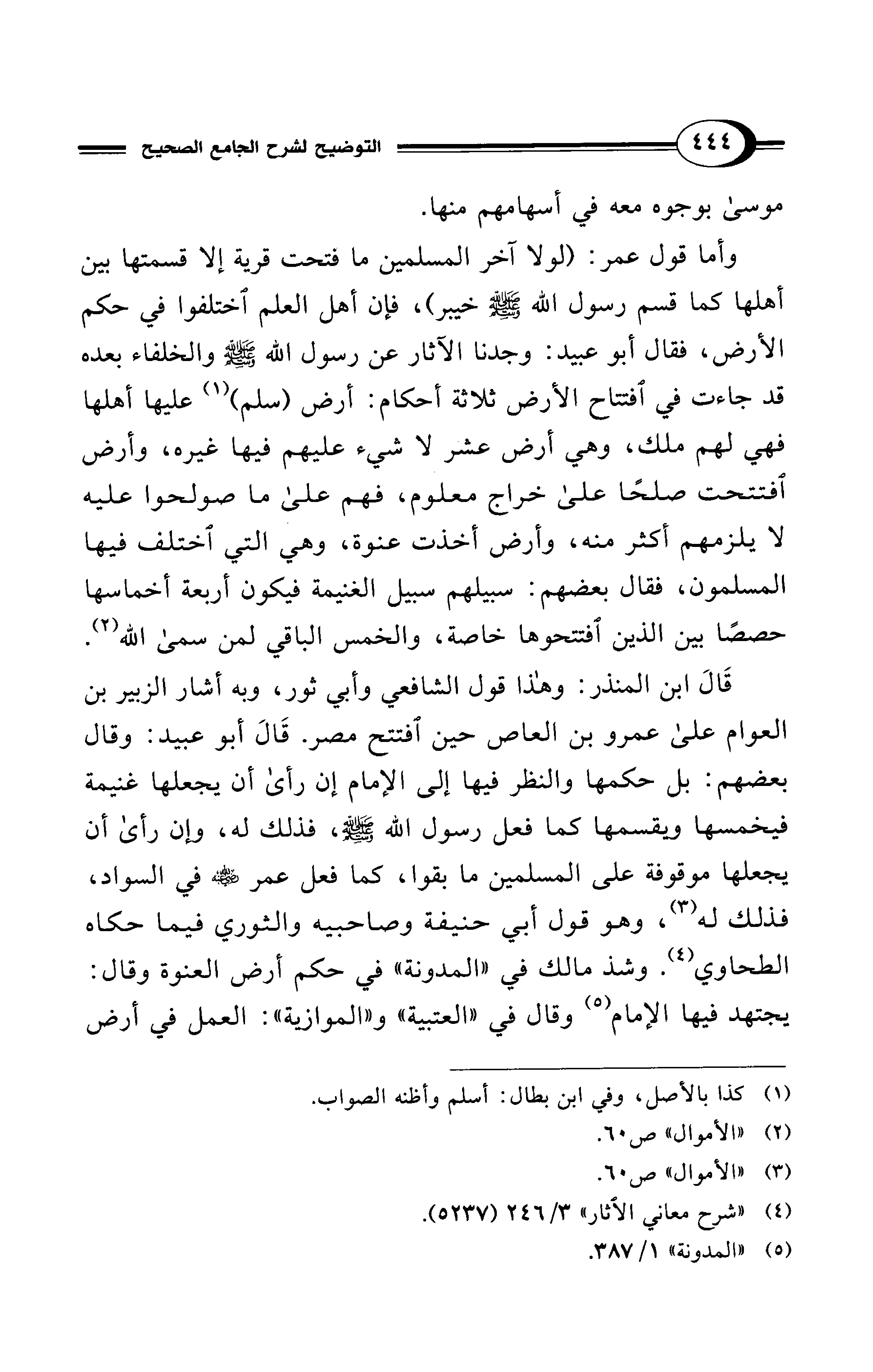 وأما قول عمر: (لولا آخر المسلمين ما فتحت قرية إلا قسمتها بين أهلها كما قسم رسول الله - صلى الله عليه وسلم - خيبر)، فإن أهل العلم اختلفوا في حكم الأرض، فقال أبو عبيد: وجدنا الآثار عن رسول الله - صلى الله عليه وسلم - والخلفاء بعده قد جاءت في افتتاح الأرض ثلاثة أحكام: أرض (سلم) (¬1) عليها أهلها فهي لهم ملك، وهي أرض عشر لا شيء عليهم فيها غيره، وأرض افتتحت صلحًا على خراج معلوم، فهم على ما صولحوا عليه لا يلزمهم أكثر منه، وأرض أخذت عنوة، وهي التي اختلف فيها المسلمون، فقال بعضهم: سبيلهم سبيل الغنيمة فيكون أربعة أخماسها حصصًا بين الذين افتتحوها خاصة، والخمس الباقي لمن سمى الله (¬2).